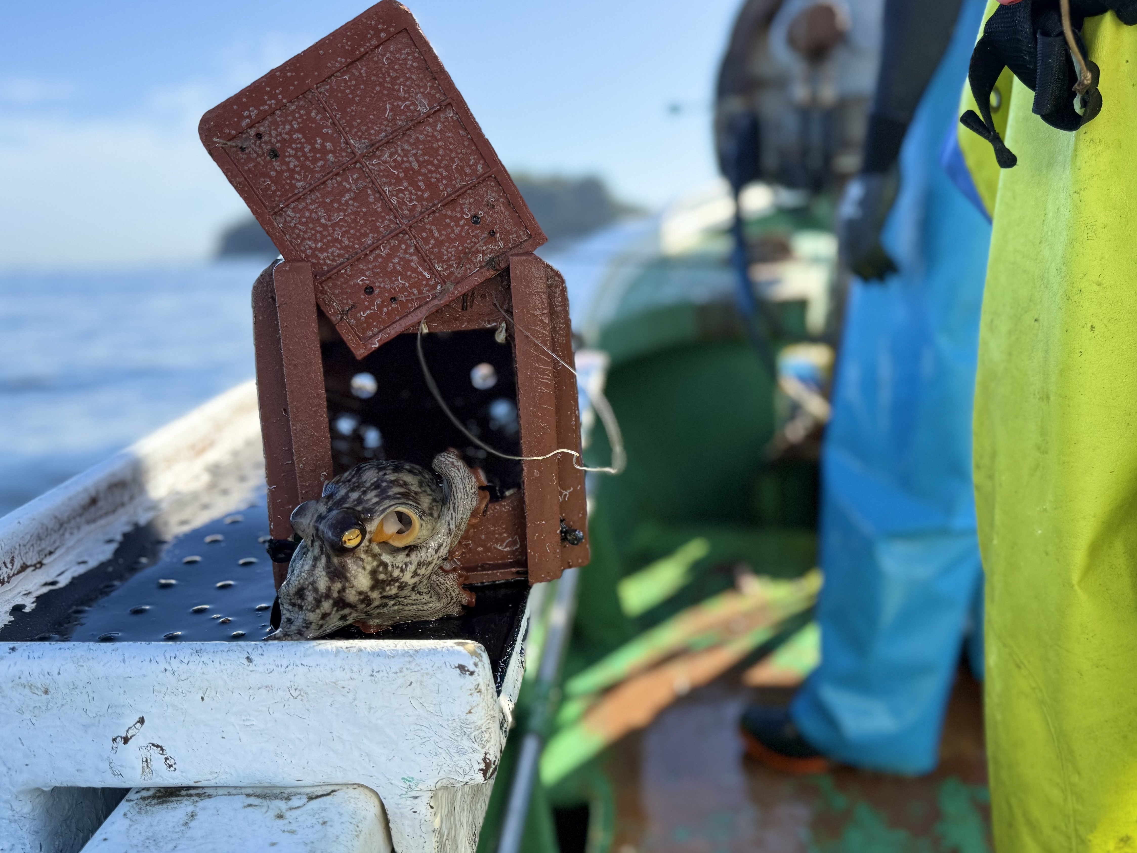 たこ壺が海面から上がってくると、好郁さんが「ぐいっ」と上げて中を確認します。この瞬間が、漁師にとって最もドキドキする時です。