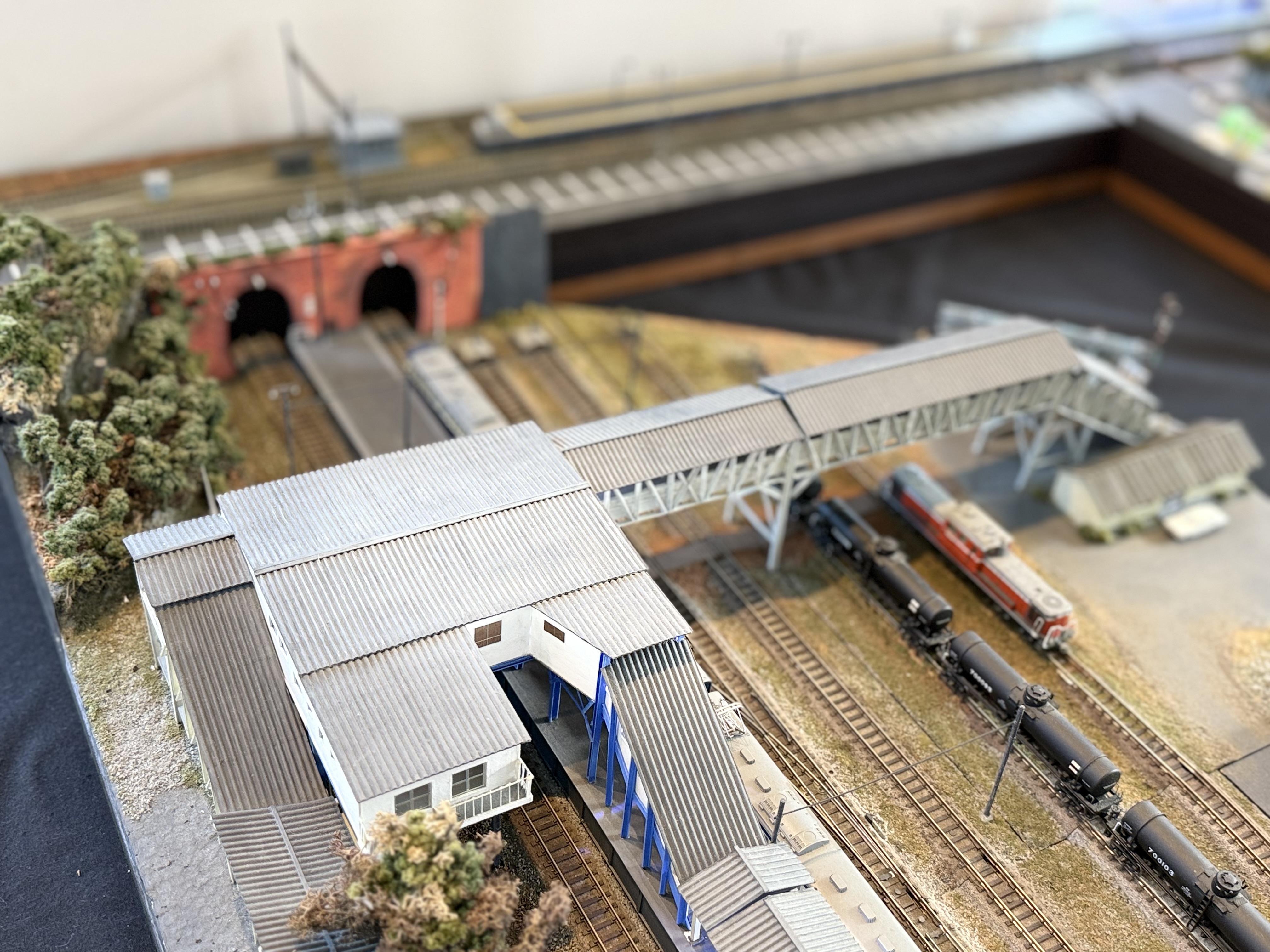 広がる風景を形作るのは、その多くが「紙」から作られた建物(ストラクチャー)たちです。既製品に頼らず、一から素材を切り出して作る「フルスクラッチ」の手法が取られています。これらは材料費こそ抑えられますが、気の遠くなるような手間と時間が注ぎ込まれていて、完成品にはない独特の温もりとリアリティを放っています。