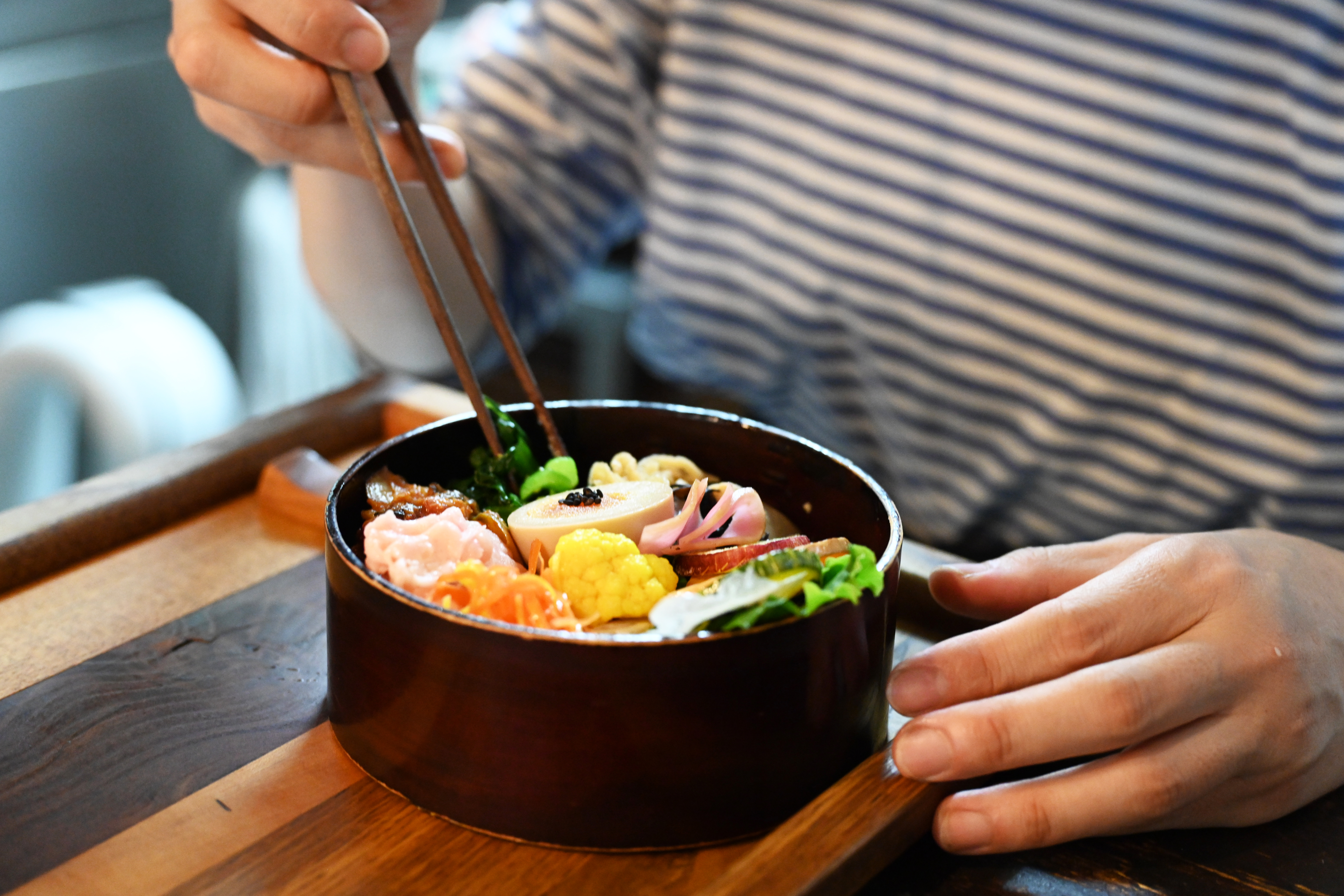 丸いわっぱの中には、黒米入り玄米ごはんの上に季節野菜や海藻のデリ、グリル野菜など約10種類のおかずがぎっしり。なかでも、ビーツで色付けしたポテトサラダはファンが多い定番おかずのひとつ。根菜たっぷりの塩麹のスープと、副菜に醤油麹ディップ添えの茹で野菜と生野菜が付く、一食で数十種類の野菜を味わえるヘルシーな内容に。