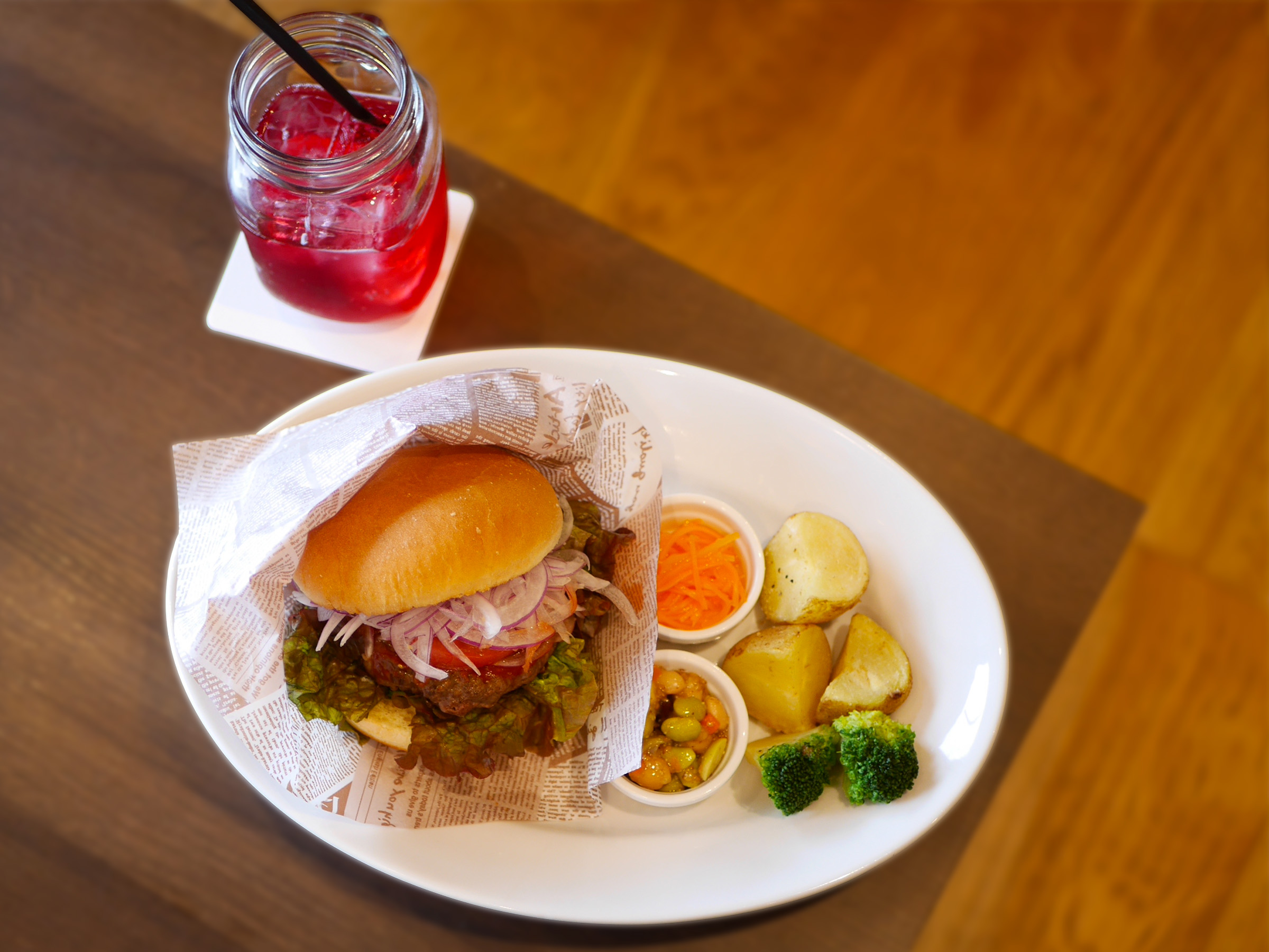 お勧めドリンクの「美酢ソーダ」は、果実発酵酢の爽やかな酸味がバーガーの余韻を引き立てます。ビタミンはもちろん食物繊維や乳酸菌も摂れ、栄養バランスも相性抜群です。