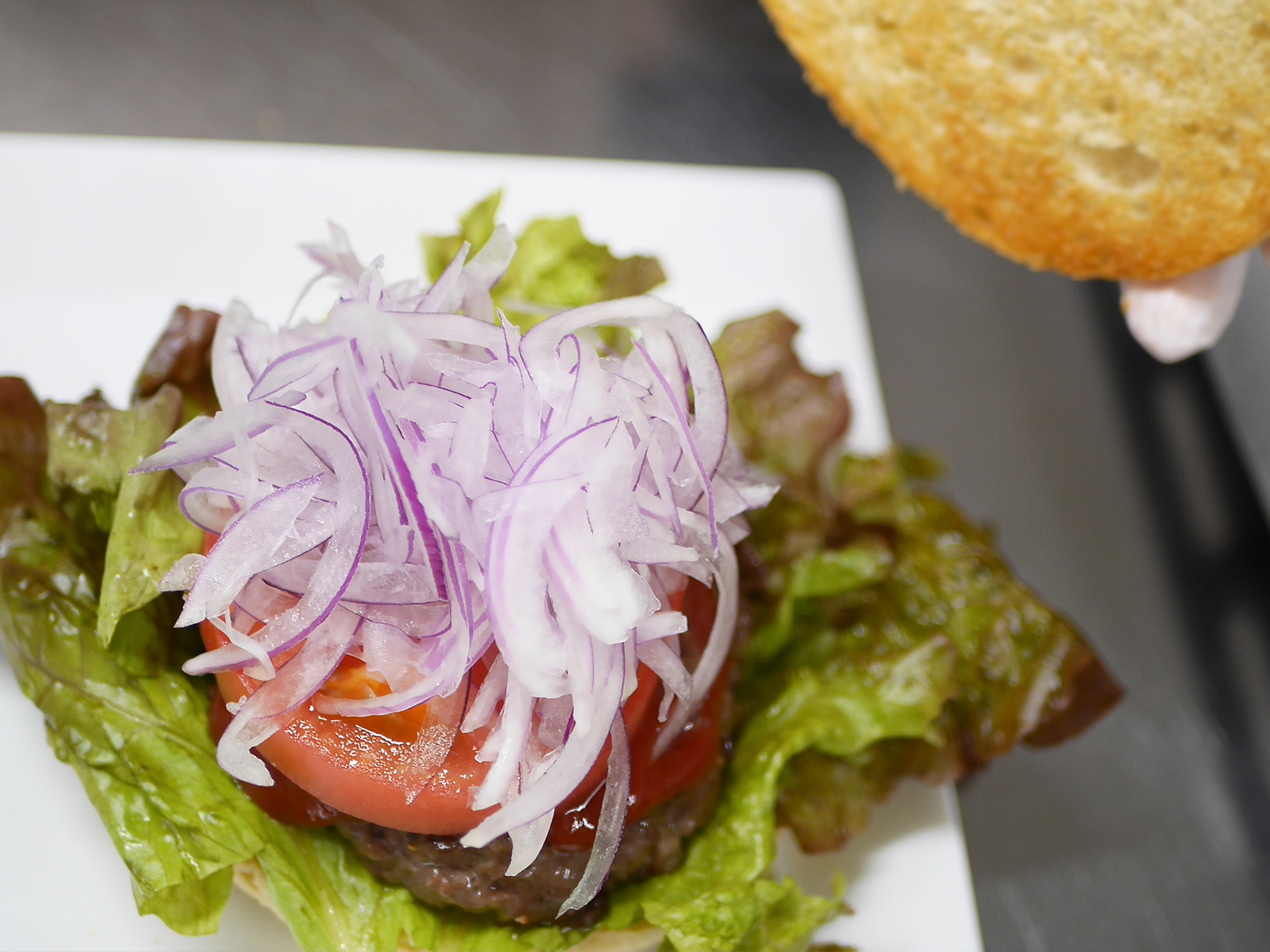 こだわったのは、食べるときは大きな口を開けて、パティの弾力ある食感を噛みしめられること。ふわっと軽いバンズや具材の切り方にも工夫を凝らし、年配の方や女性でも噛み切りやすく咀嚼を促す構成。「パティは、噛むほどに肉の旨みを感じられます。スタッフと何度も試作し、追求したんです」とチーフの石川さんは笑顔で話します。