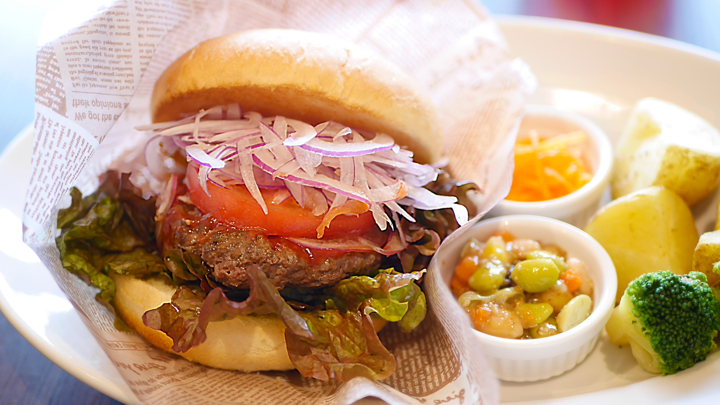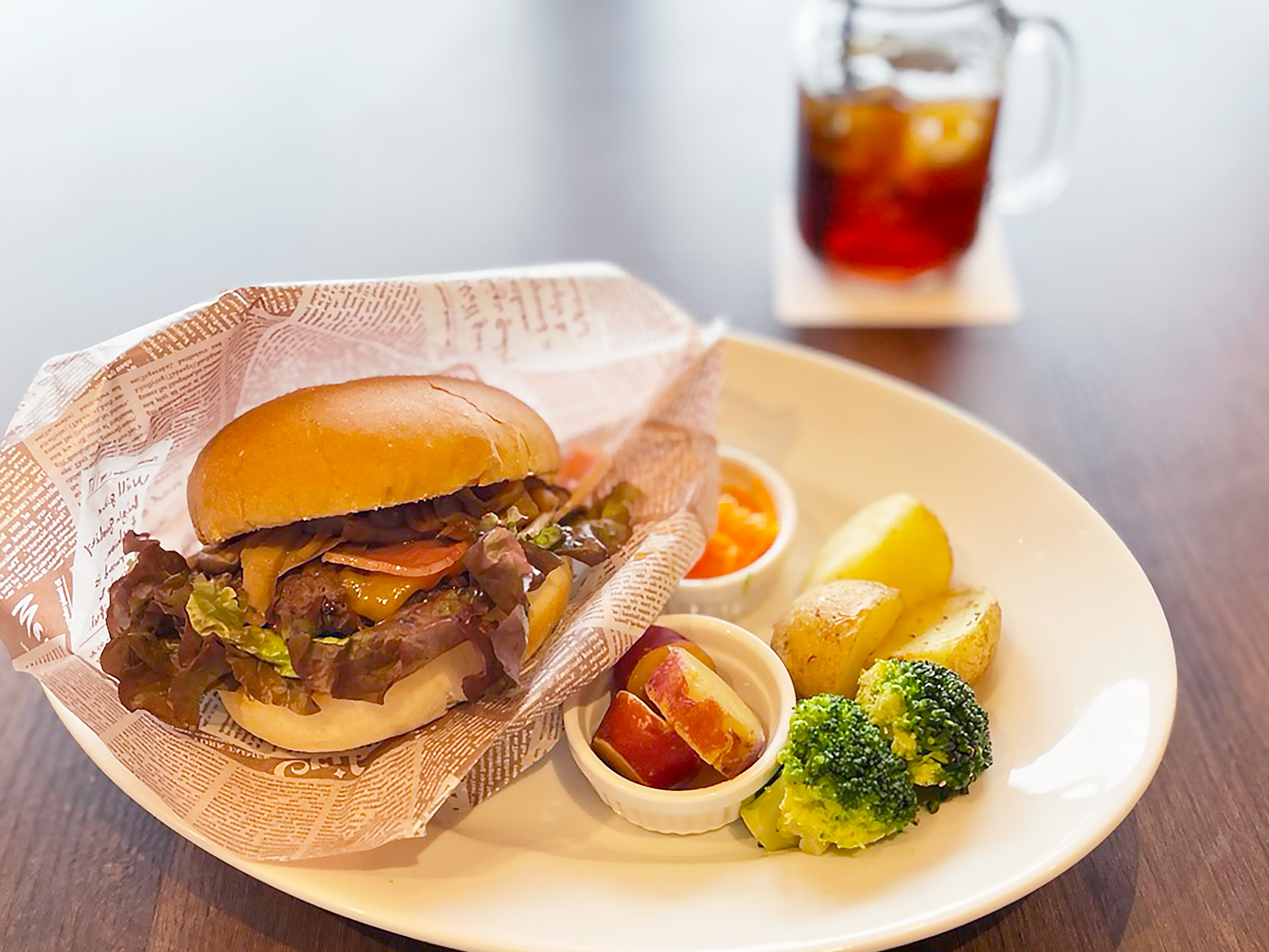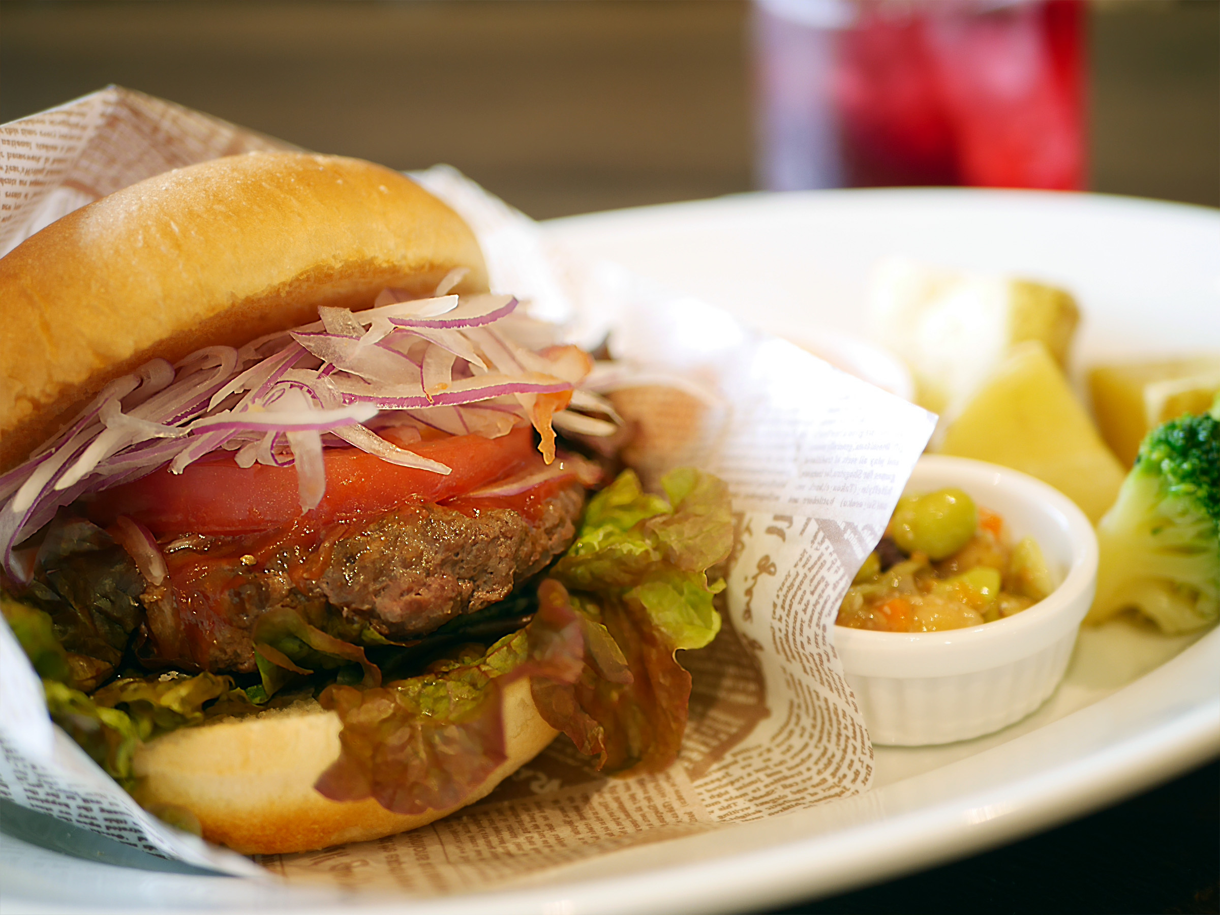 香ばしいバンズ、トマトやレタスの瑞々しさ、オニオンスライスのシャキッとした歯ざわり——。すべての具材が絶妙に調和し、口の中でハーモニーを奏でます。見た目のボリュームに反して軽やかで、最後のひと口まで飽きずに楽しめる奥深い味わいです。