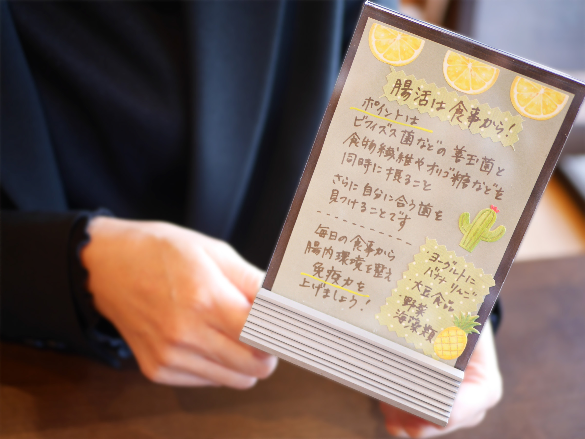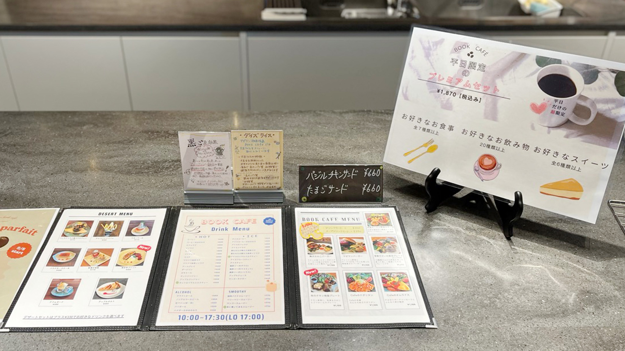テーブルには、メニューの栄養情報や噛むことの大切さを伝えるスタッフ自作カードの設置など、石川さんたちの「Book cafeを通して健康やコミュニケーションの楽しさを伝えたい」という想いが、細部に息づいています。
