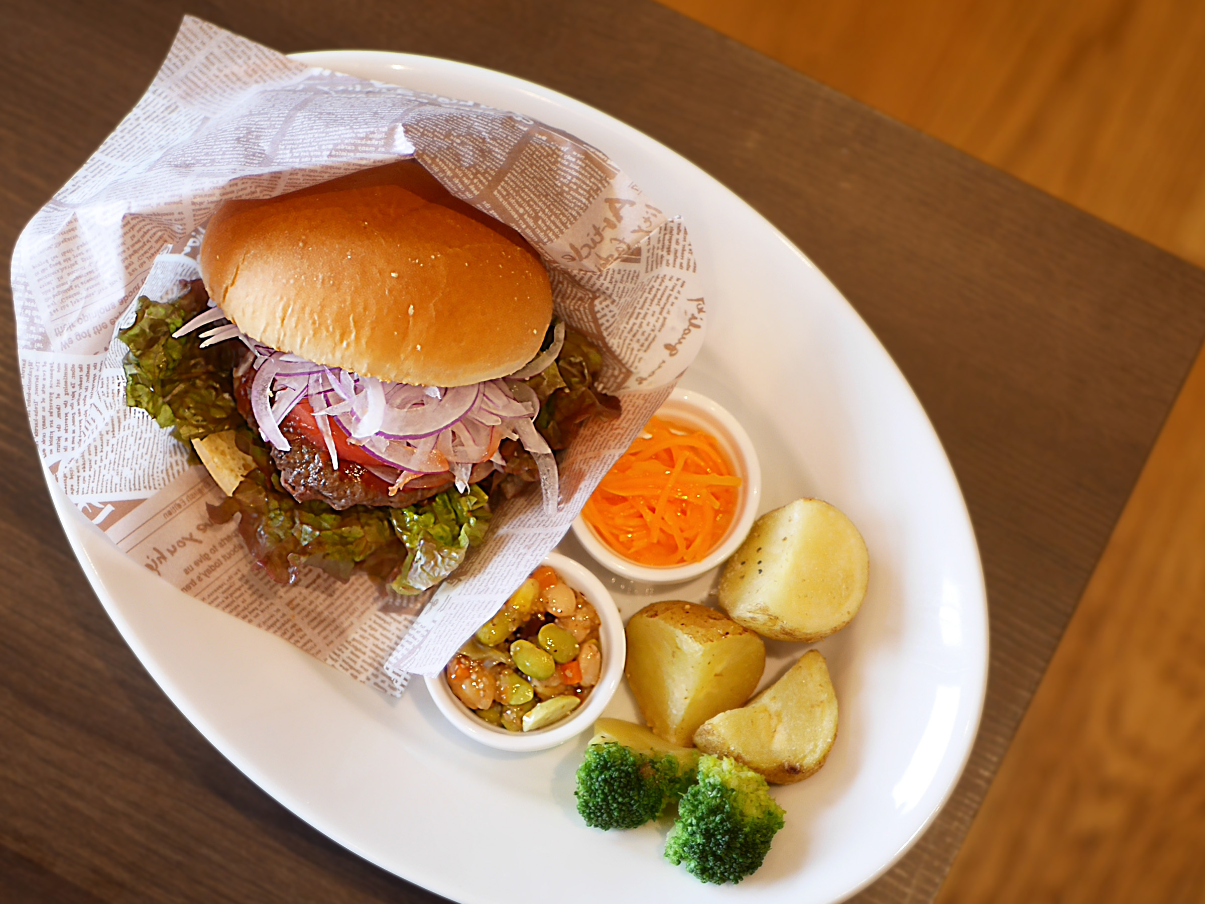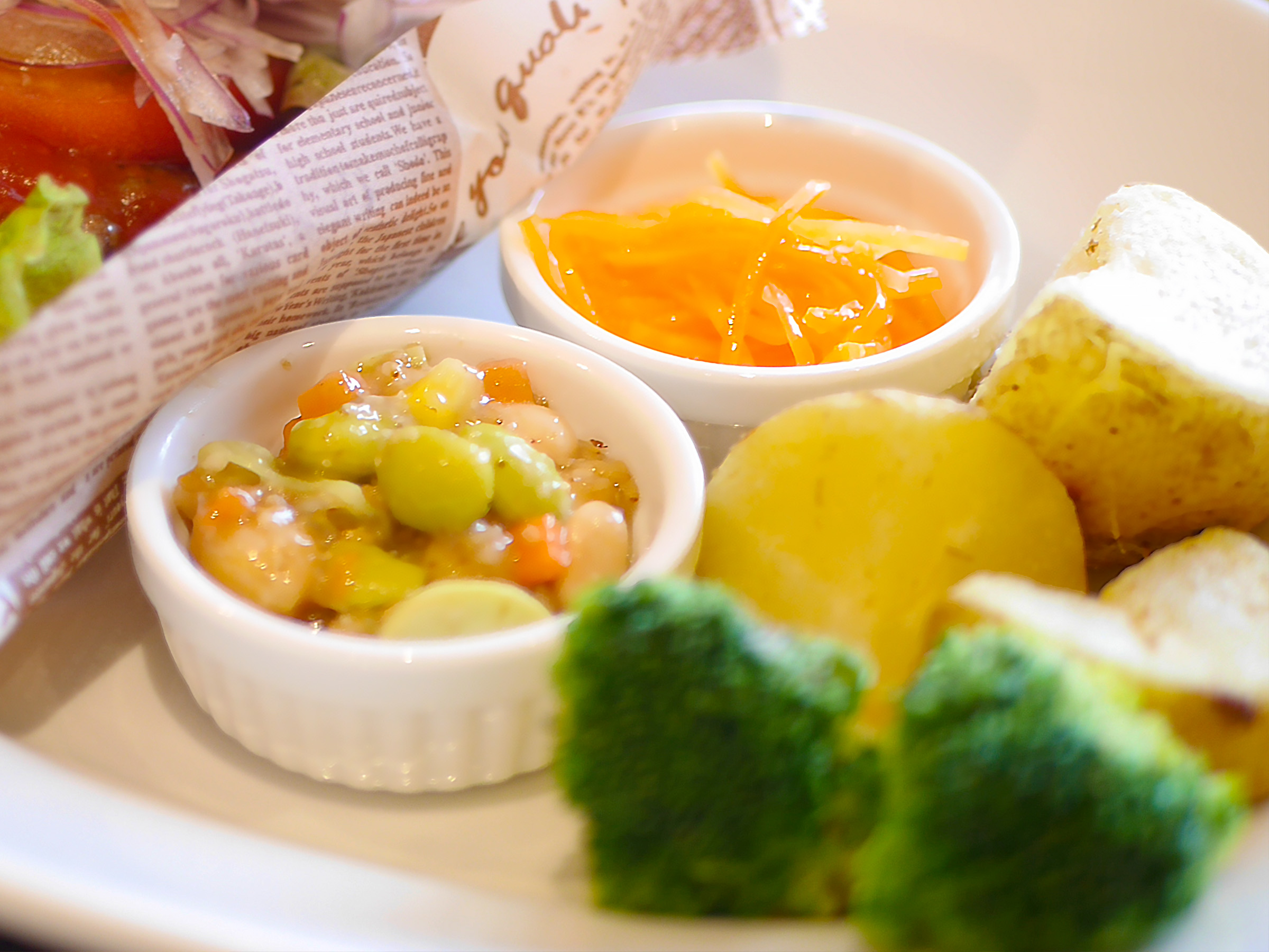 付け合わせの皮付きじゃがいもはノンフライで仕上げ、芋の自然な甘みと香りが広がります。大ぶりのブロッコリーや豆の胡麻和えなど、野菜をたっぷり摂れる点も評判です。
