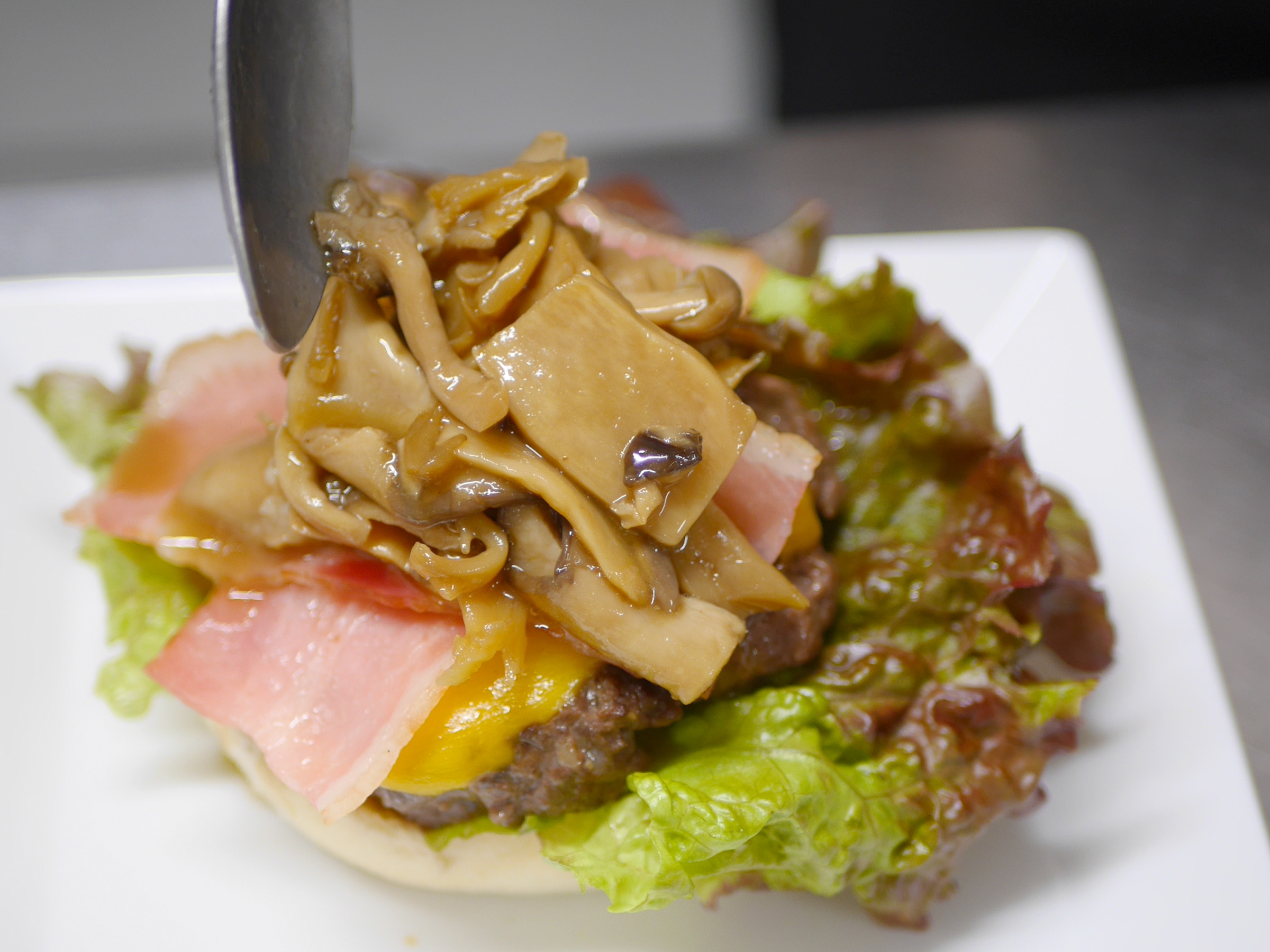 しめじや平茸など4種のきのこにベーコン、チェダーチーズ、自家製パティを重ね、醤油やワインをベースにしたポルチーニソースとバターのコクで仕上げます。食物繊維も豊富で、秋の味覚を贅沢に楽しめる一皿です。