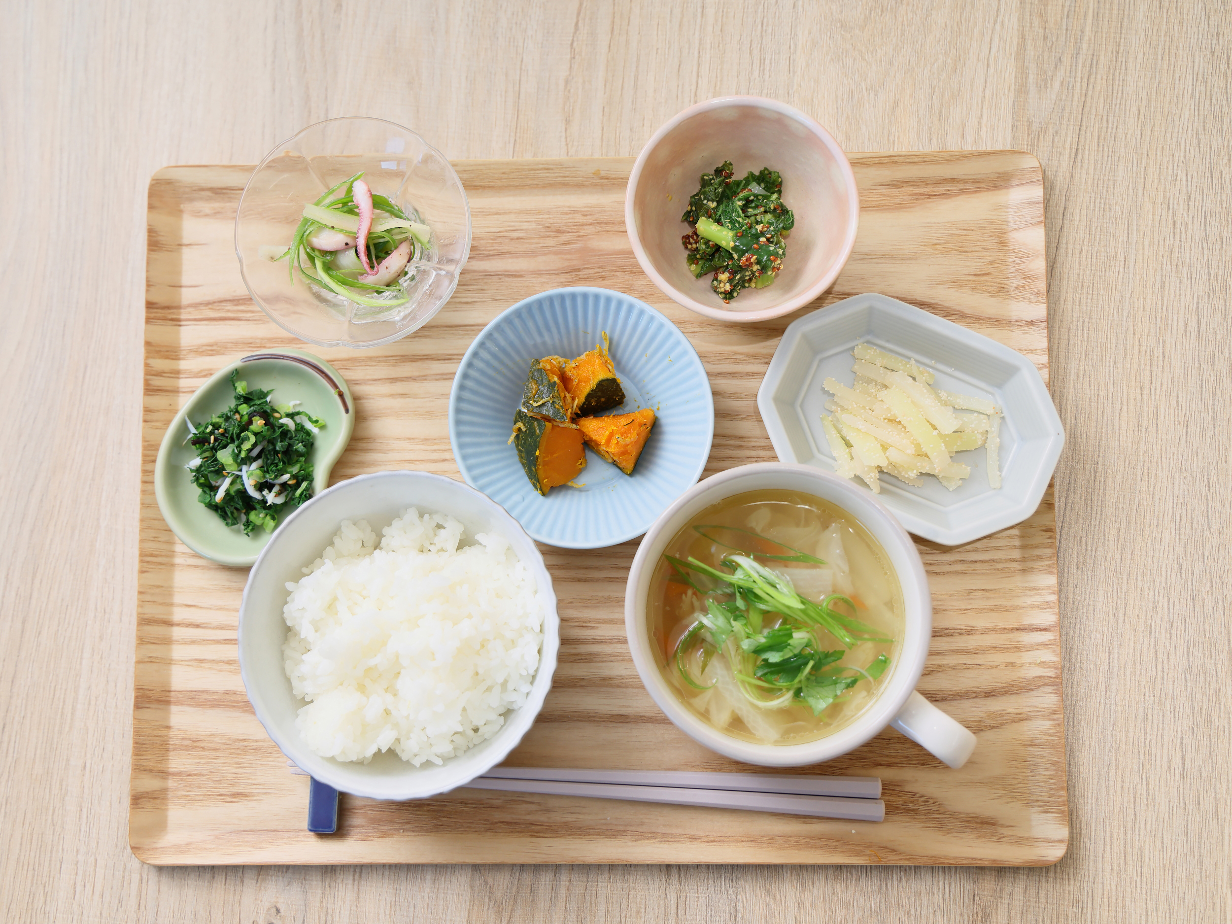 定食の汁物は塩豚の野菜スープ。この日8種類用意されていた小鉢の中からお任せでお願いし、左から「菜っぱしらす」「イカとセロリのさっと和え」「南瓜のはちみつジャコ煮」「菜の花マスタード和え」「明太だいこん」を頂きました。