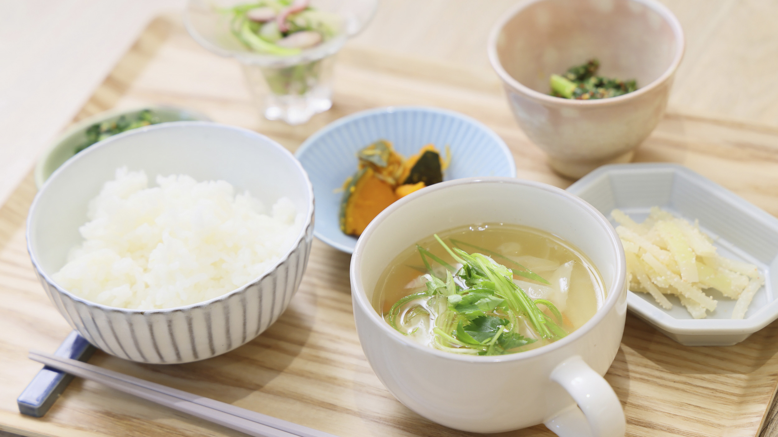 ふっくら炊けたご飯を頂き、豚のうまみが染み出た野菜スープを飲み、副菜を食べる。今日1日頑張るぞ!と心の中で小さなガッツポーズをできる、そんな朝ご飯を楽しめます。