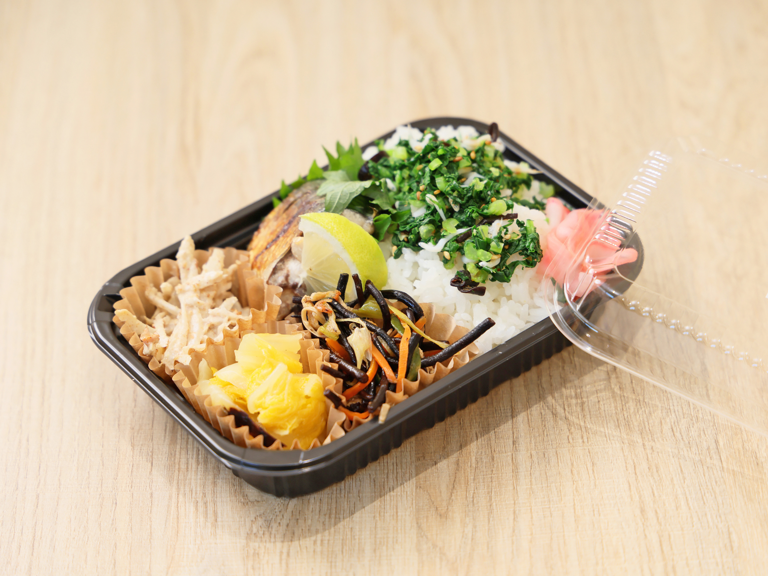 ご飯・具だくさんの汁物と5種類の小鉢からなる「今日の定食」(1,100円)と追加のおかずが店内で食べられ、また、おにぎりやお弁当などテイクアウトも用意されています。