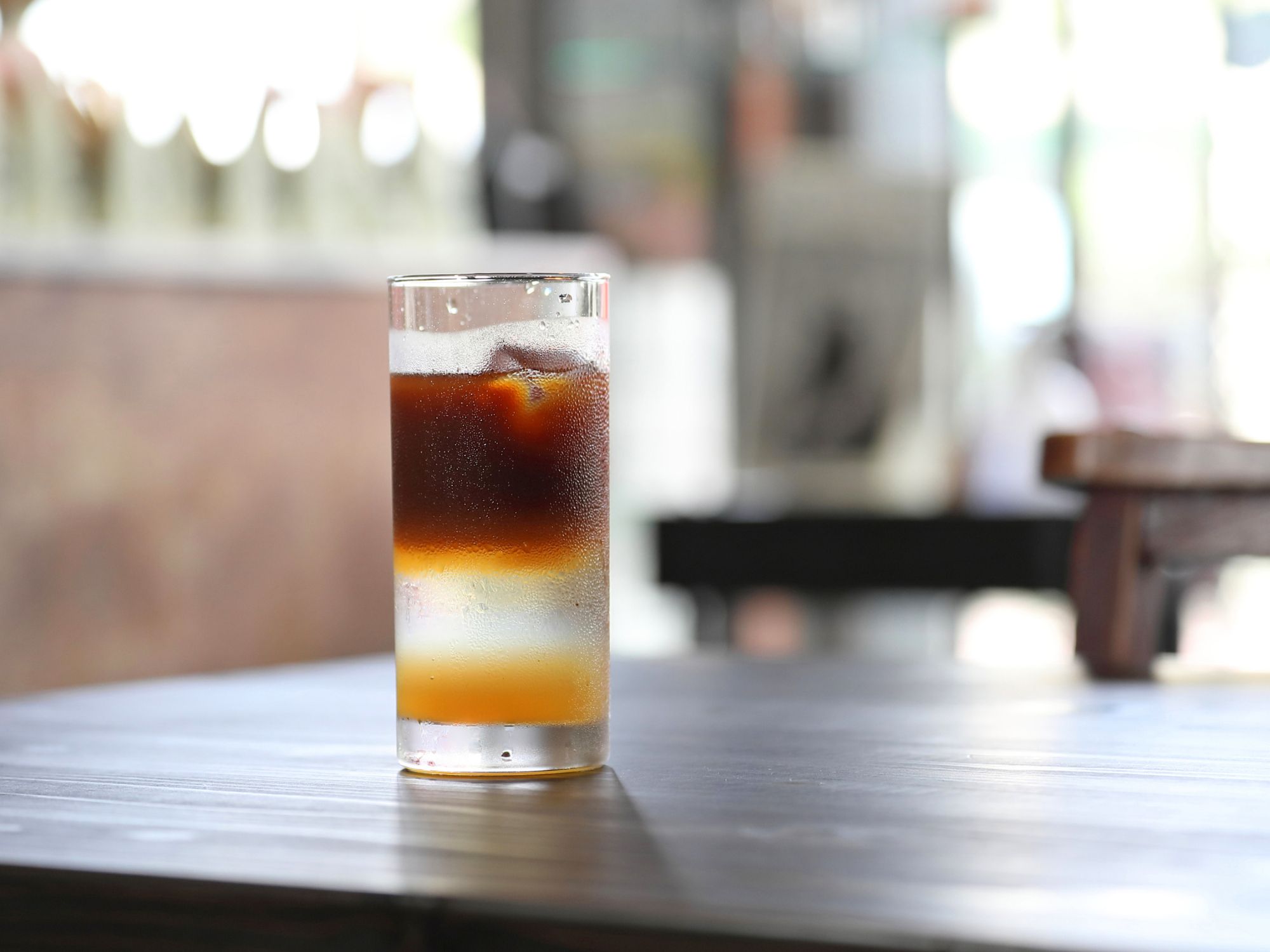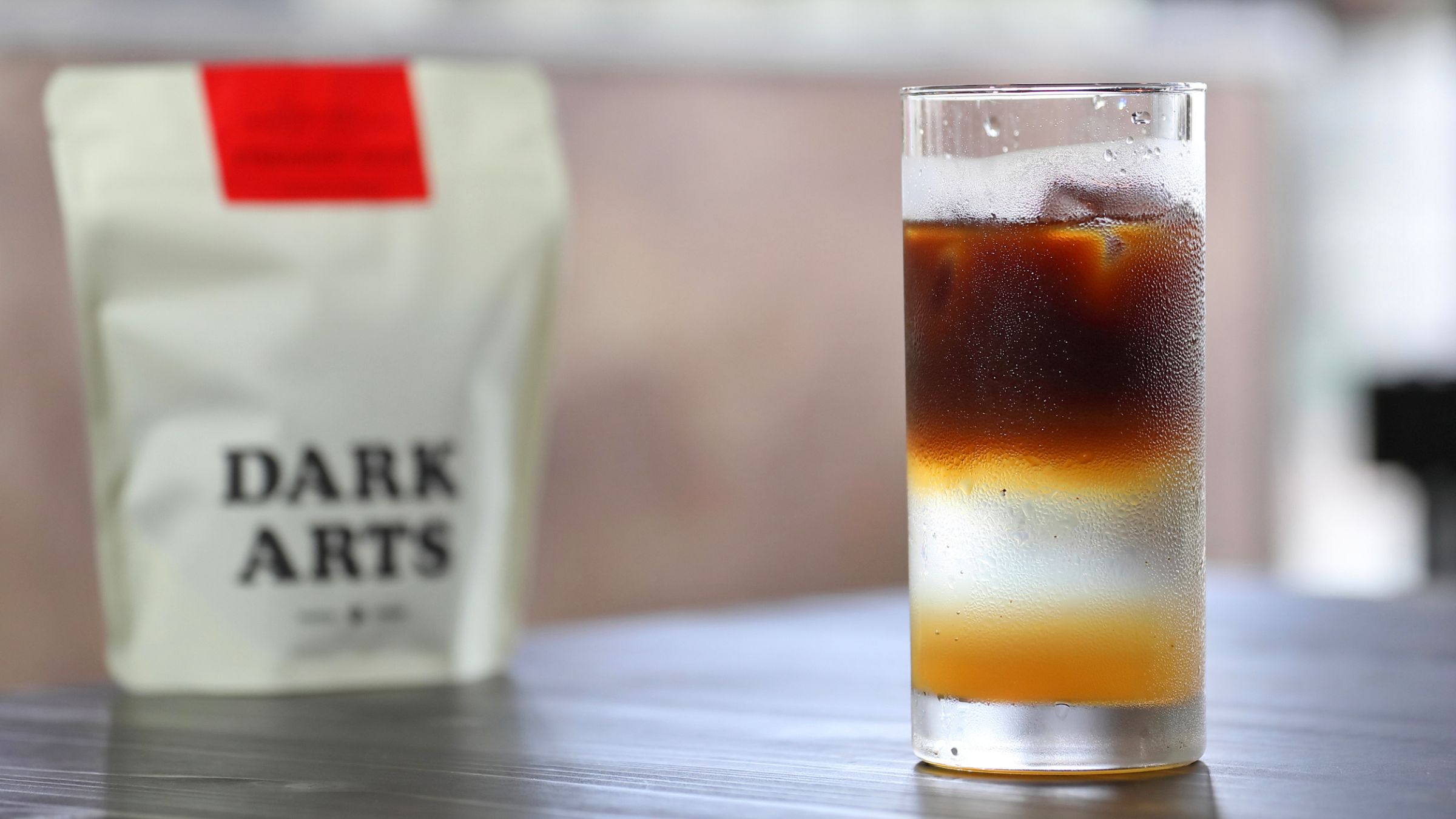 グラスに氷、ライチシロップ、トニックウォーター、、エスプレッソが注がれることで生まれる美しいレイヤーとグラデーション。「Lost Highway」というエチオピア産の豆でエスプレッソを抽出しています。
