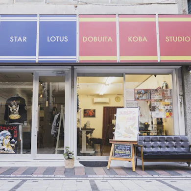 ドブ板通りに聞こえるミシンの音。それはオーダーメードスカジャン店「ドブ板コーバスタジオ」の山上大輔さんが店先で作業をしている音です。両手・足・膝を駆使して繰る特殊なミシンがつなぐ緻密な刺繍に、道往く人々はつい足を止めます。