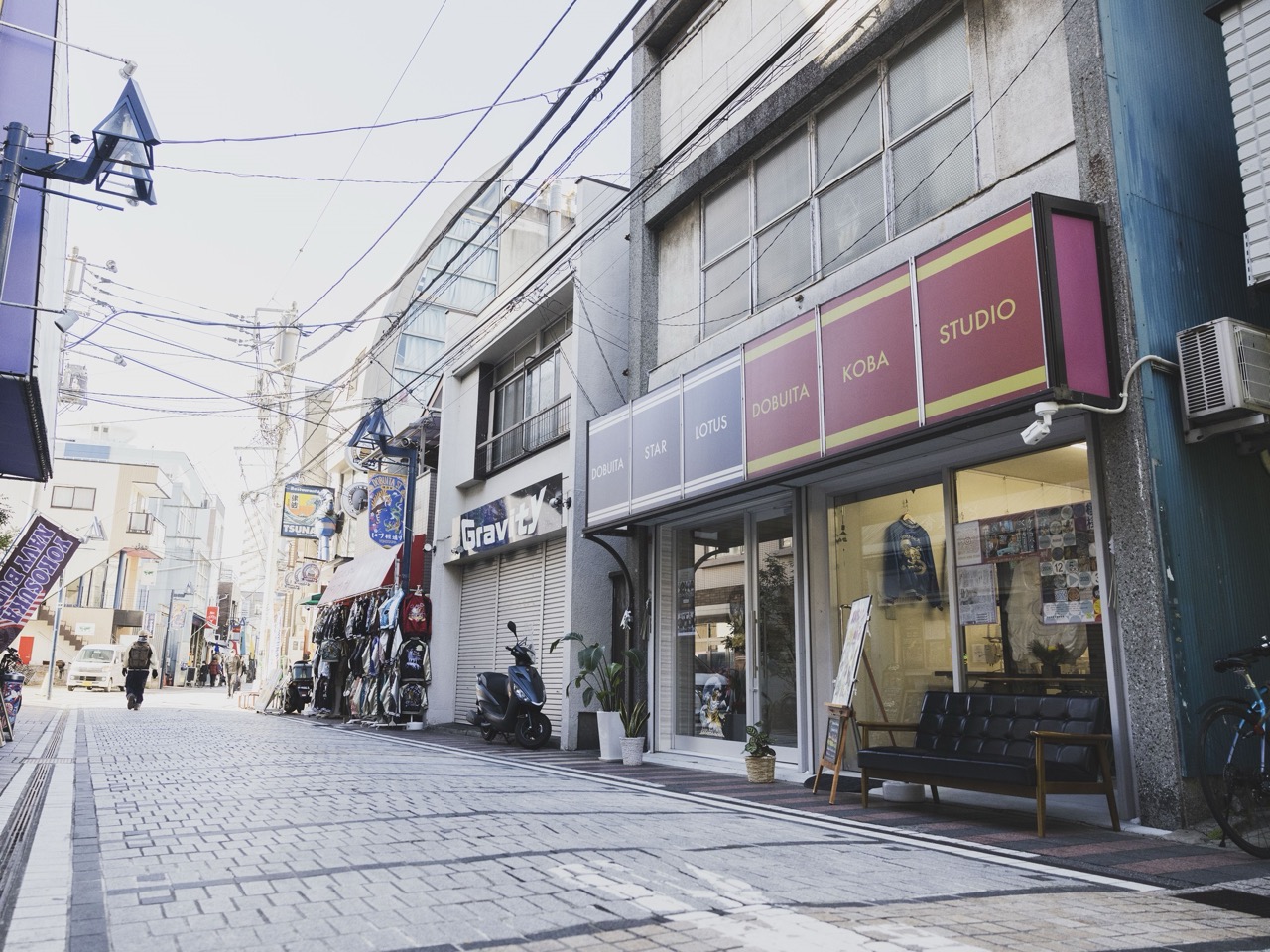 ドブ板通りに聞こえるミシンの音。それはオーダーメードスカジャン店「ドブ板コーバスタジオ」の山上大輔さんが店先で作業をしている音です。両手・足・膝を駆使して繰る特殊なミシンがつなぐ緻密な刺繍に、道往く人々はつい足を止めます。