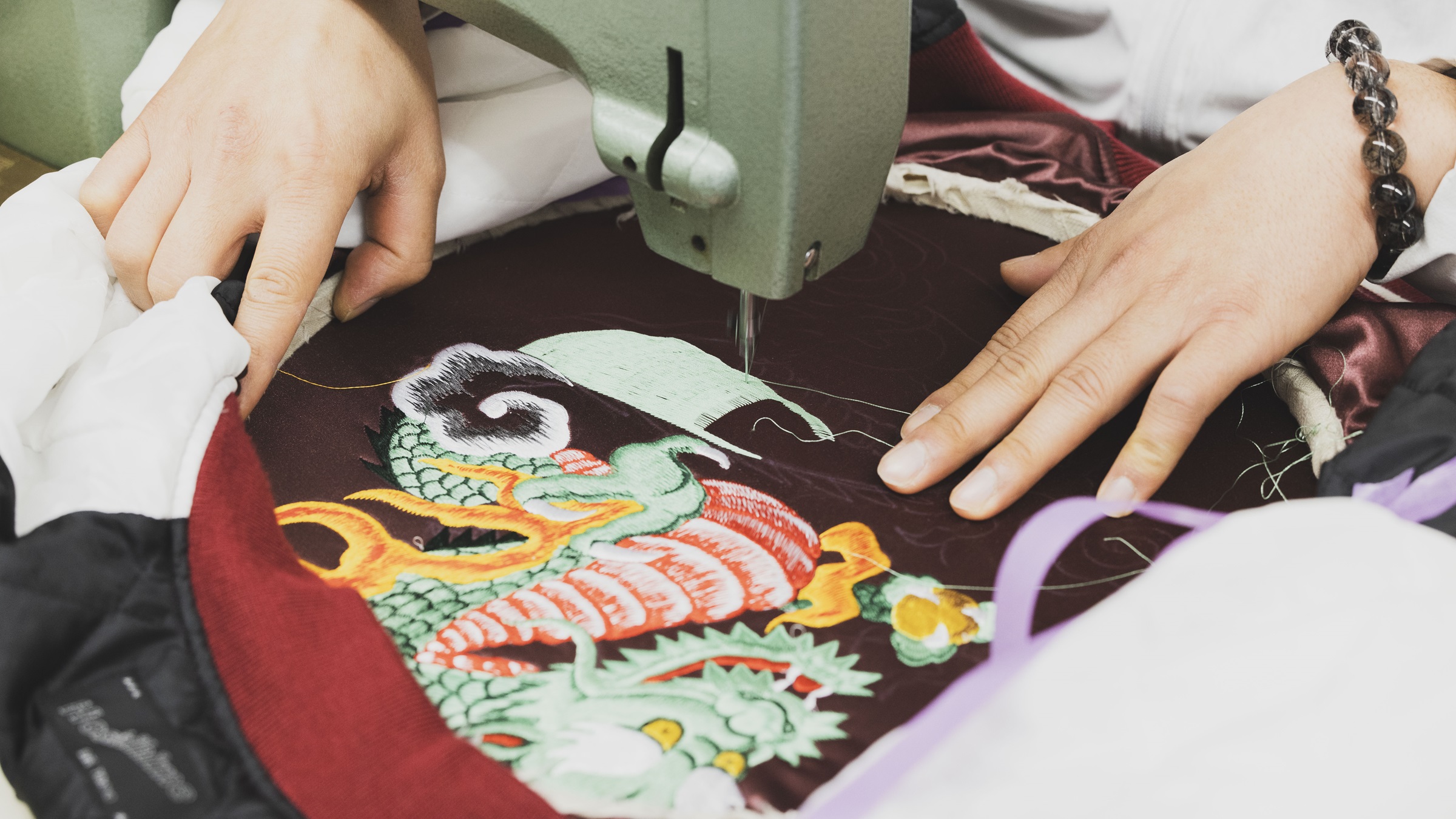 スカジャンの刺繍は「横振り刺繍」といい、群馬県桐生発祥の伝統工芸です。かつてスーベニアショップで働く桐生の職人たちがスカジャンに施し、その技術が横須賀に伝わったとされています。