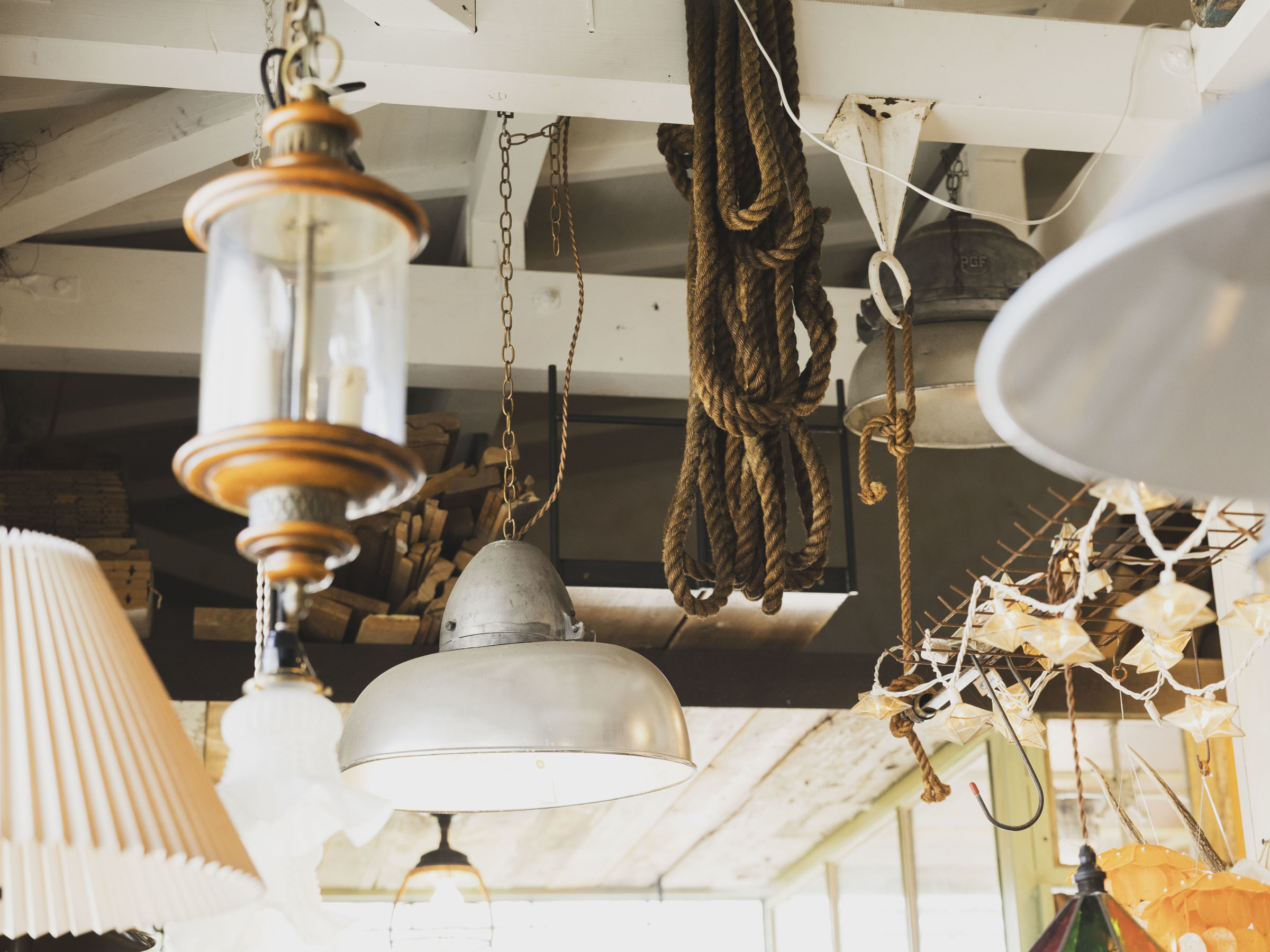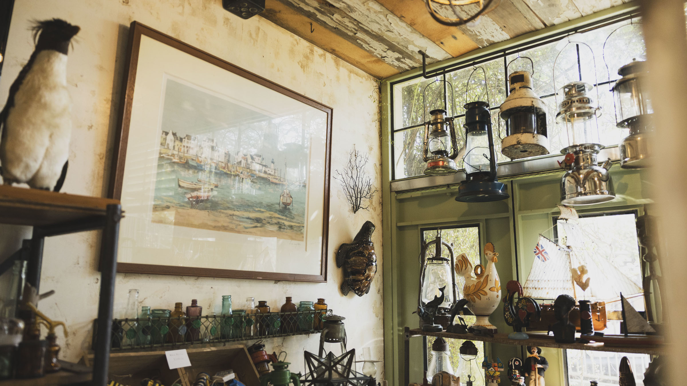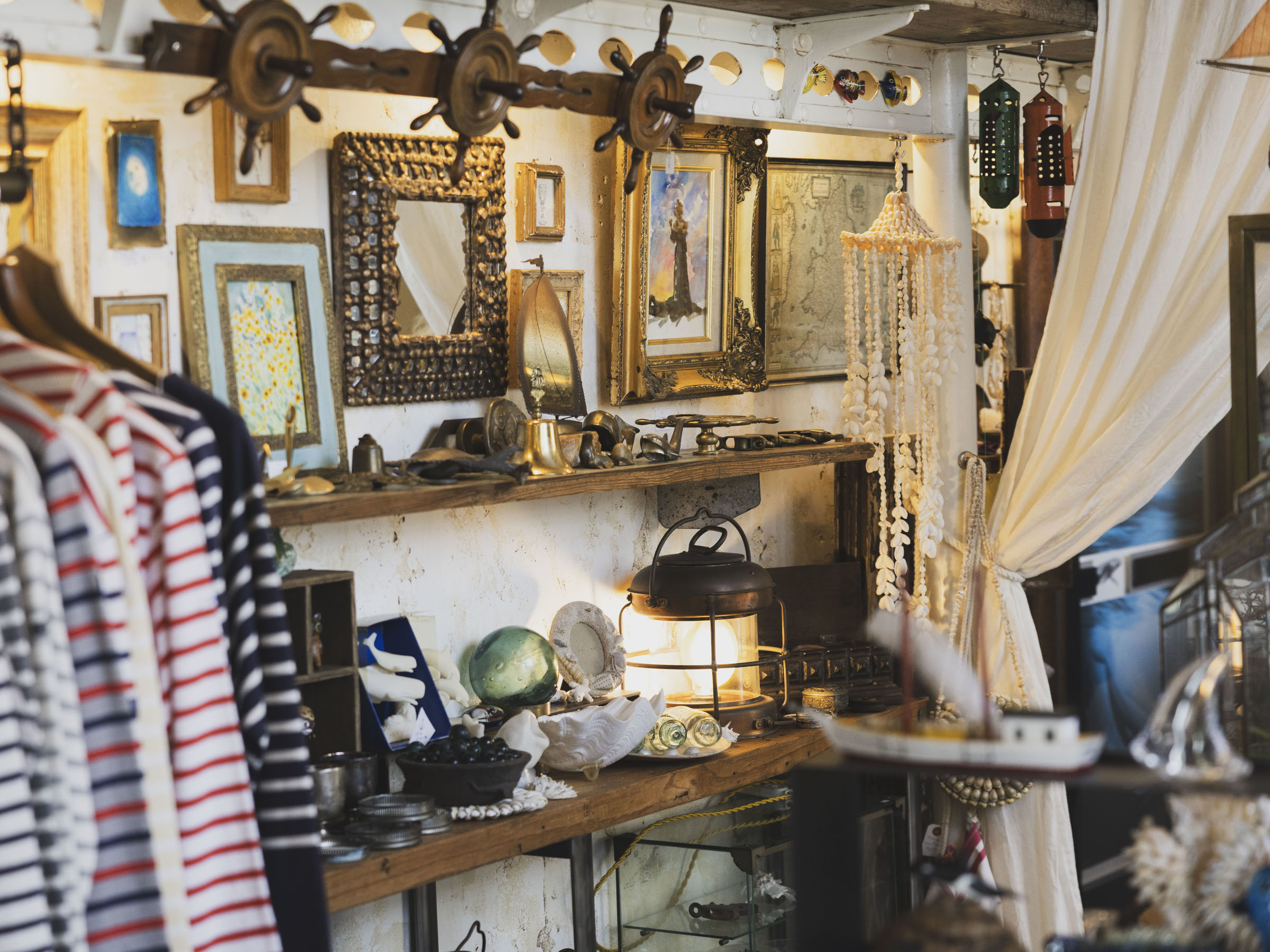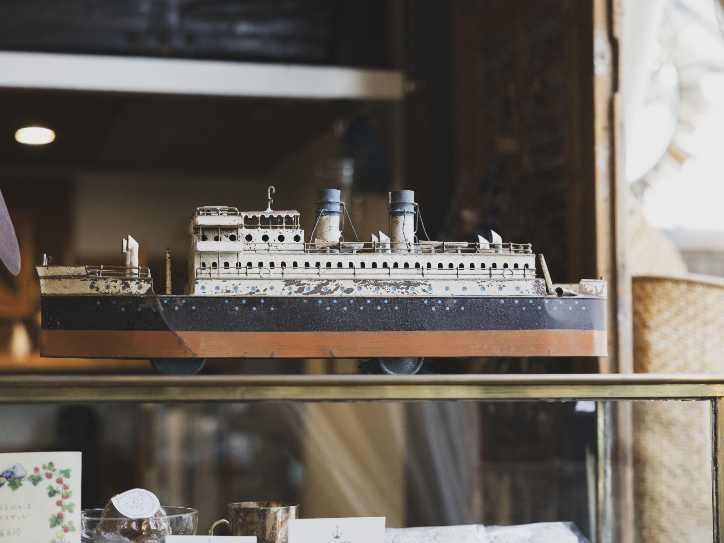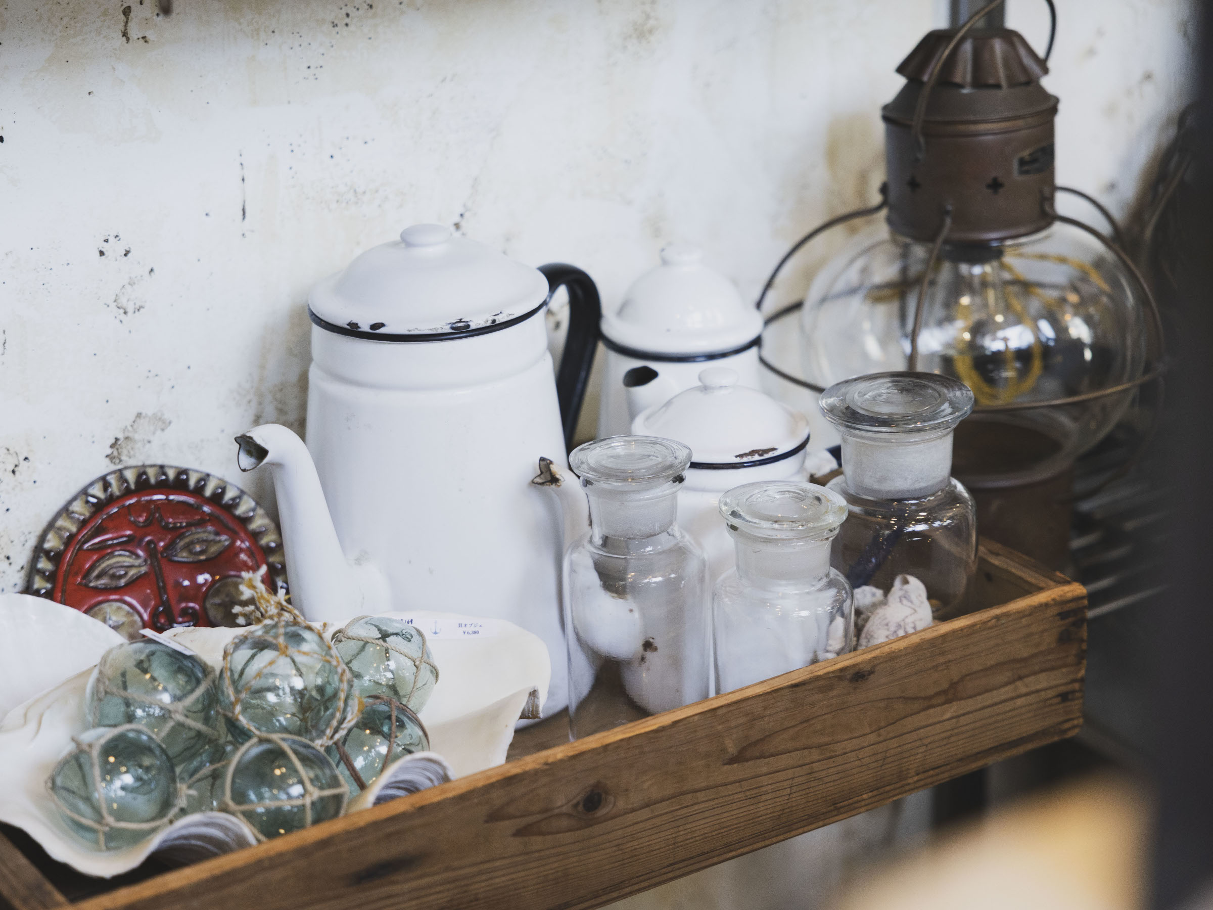 店内の棚に並ぶのは、国内の市場や骨董市などで集めたという古道具たち。カンテラや操舵輪といった船にまつわる道具や、海の生き物や貝殻のオブジェ、魚が描かれたお皿など、それぞれに物語が立ち上がるようなものばかりです。