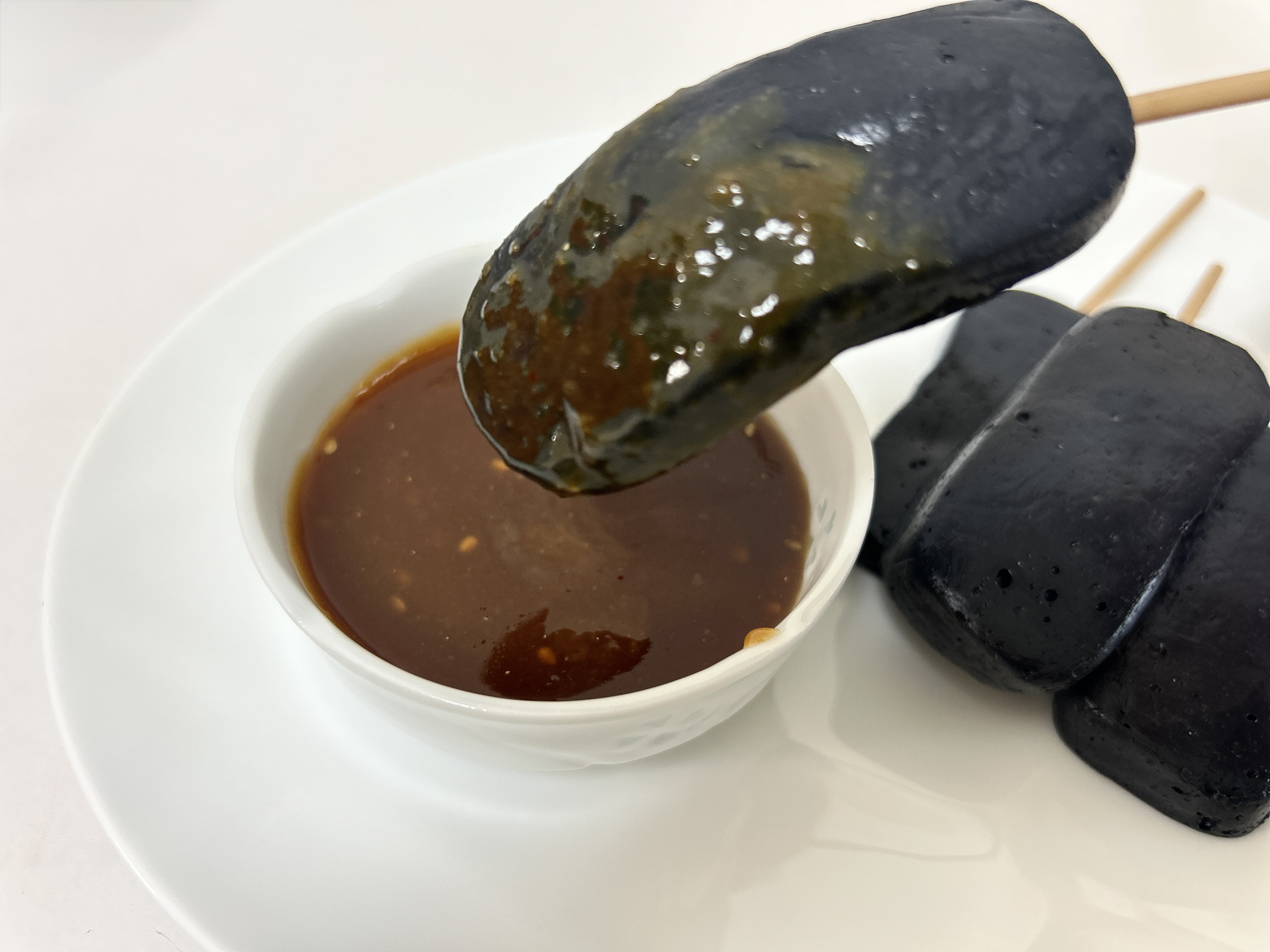 ぷりぷりとした食感が口の中で弾け、はちみつ入りの田楽味噌がその旨みを引き立てています。真っ黒なこんにゃくはもちろん、串を持つと「ぴろーん」とした遊び心満載のこんにゃくに心が躍ります。