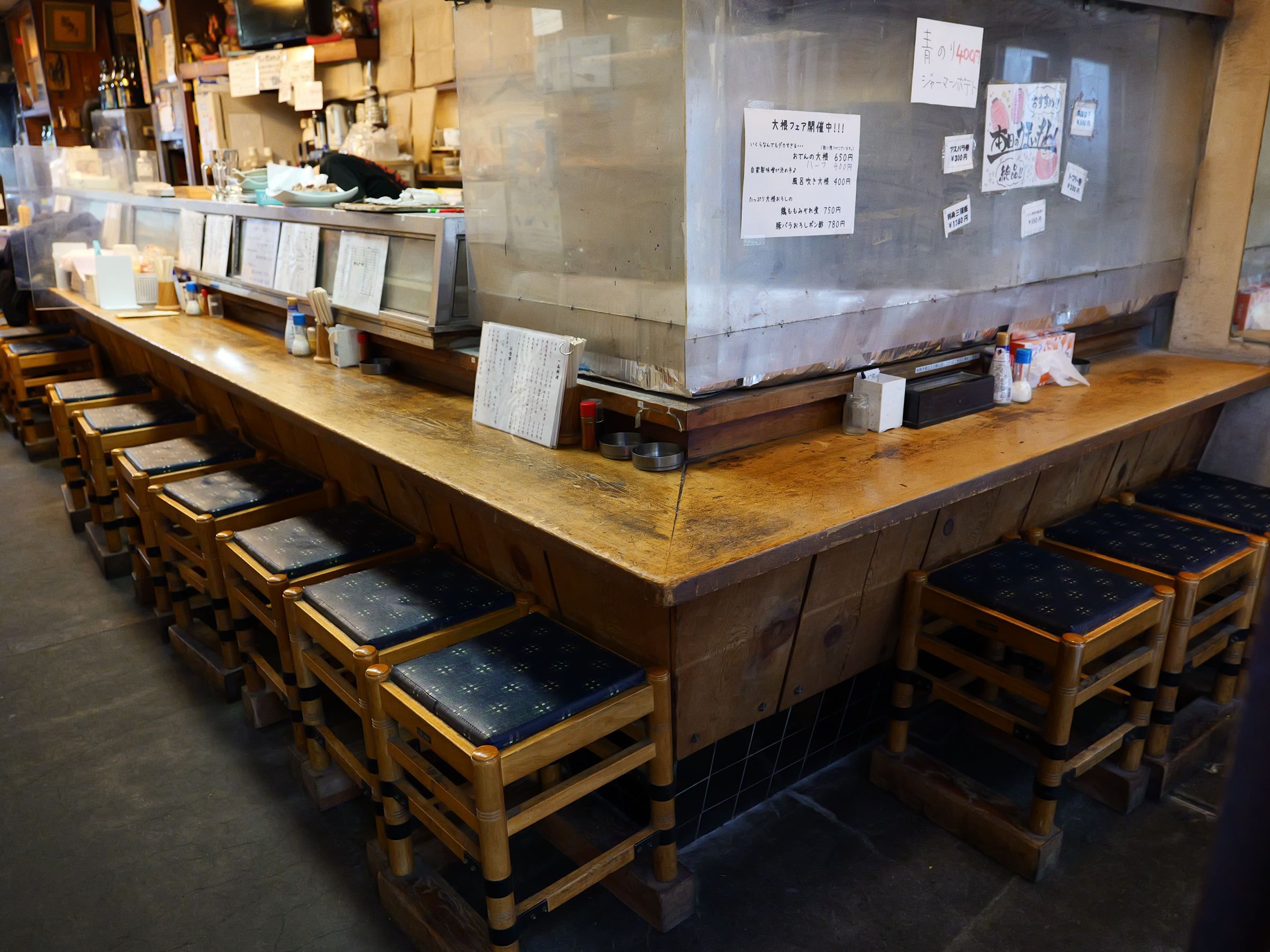 人情味を感じる白い暖簾の外観や、歴史を感じる飴色のカウンターなどお店の作りもそのままに。