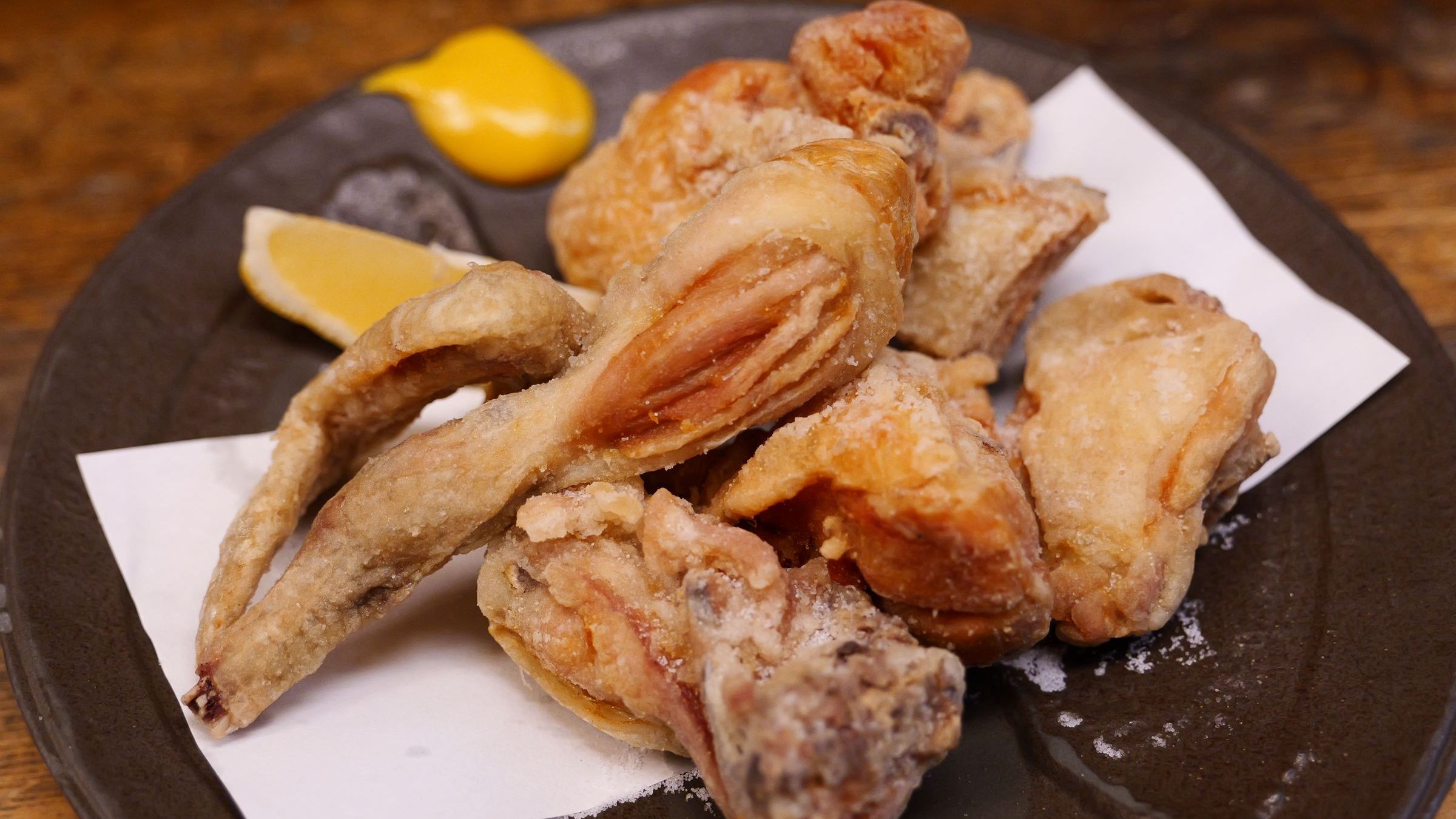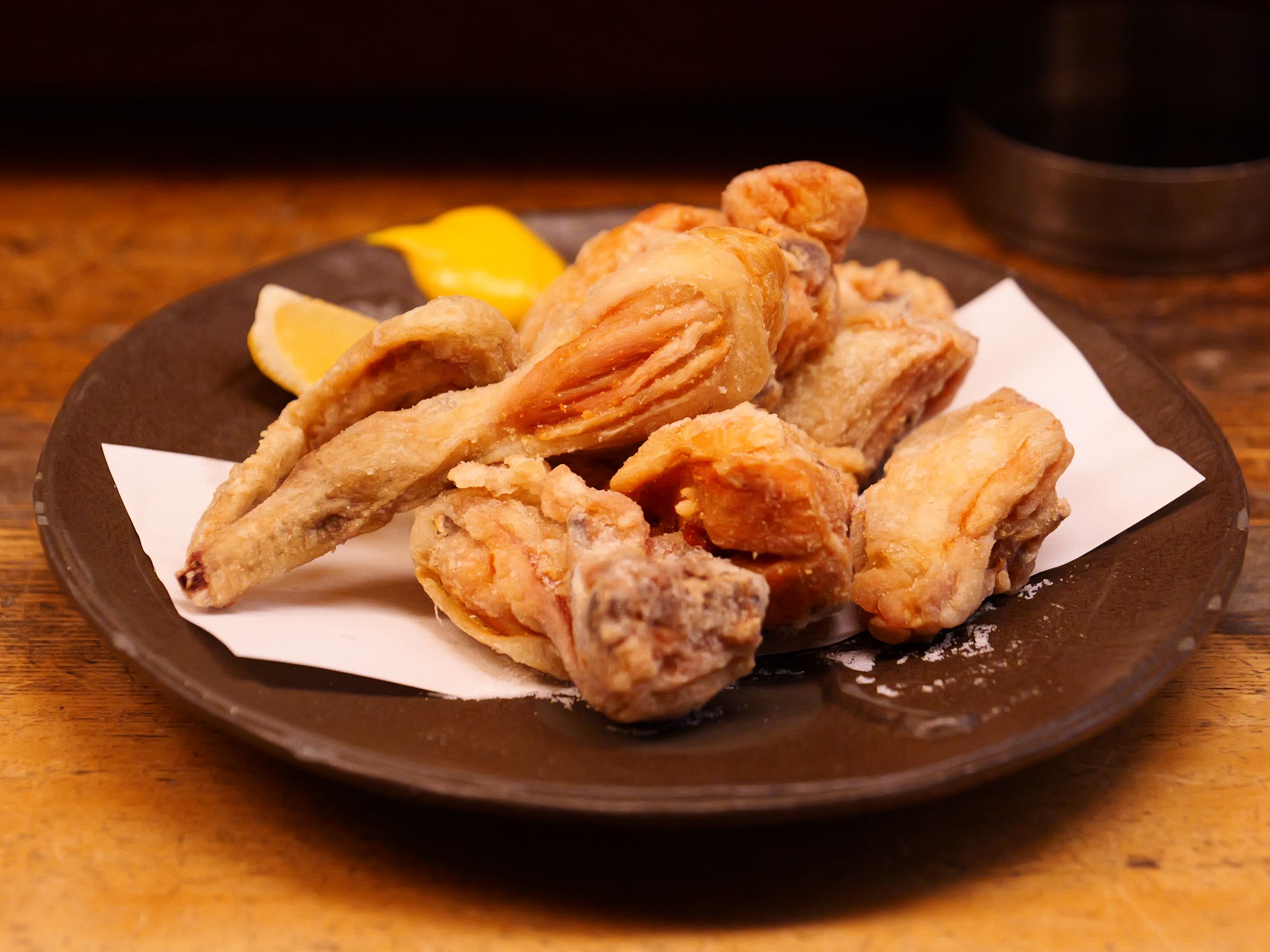 カラッと揚がったうま塩味。素揚げに近い薄衣がサクっと香ばしく、ガブっとかじれば骨付きのジューシーな脂とお肉が感じられます。
