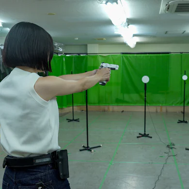 続いて教えていただいたのがホルスタードロー。ホルスターに収められた銃を抜く動作のことです。この競技を安全に行うためにも、タイムを縮めるためにも、スムーズな動きを体に染み込ませる必要があります。銃口の向きに気をつけながら銃をホルスターから抜き、安全装置を解除しながら、素早く左手で右手を包み込みターゲットを狙う。簡単そうに見える動作一つ一つ。慣れるまでが大変でした。