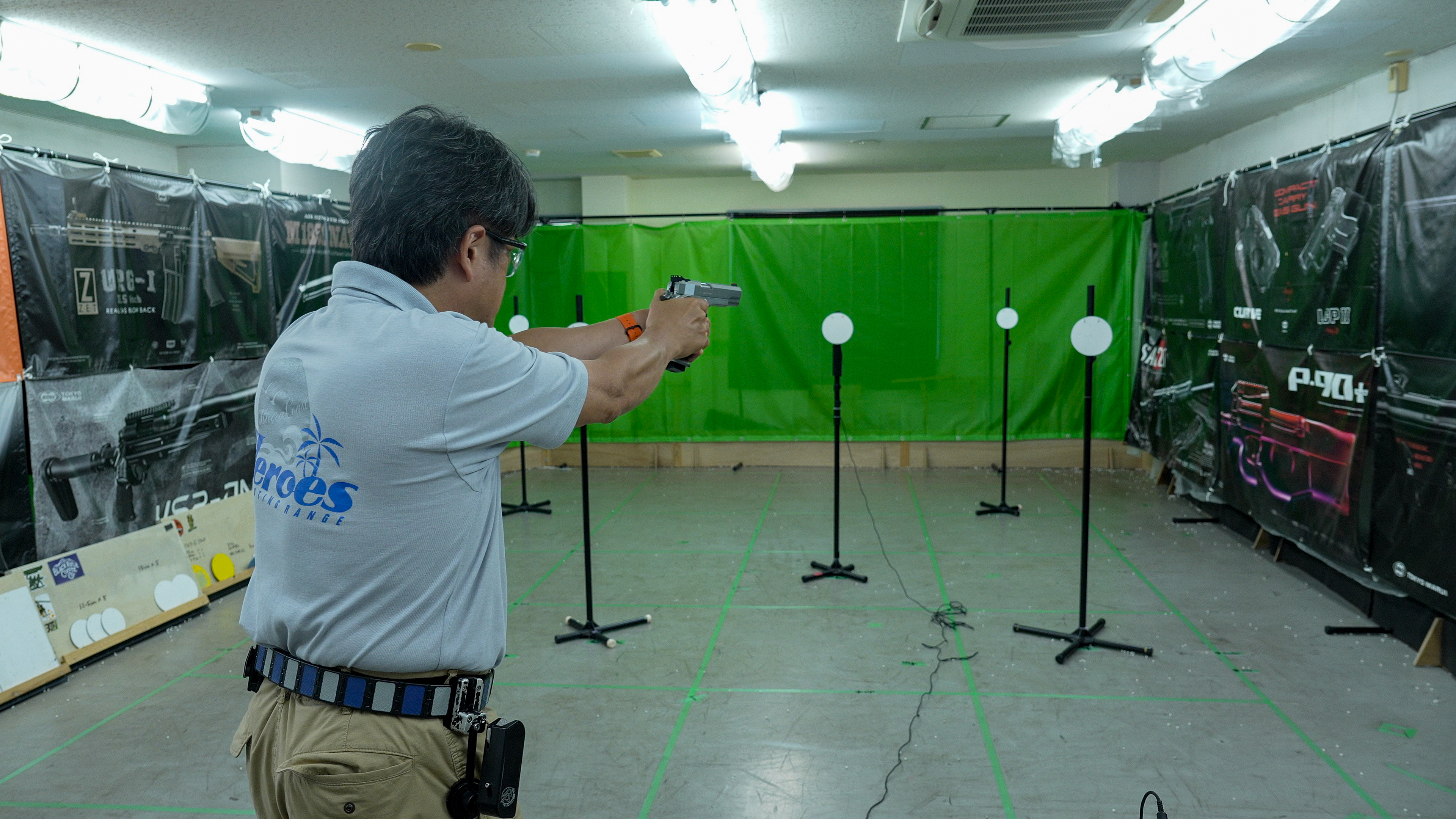 競技ルールは至ってシンプルです。手を上げた状態で構え、ブザーが鳴ってからホルスタードロー(ホルスターに収められた銃を抜く動作)、そこから5枚のターゲットをできるだけ早く撃ち終え、最後にセンサー付きのターゲットを撃ち計測終了です。