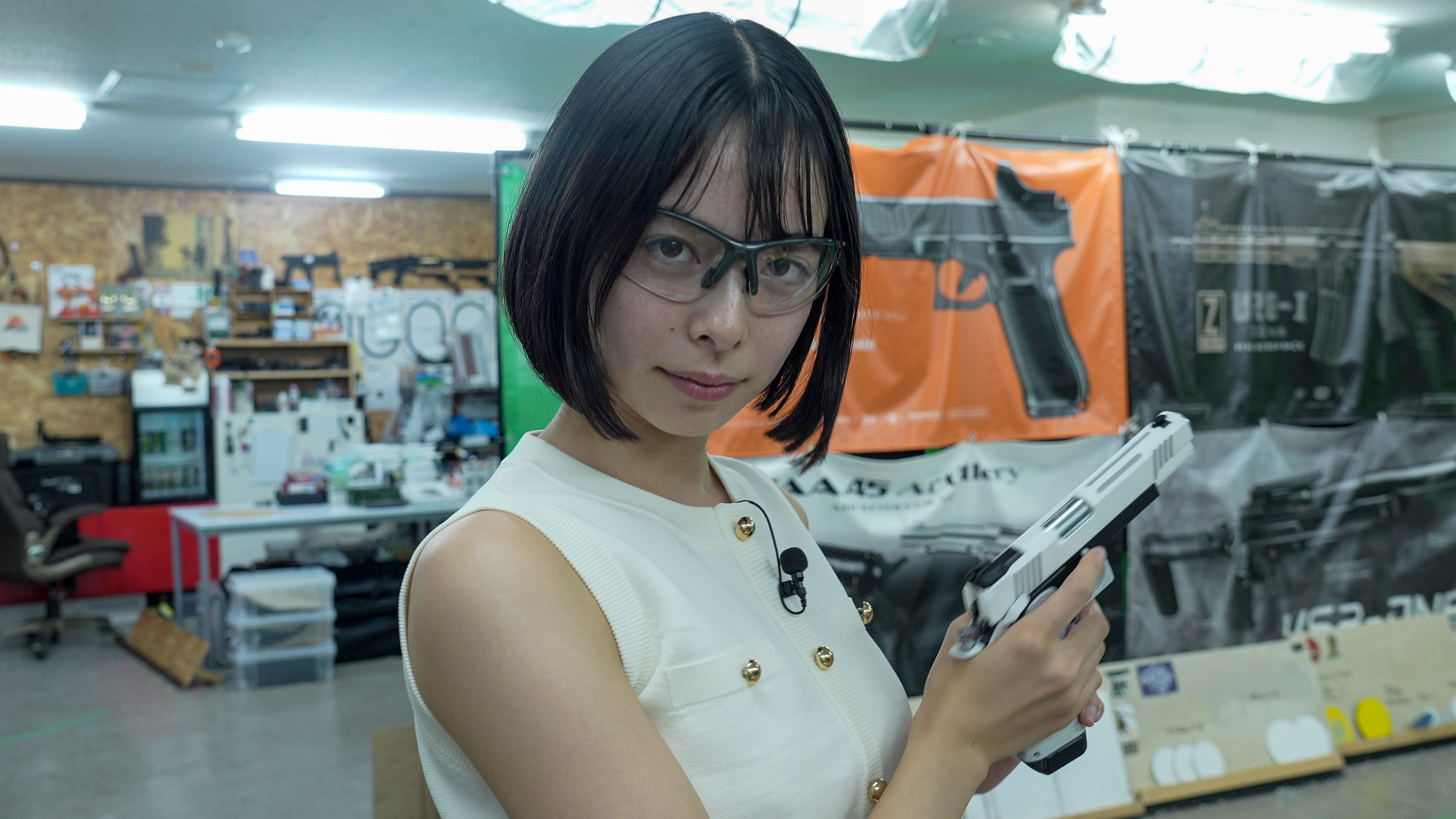 どのくらいの速さなんだろうと中沢さんが撃つところを見てから体験することに。これがまた驚くほどに速いんです。気化ガスがBB弾を押し出して発射する仕組み。危険を伴うため安全ルールは実銃と同様となり、銃口は常に前に向け、しっかりゴーグルを着用して安全に行います。