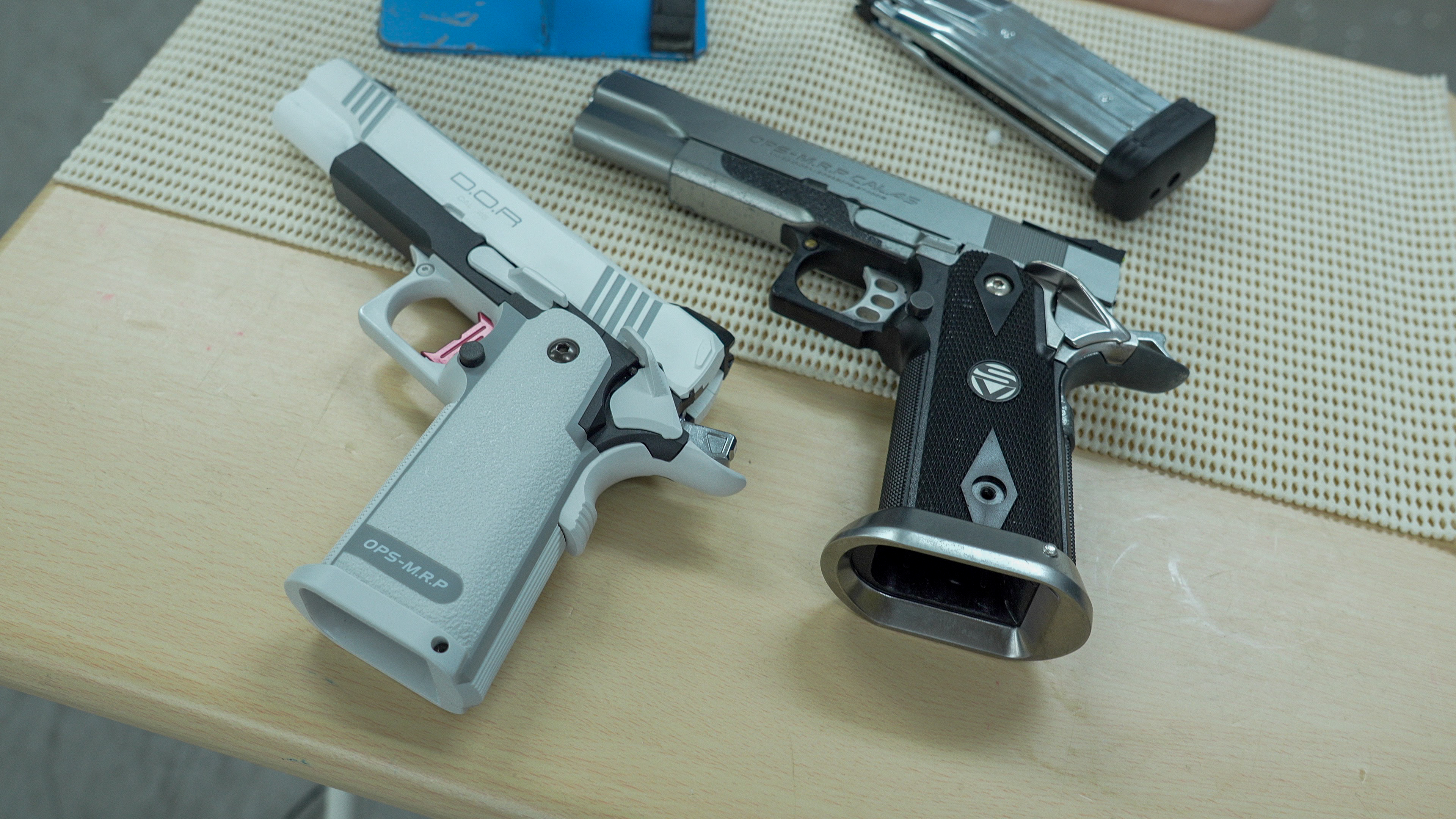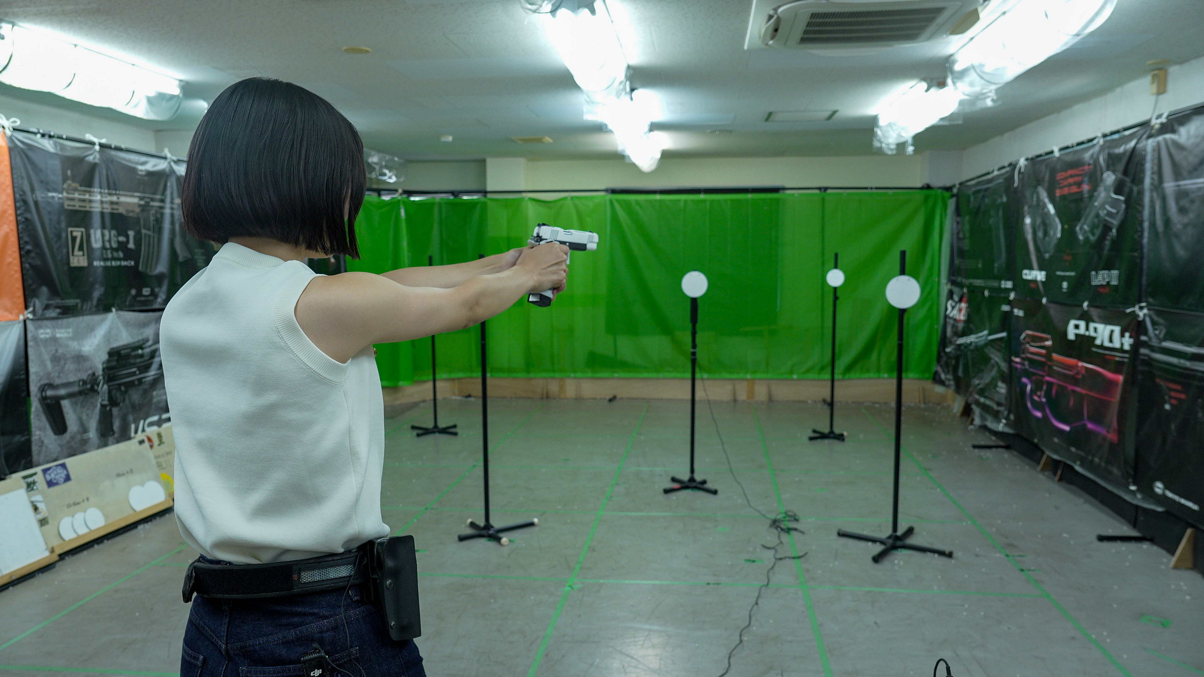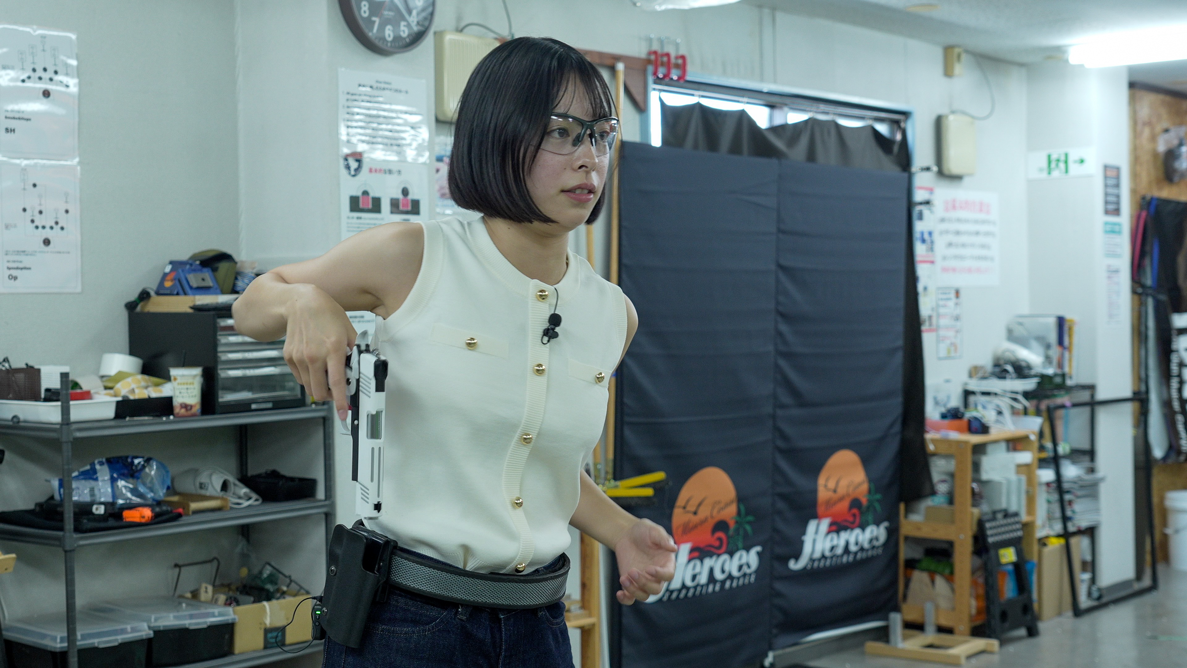 続いて教えていただいたのがホルスタードロー。ホルスターに収められた銃を抜く動作のことです。この競技を安全に行うためにも、タイムを縮めるためにも、スムーズな動きを体に染み込ませる必要があります。銃口の向きに気をつけながら銃をホルスターから抜き、安全装置を解除しながら、素早く左手で右手を包み込みターゲットを狙う。簡単そうに見える動作一つ一つ。慣れるまでが大変でした。