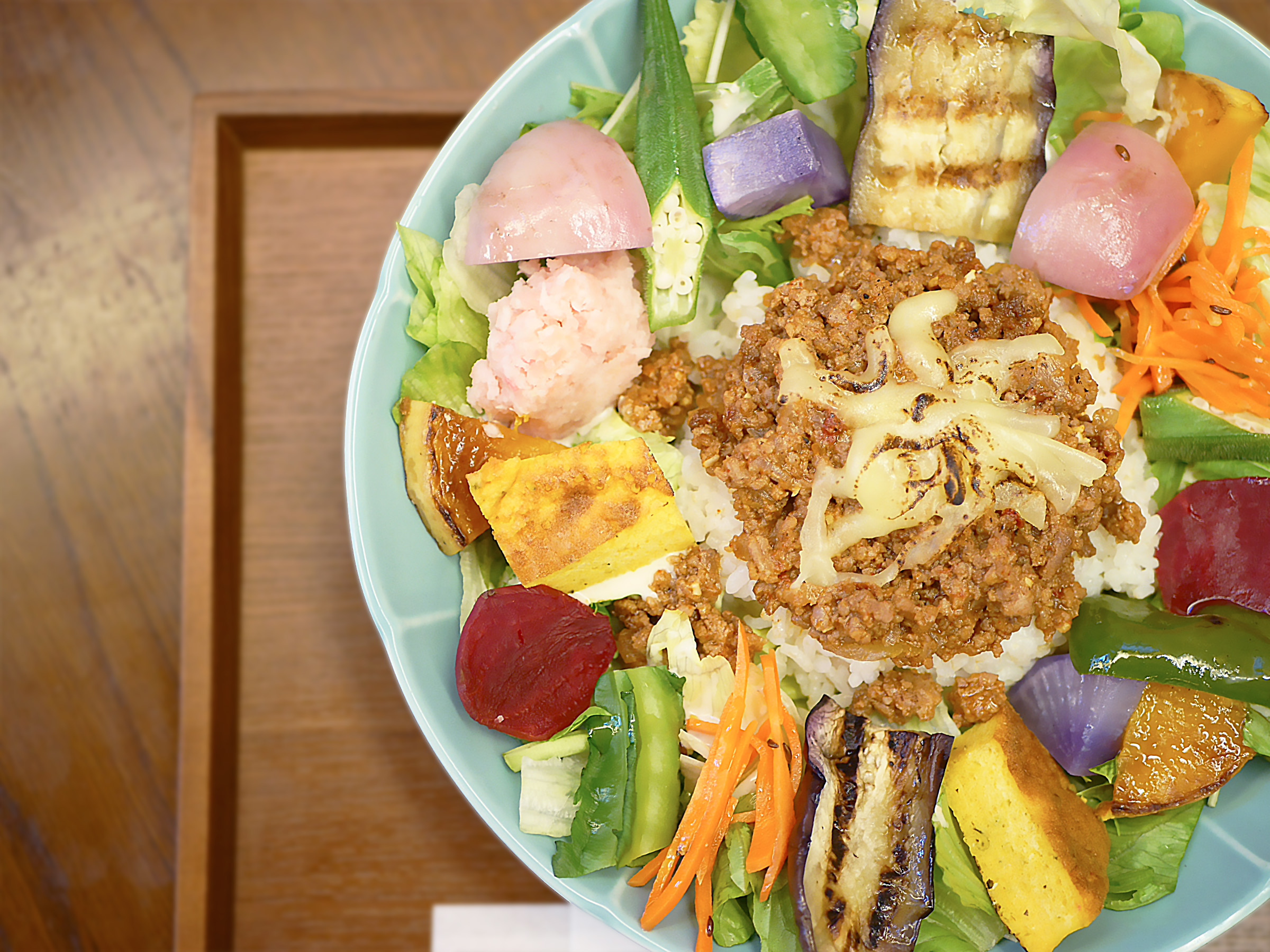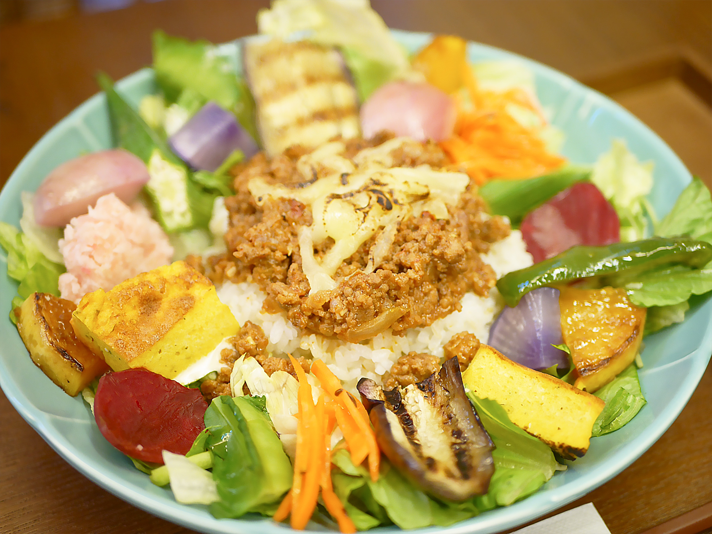 プレートに並ぶ旬の横須賀野菜は、火入れや味付けを控え、素材の味を最大限に引き出す仕上げ。中央には、鹿児島産の粘りのある5分づき玄米ごはんと、スパイスで煮込んだジューシーなタコミートがのります。
