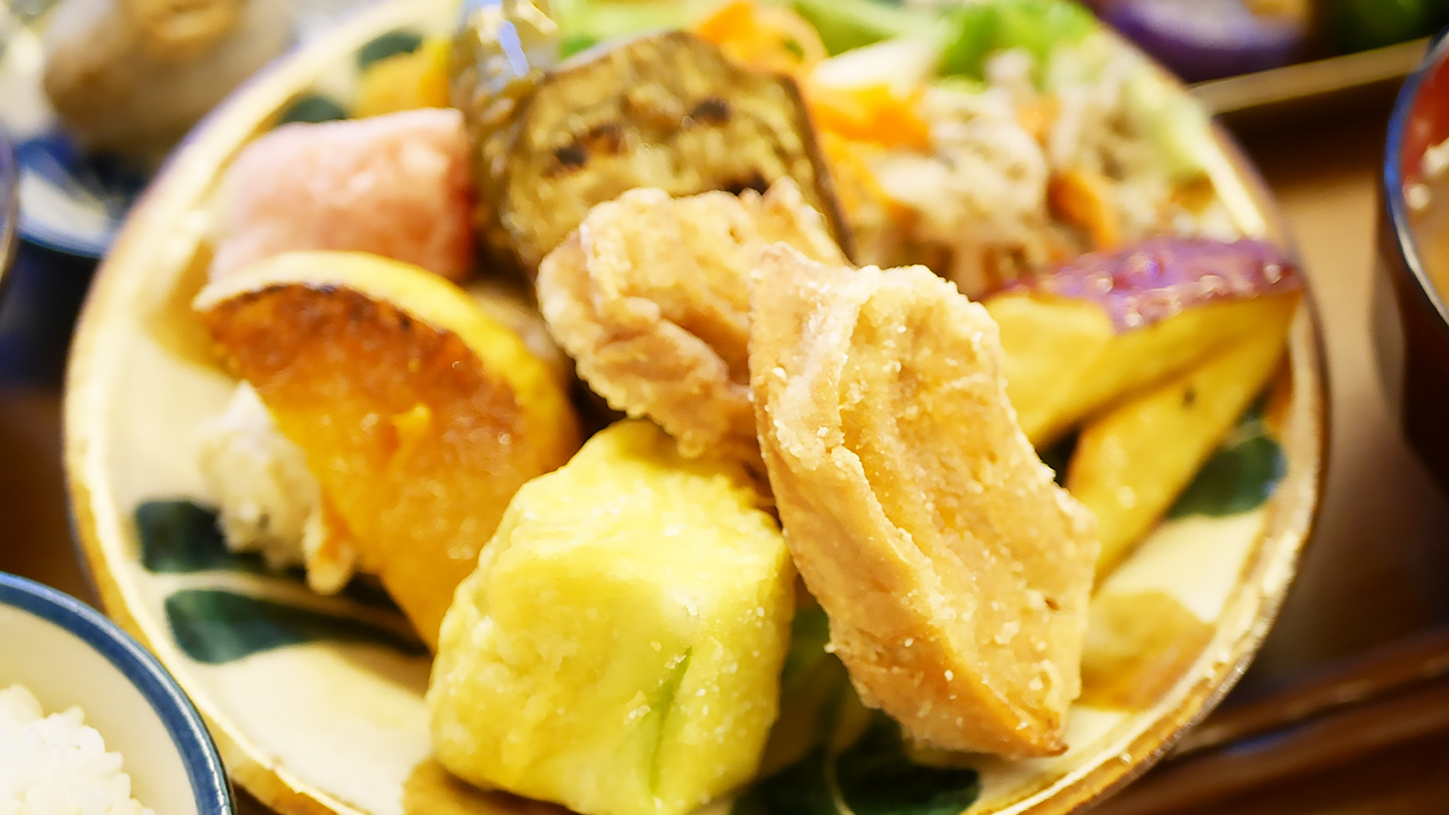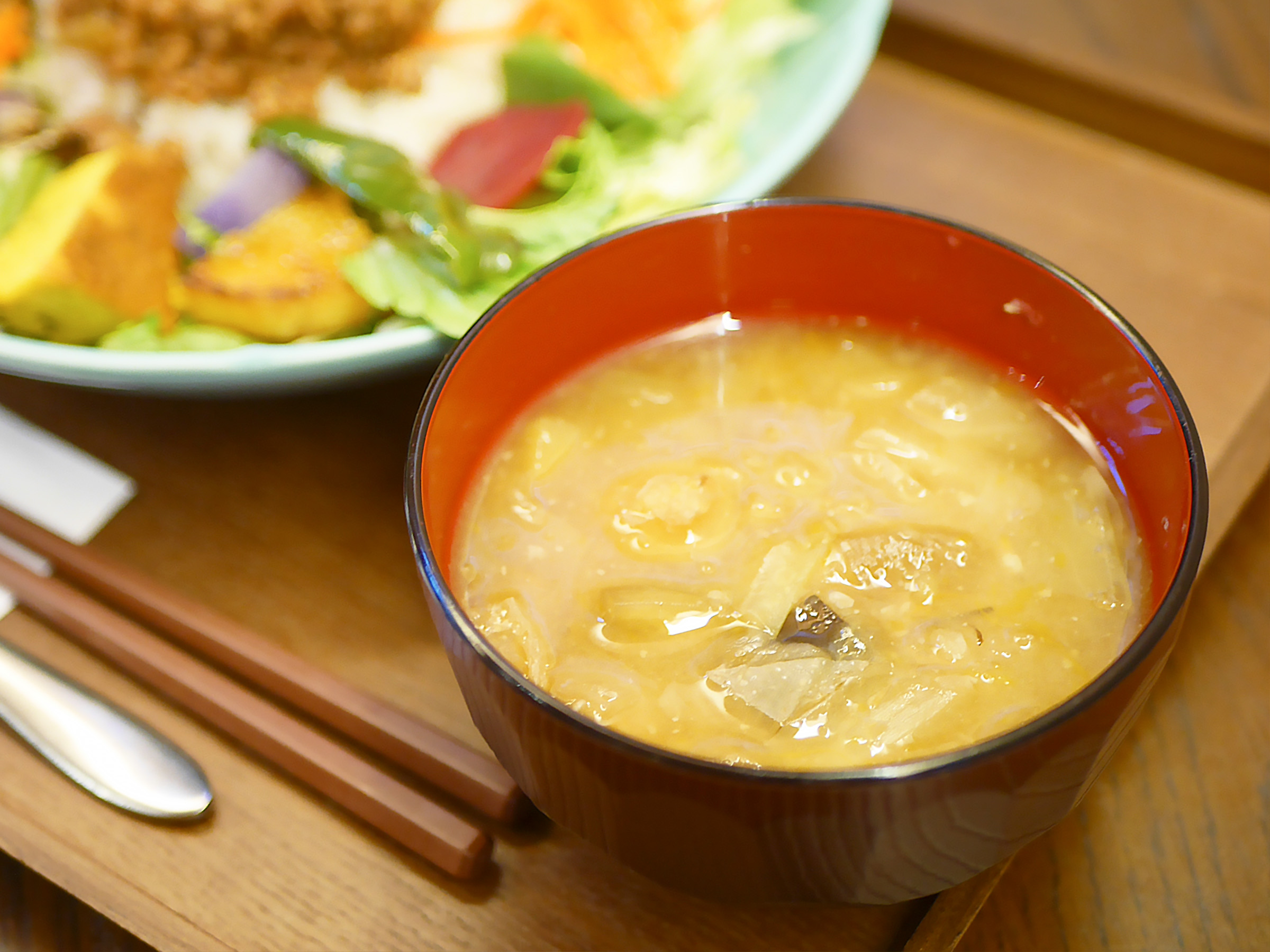 添えられる具だくさん味噌汁は、野菜の皮やヘタを煮出した“ベジブロス”の出汁が決め手。鹿児島から取り寄せる麦味噌と合わせ、香ばしさとやさしい甘みが広がります。この味噌汁を楽しみに訪れる常連客も多いそうです。