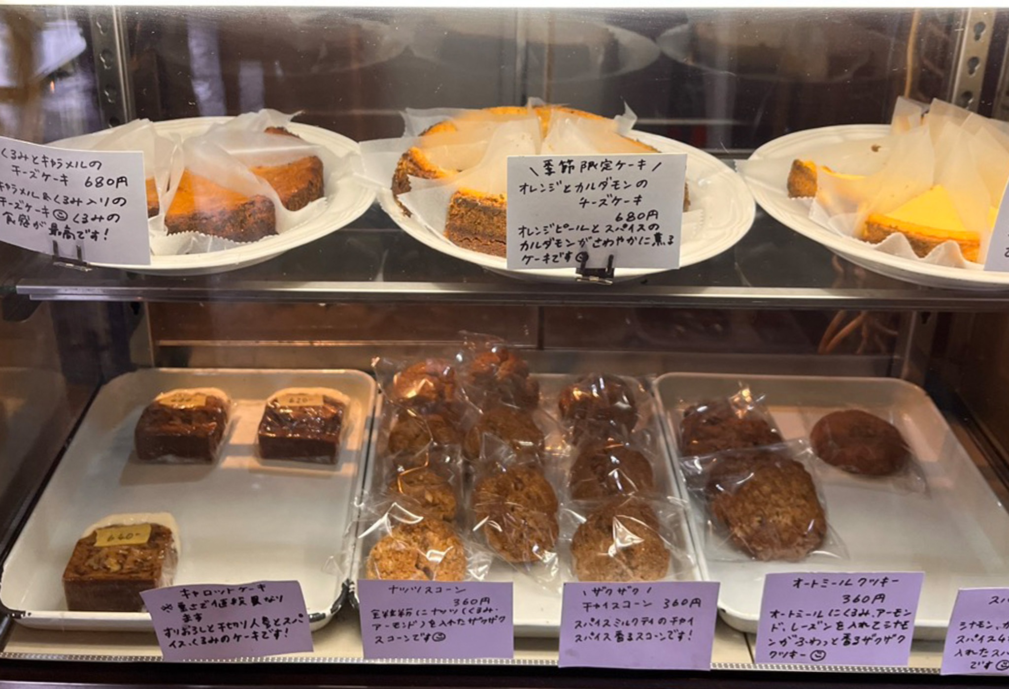人気のキャロットケーキ(680円税込/重さで価格変わります)やベイクドチーズケーキ(570円税込)に加え、全粒粉にナッツ類を入れたザクザク感のナッツスコーン(360円税込)など、薪窯で焼き上げた焼き菓子もお店の人気商品です。