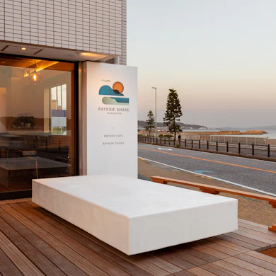 BAYSIDE CAFEは、新城さんの本業である設計やデザインの仕事をコワーキングスペースでしながら、コミュニケーションやアクティビティを楽しめる場として、三浦海岸から道路を隔てた海岸沿いに開業しました。