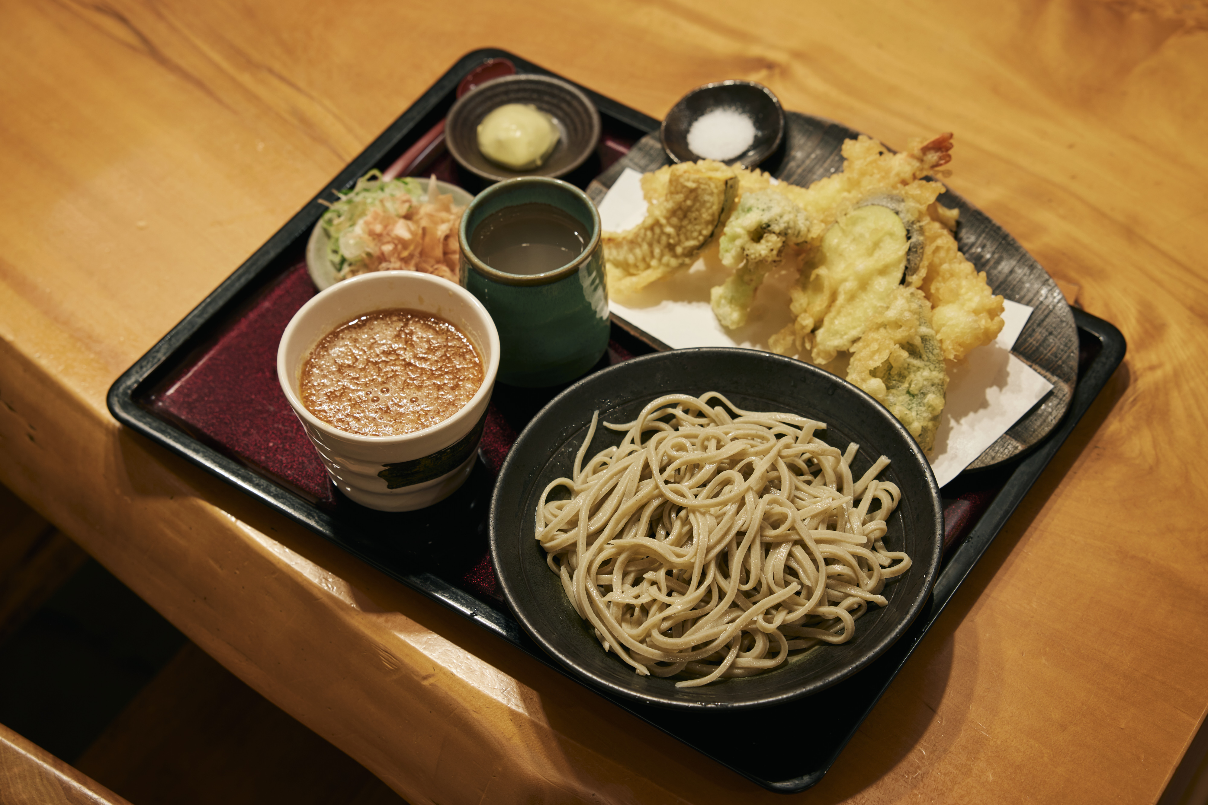 一番人気は「天ぷらおろしそば」1,690円。越前そばに海老や季節の野菜の天ぷらがセットになっています。