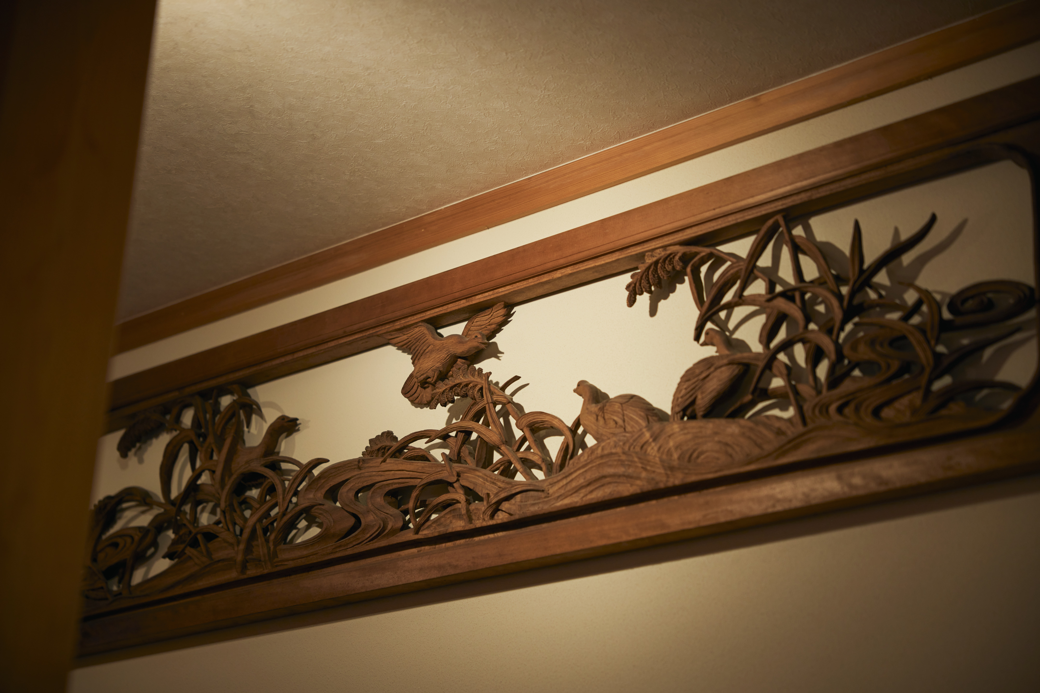 2018年に移転リニューアルした店内は、祖父母の旅館に飾ってあった欄間が飾られていたり、ダイニングテーブルを支えていた石は手水鉢にカスタマイズされていたりと、歴史を受け継いでいます。