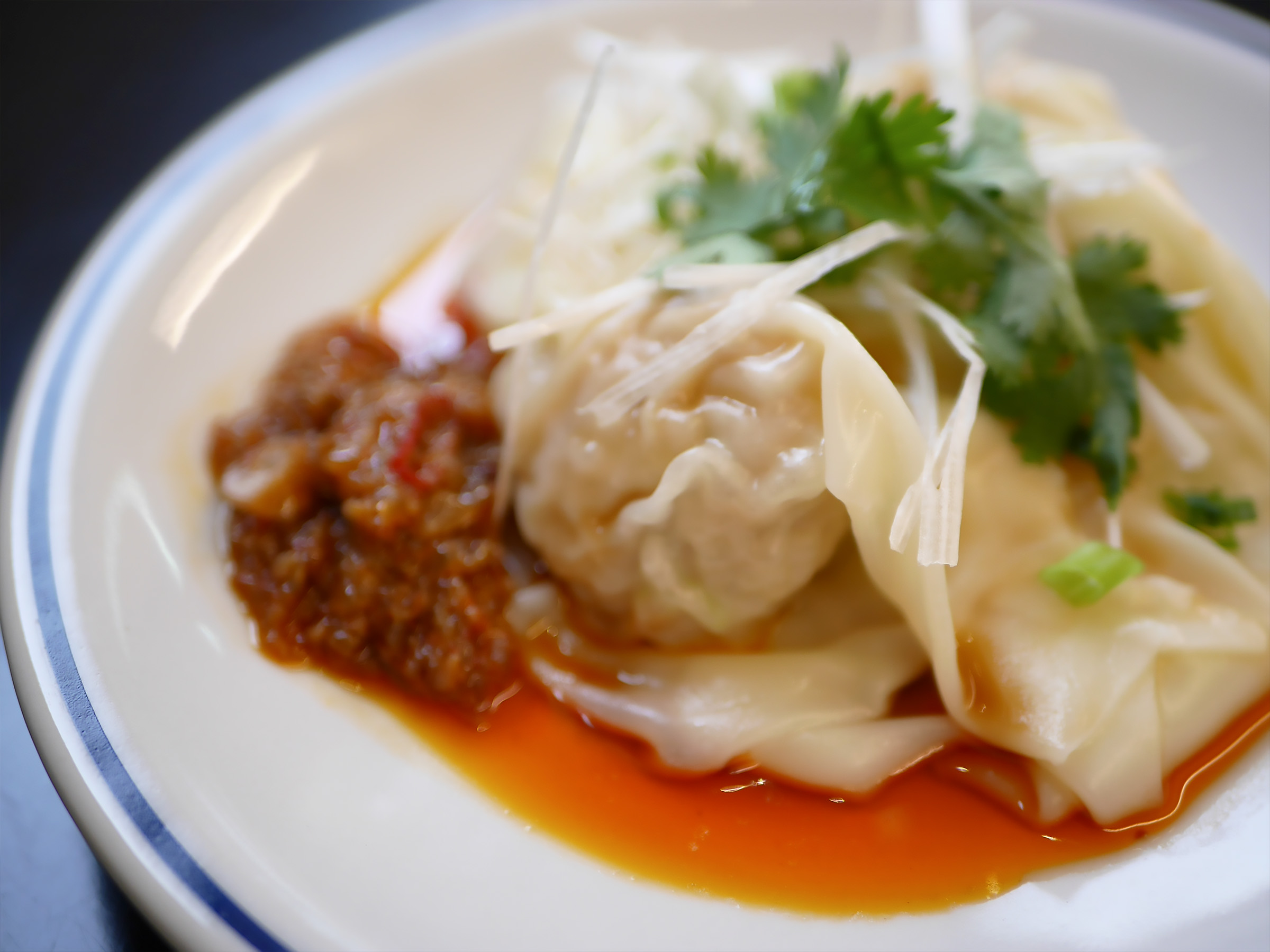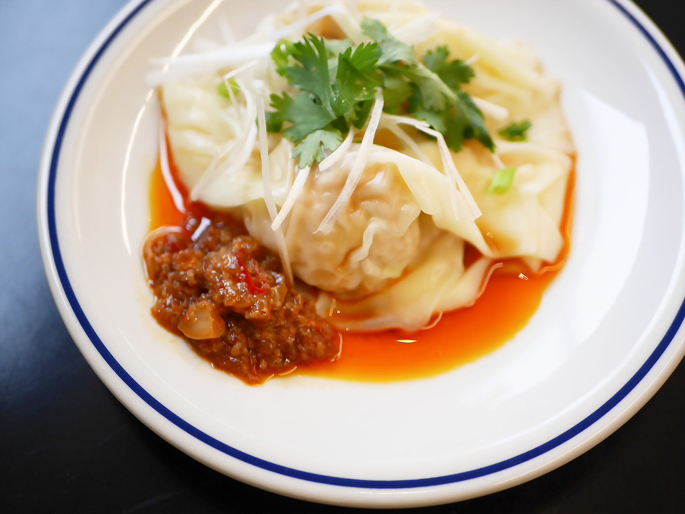 大判のワンタンはつるりとした喉ごしで、噛むほどに肉汁の旨みがあふれます。好みでかける具沢山の自家製ラー油は、唐辛子や生姜、ニンニク、ナッツ、ネギをごま油で煮込んだ香ばしい辛みが特徴。ワンタンの旨みを引き立て、おつまみにもぴったりです。