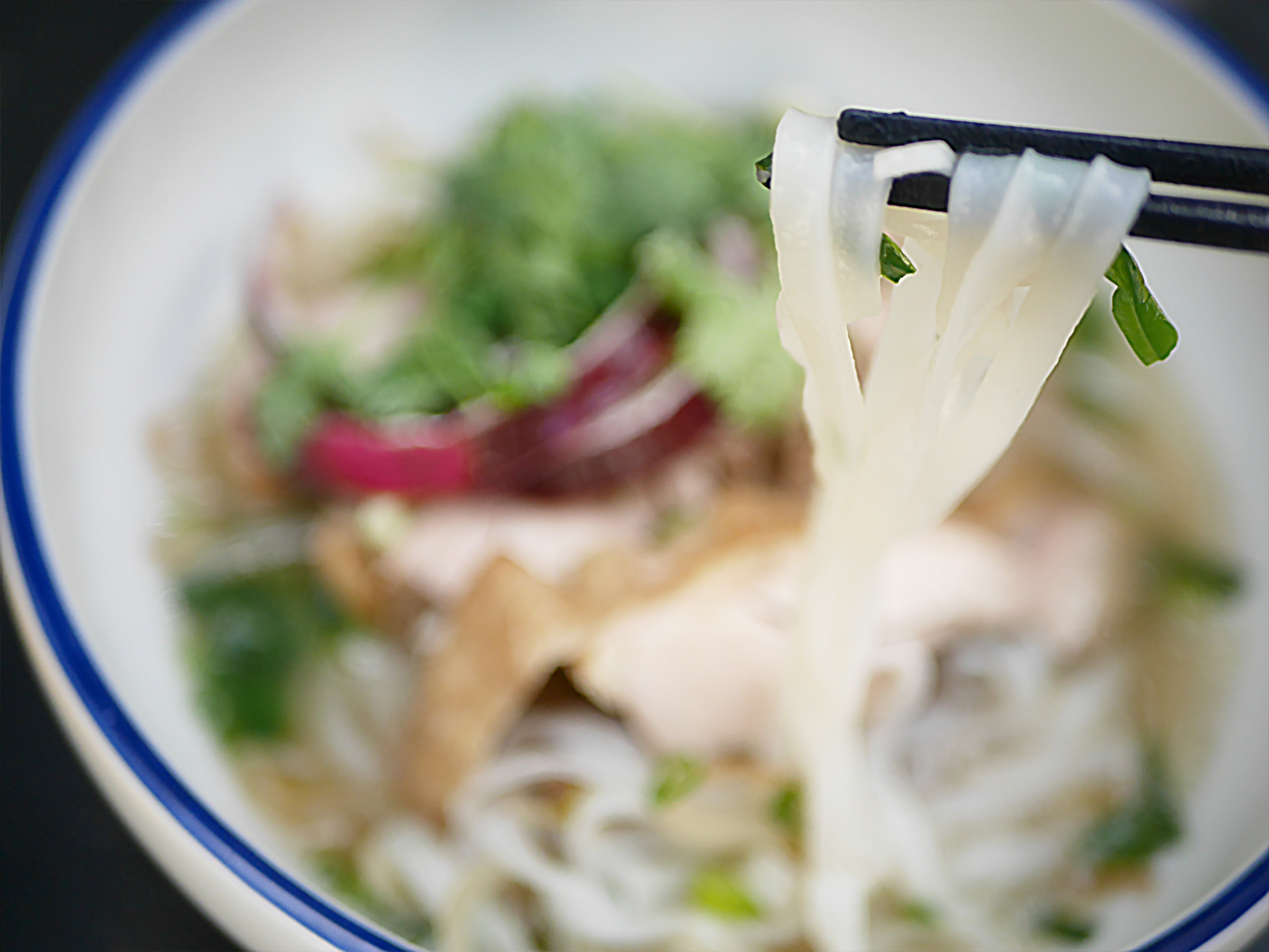 もっちりとしたライスヌードルにスープがよく絡み、添えられた蒸し鶏の旨みと赤玉ねぎやパクチーの香りが爽やかに引き締めます。優しい味わいの中にコクと風味が感じられ、食べる手が止まりません。
