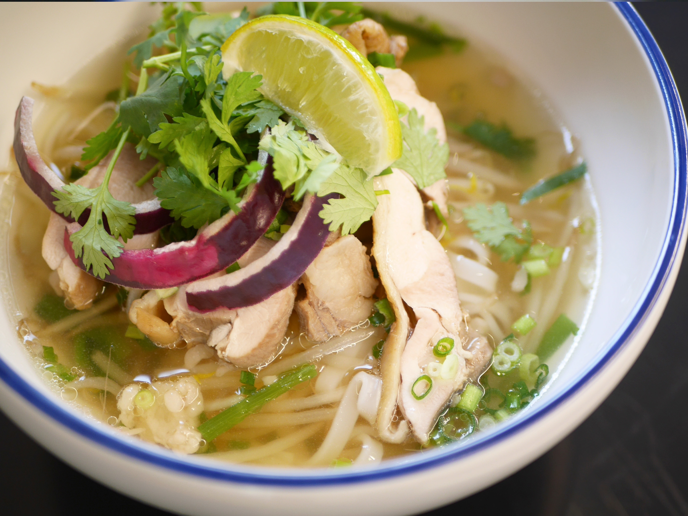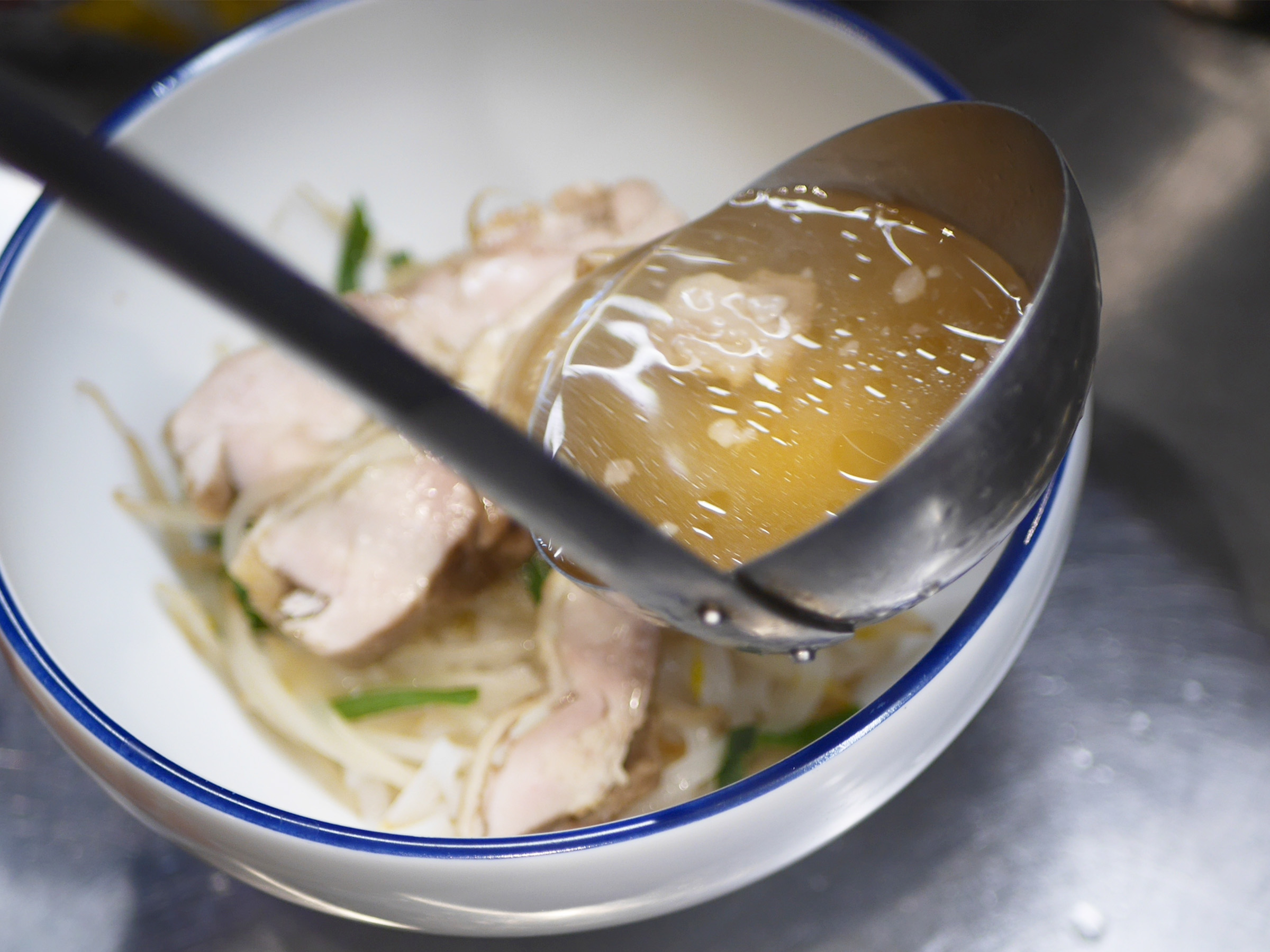 湯気とともに立ちのぼる、肉の香ばしいスープの香り。澄んだスープには、もっちりとしたライスヌードルとやわらかな蒸し鶏。赤玉ねぎやパクチーが彩りを添え、見た目にも華やかです。