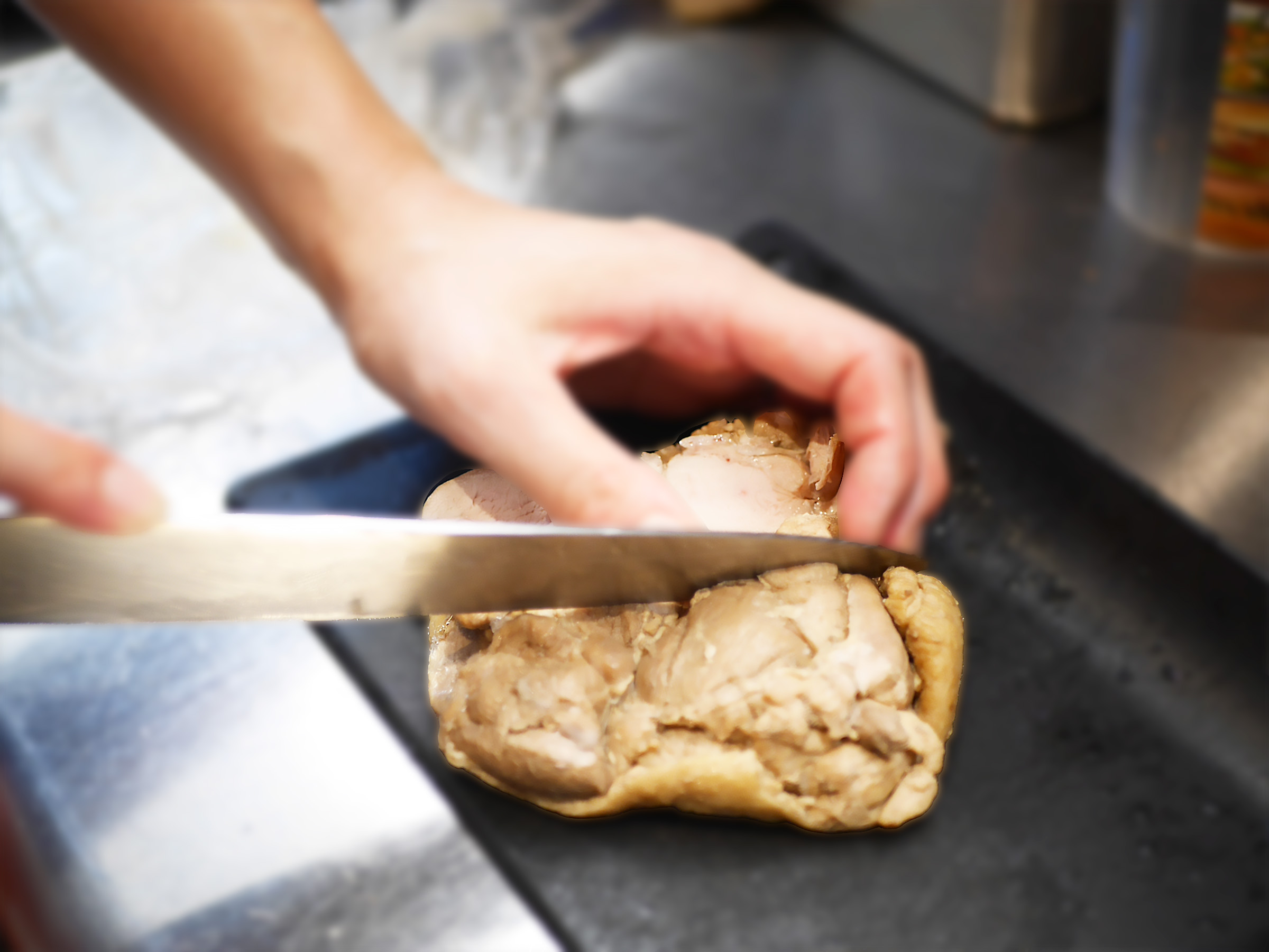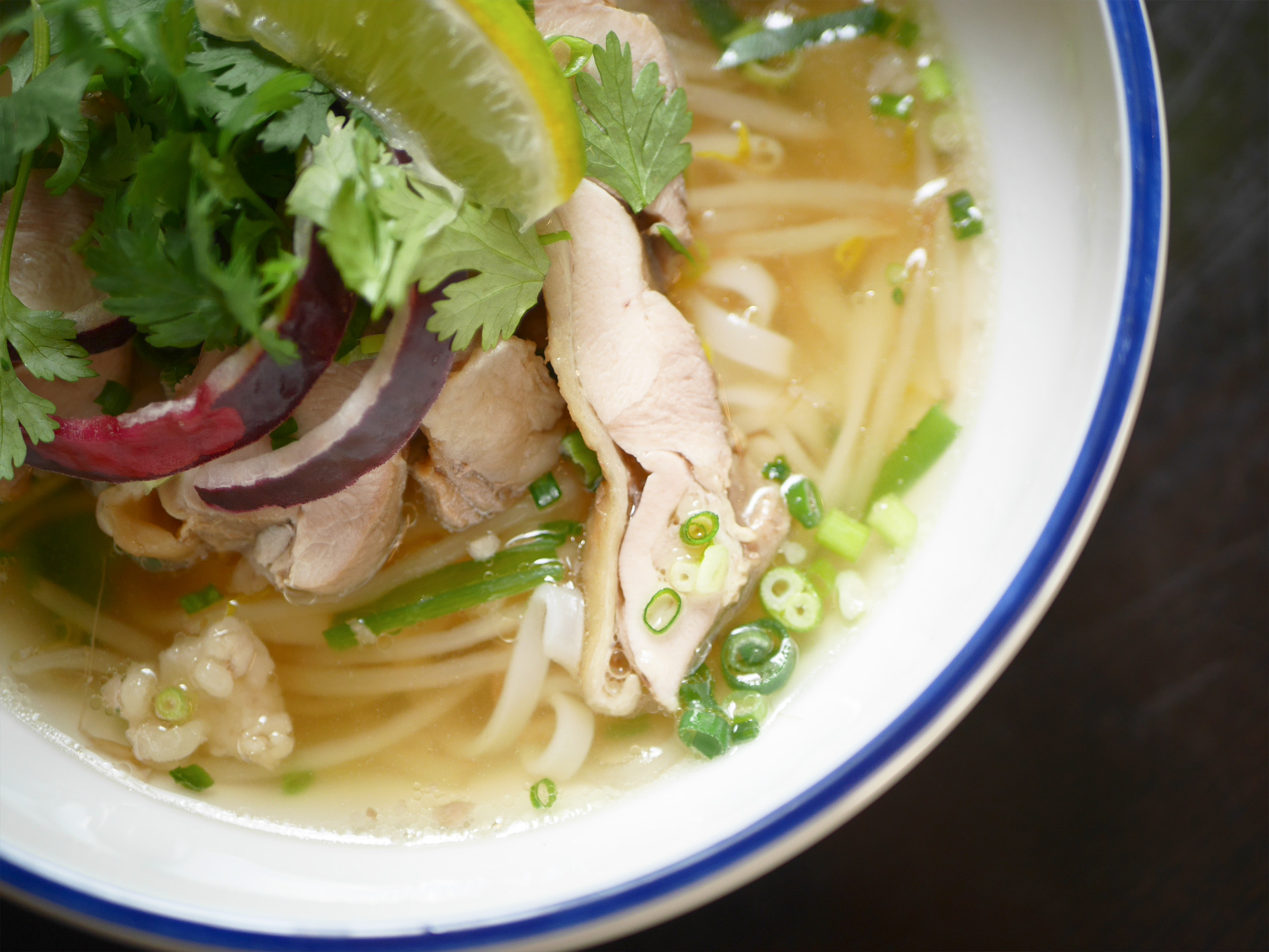 具材の大きな蒸し鶏もこのフォーの魅力。絶品スープの 出汁を贅沢に使い、香味野菜と、鳥もも肉を弱火でじっくり蒸し煮。旨みとぷりぷり食感が抜群です。