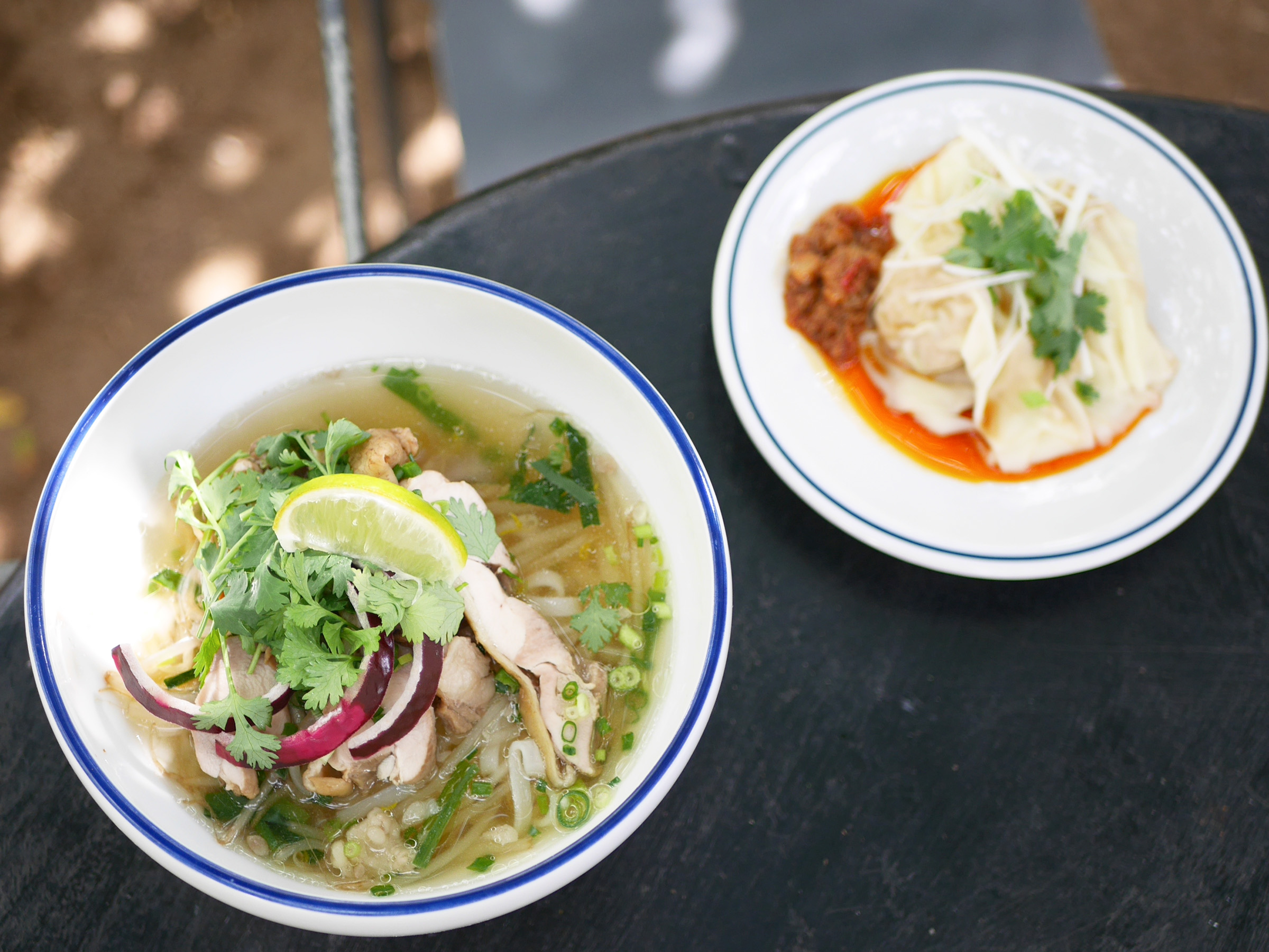 祥子さんは「手作りの味を届けたい」と、すべての料理を自ら手がけています。さっぱりとしながらもコクのある「牛すじと鶏肉のフォー」と、香ばしい「皿ワンタン自家製ラー油添え」。どちらも女性や年配の方でもぺろっと食べられる満足感のある組み合わせです。