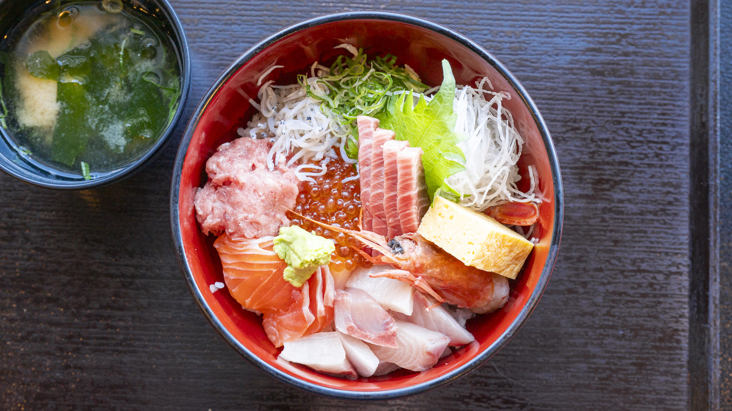 この食堂でぜひ食べていただきたいのは、マグロ、イクラ、赤えび、地魚、シラスが載った、色鮮やかな「三崎市場の特選海鮮丼」(2,200円)です。この食堂の一番人気!