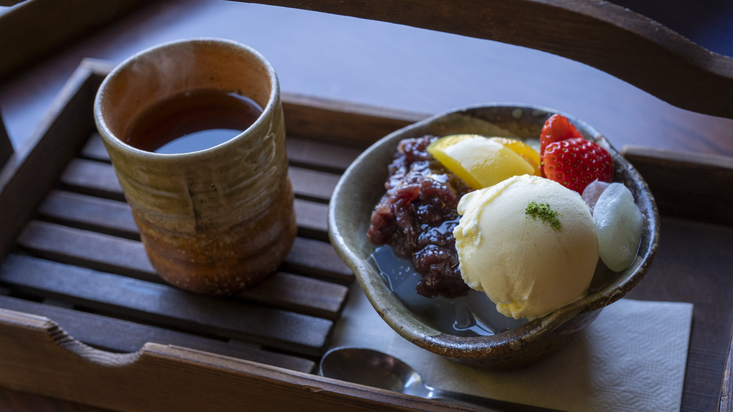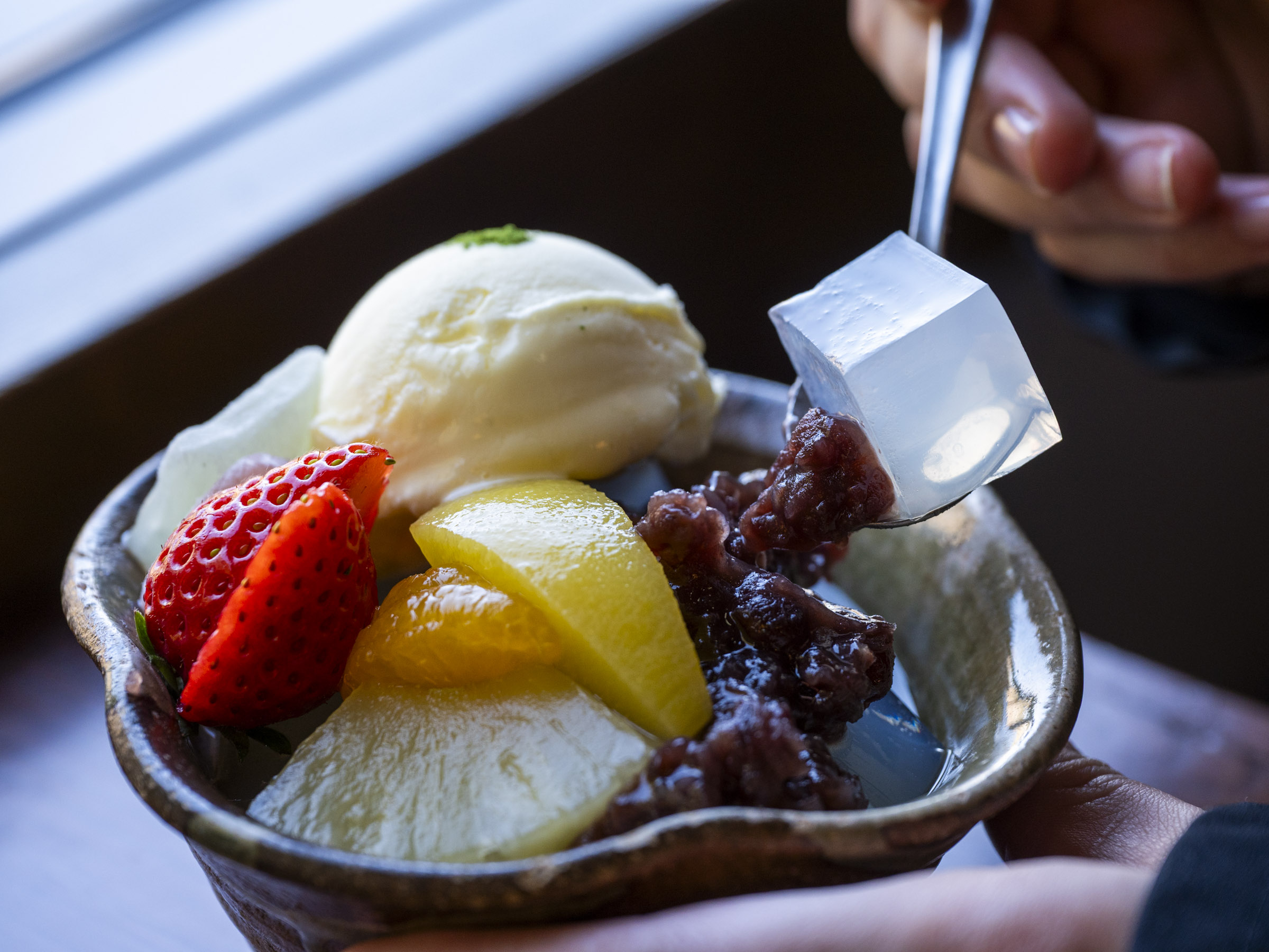 注目すべきは、あんみつにかかせない寒天。透明感のある寒天は、葉山産の天草から手作りされており、程よい弾力を感じられます。添えられる季節の果物や自家製の白蜜との相性も抜群です。