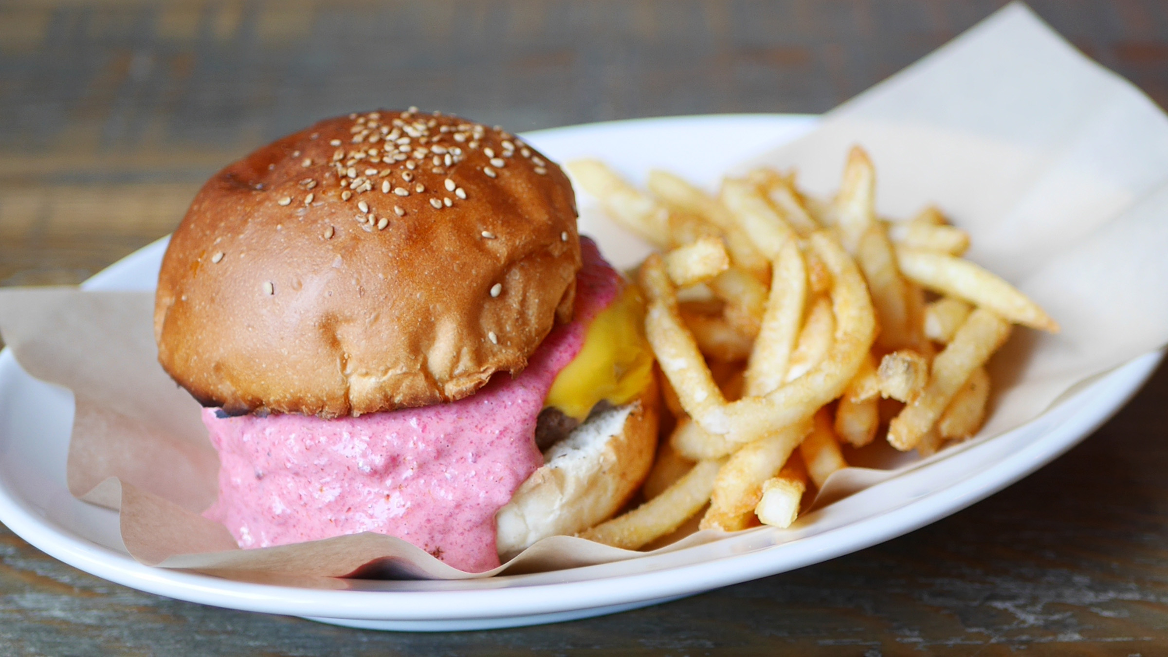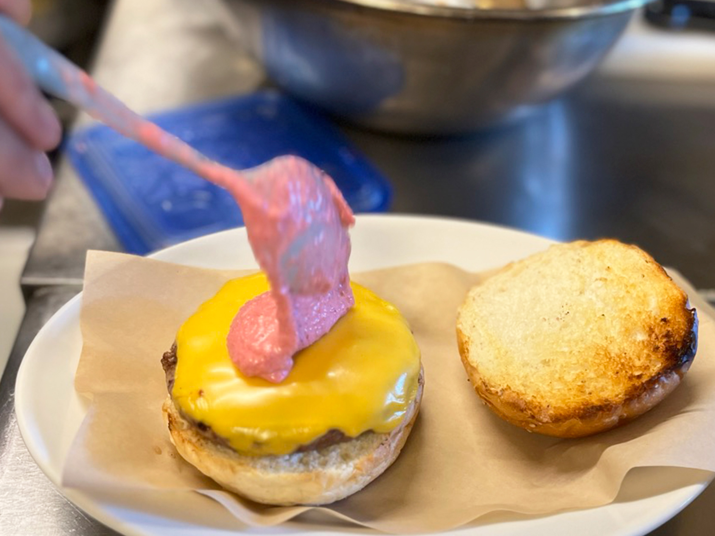 鮮やかなビーツのピンク、自家製ソースが特徴の人気メニュー「サニーサイドバーガー(2200円税込)」。驚くのは、ローストしたビーツの甘みと酸味が重なり、超粗挽きのビーフパティがさっぱりと感じられ、絶妙にマッチします。