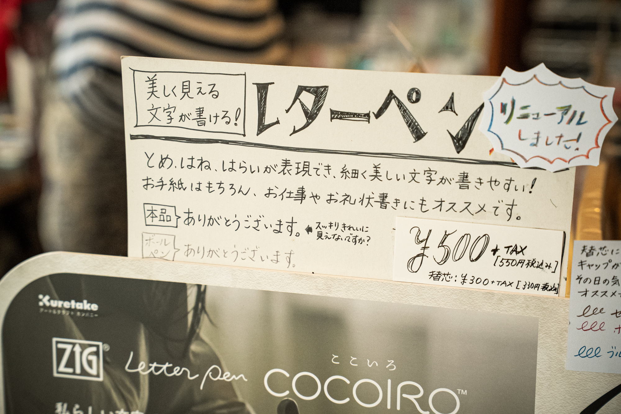 最近の売れ筋をスタッフの柴田久美さんに伺うと、「レターペンが人気です」とのこと。とめ・はね・はらいが表現できる美しく見える文字が書けるペンで、お手紙やお礼状におすすめだとか。実際に試し書きしてみると、たしかに文字が綺麗に見える気がする!