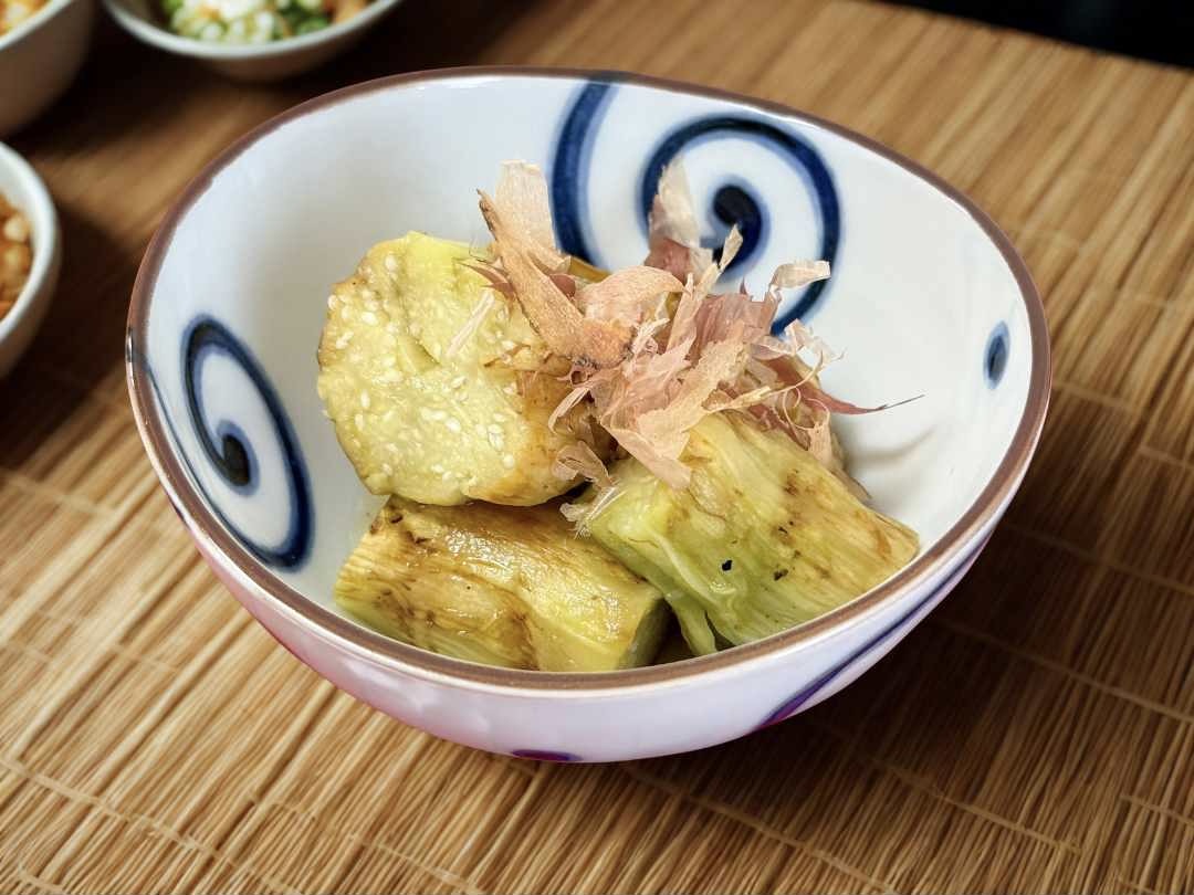焼き上がり、皮を剥くと翡翠色の美しいナスが完成。