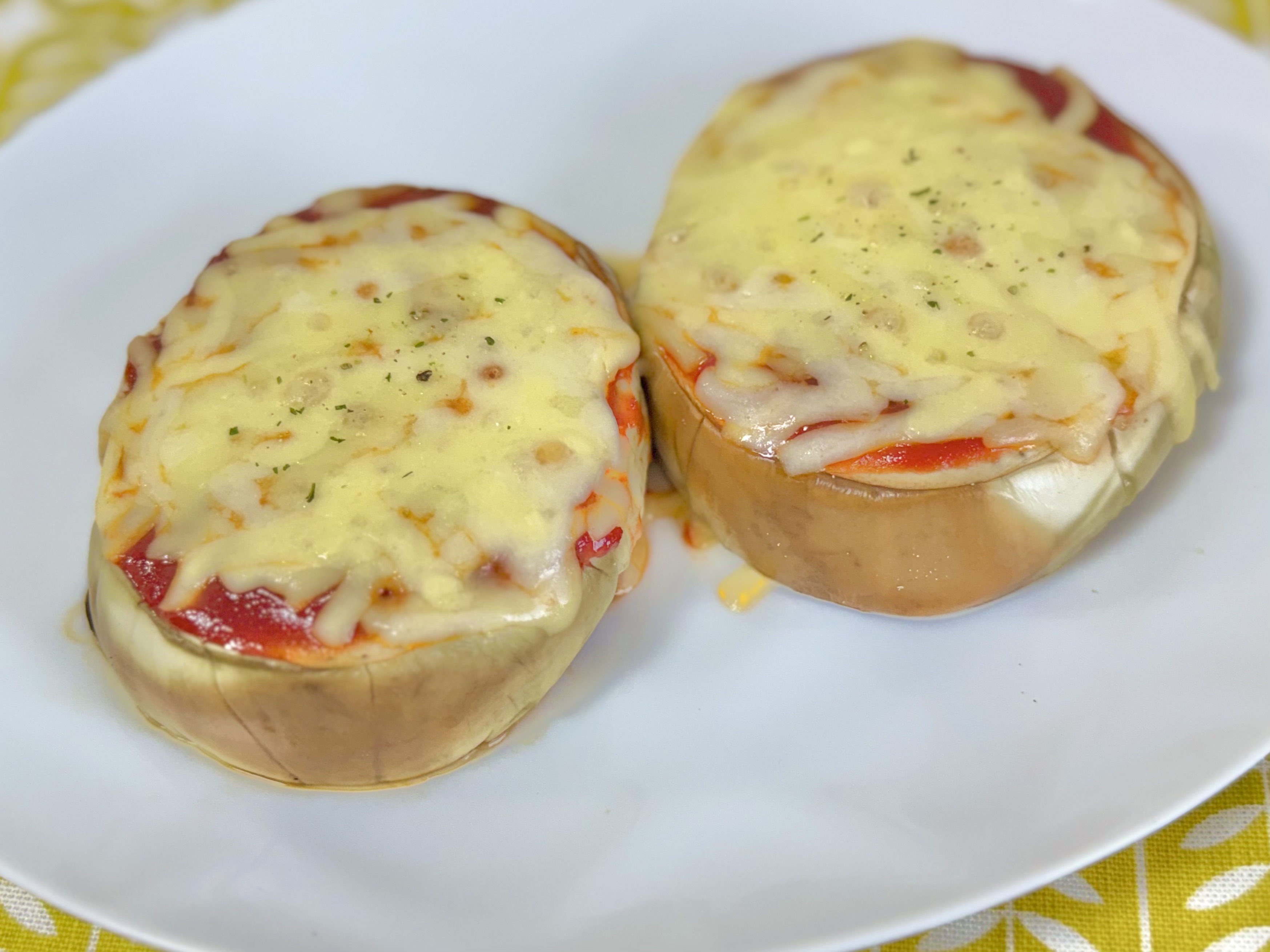 輪切りにした白ナスにケチャップを塗り、とろけるチーズをのせて焼くだけ。