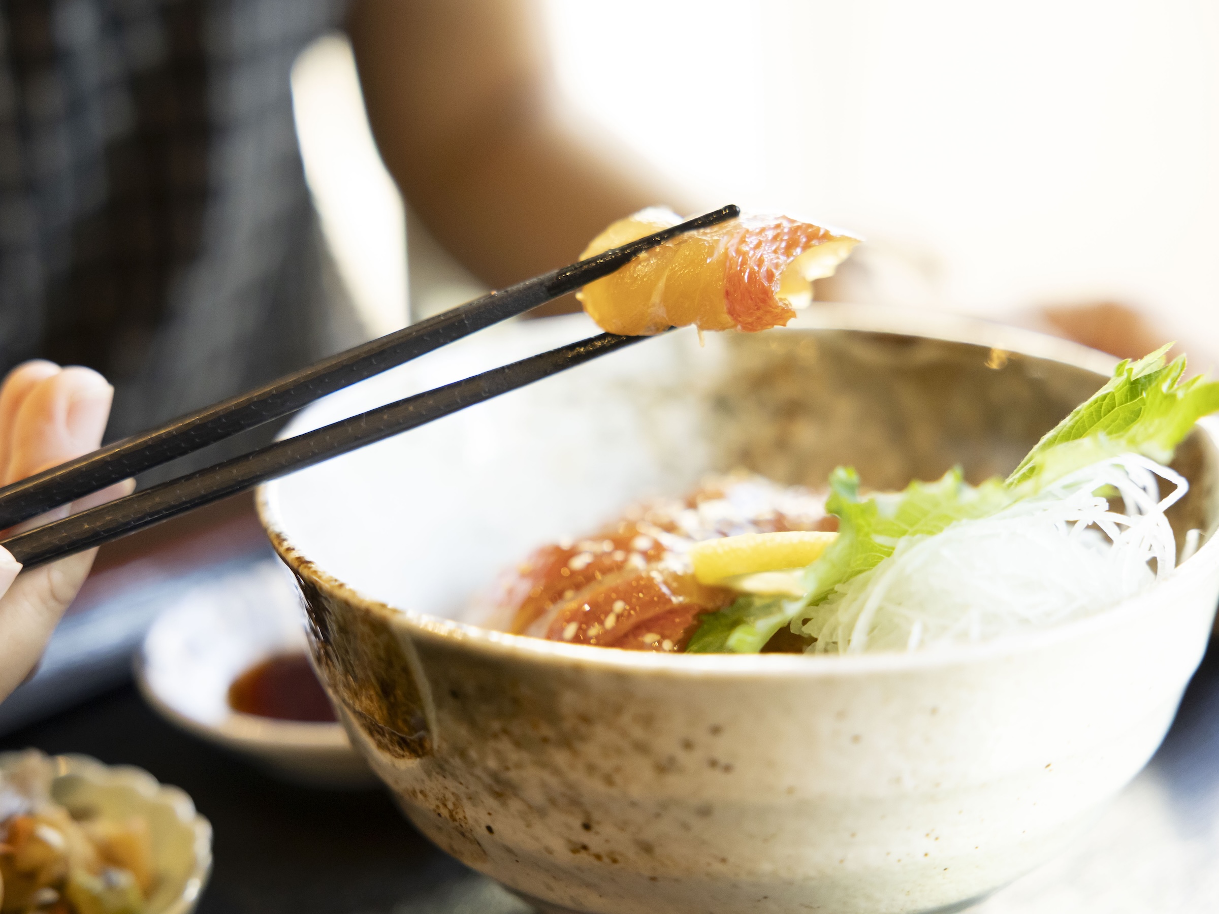 「漬け丼の刺身は三枚におろした後、皮部分だけを湯引きしています。すると、やわらかくふっくらした白身、栄養たっぷりな皮、そして身と皮の間に詰まっている脂の甘みまで、金目鯛を余すところなく堪能できます」