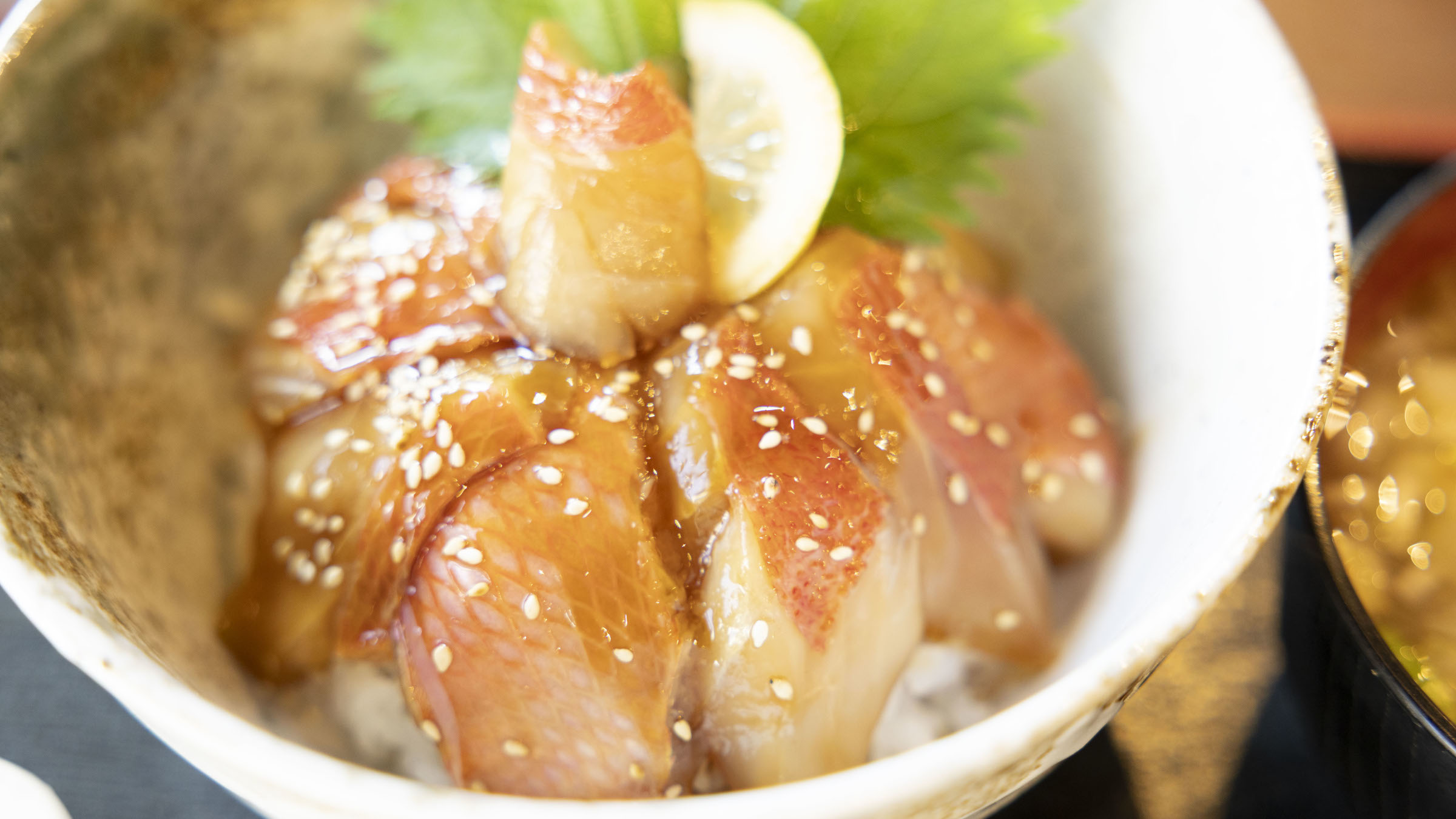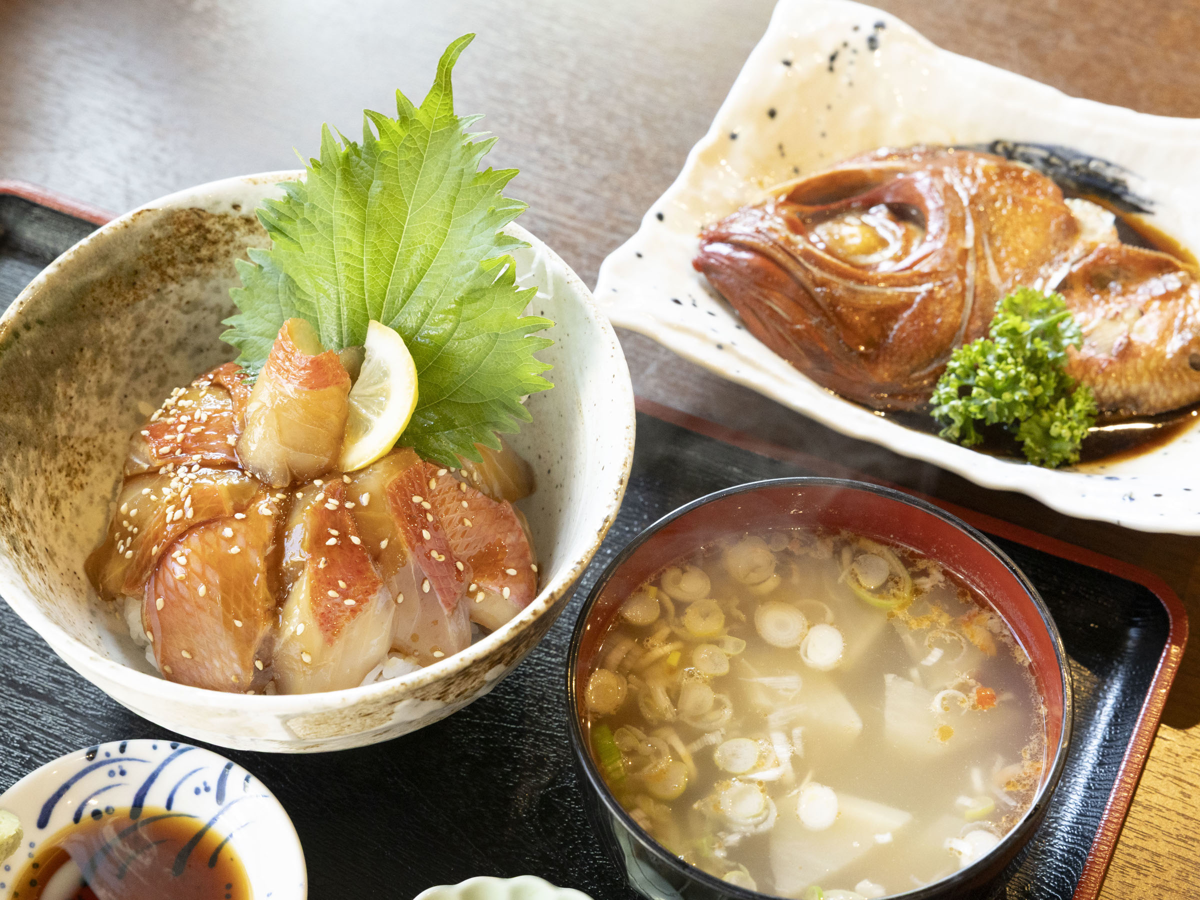 漬け丼には三浦野菜を使ったお手製の漬物、塩だけで調えた金目鯛のあら汁、そしてカマの煮付けが添えられ、よりいっそう一膳を豪華に彩ります。