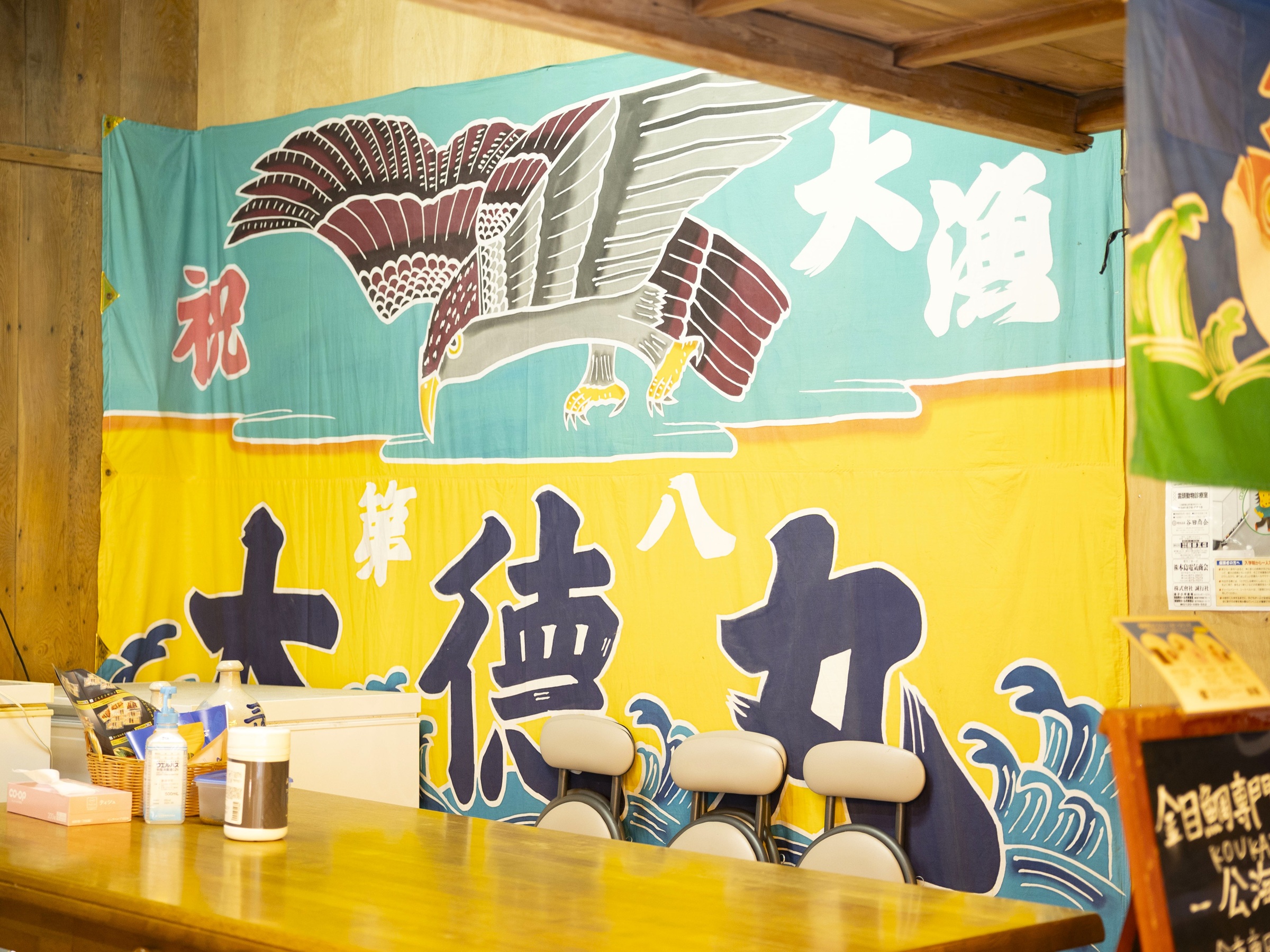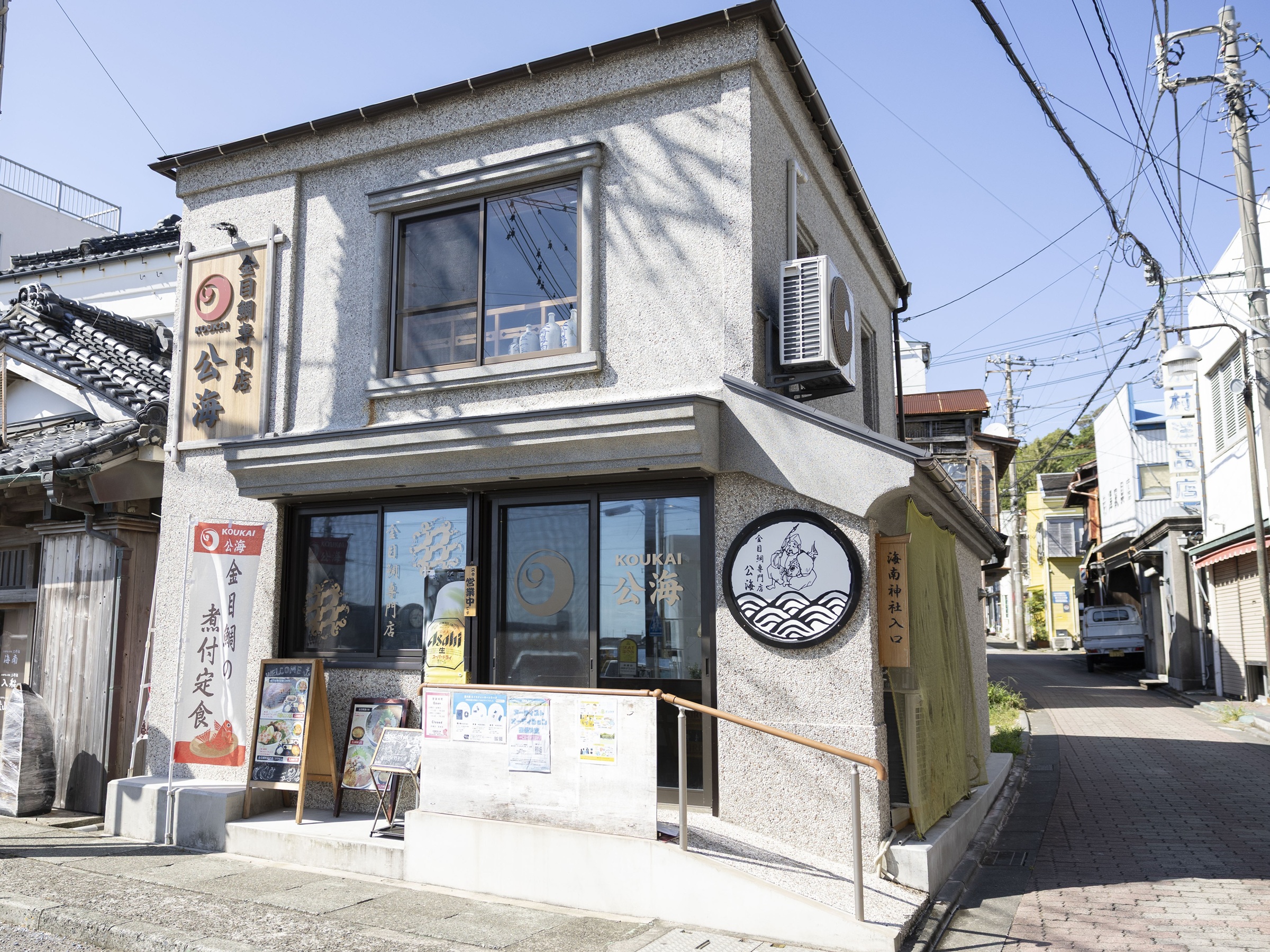 三崎商店街の海南神社入口に店を構える金目鯛専門店「公海」2号店。ここでは、専用漁船第八大徳丸が捕る金目鯛をさまざまな料理で楽しむことができます。