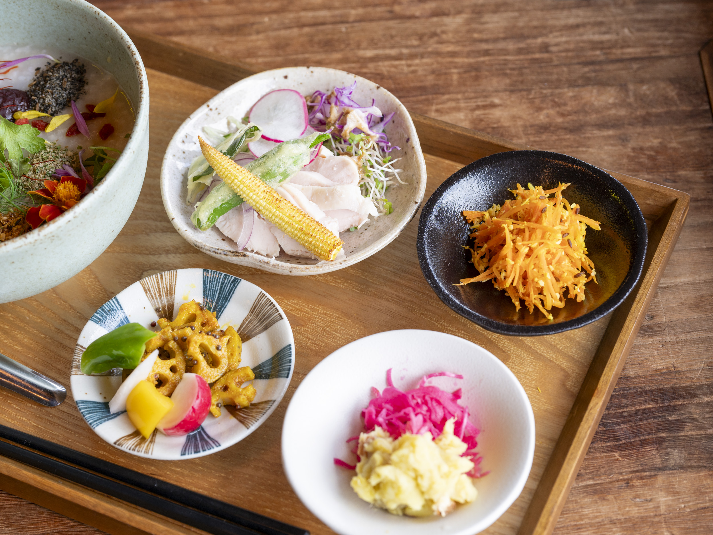 人気の「中華粥セット」は、季節野菜とスパイスを組み合わせた彩り豊かな一皿で、小皿4品と合わせて味わいの深さが楽しめます。