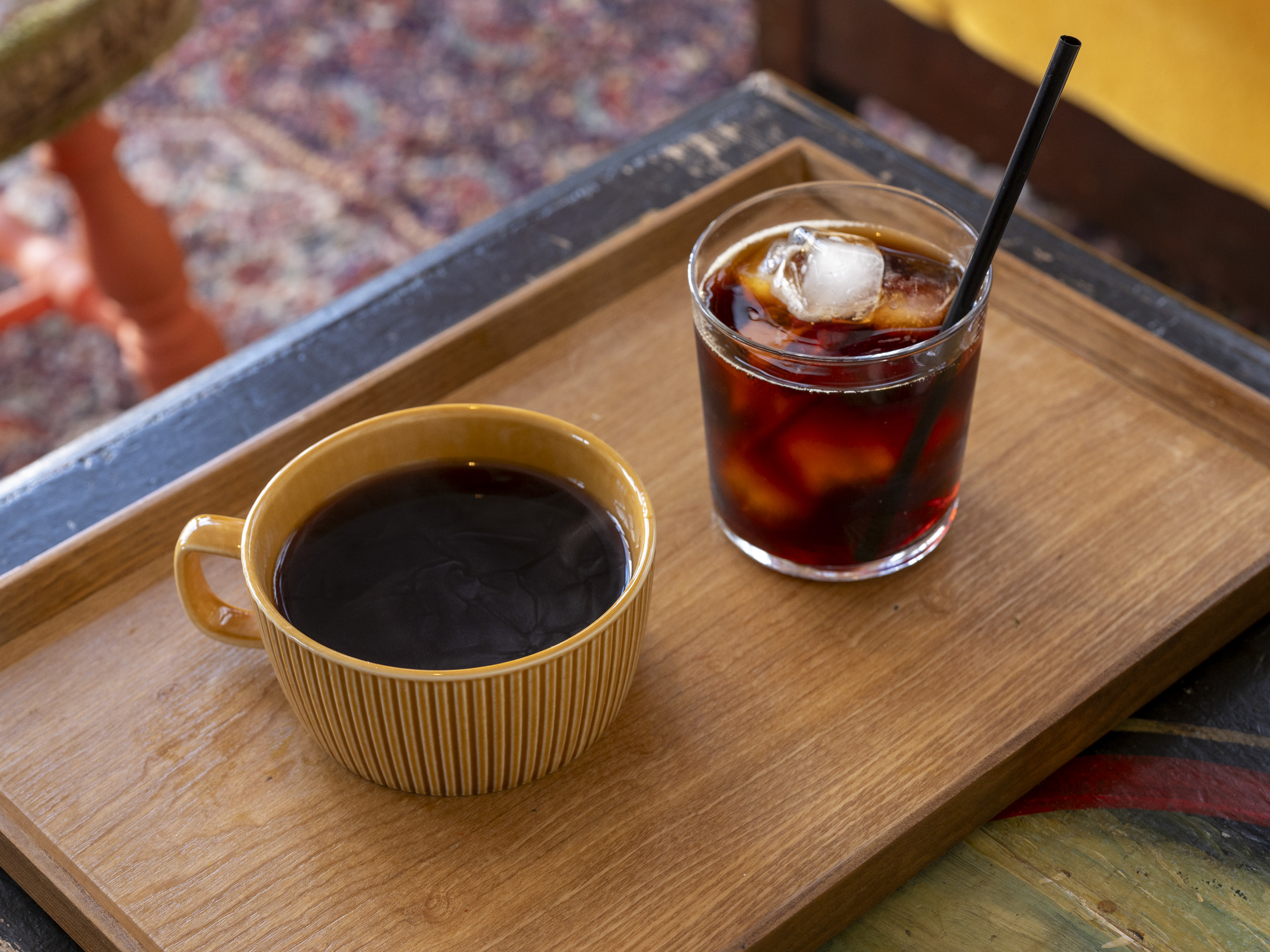 ちょっと珍しい背の低いカップで頂いたホットの「ハンドドリップコーヒー」(左・600円)と「コールドブリューコーヒー」(右・650円)は、程よい酸味とコクが共存しています。