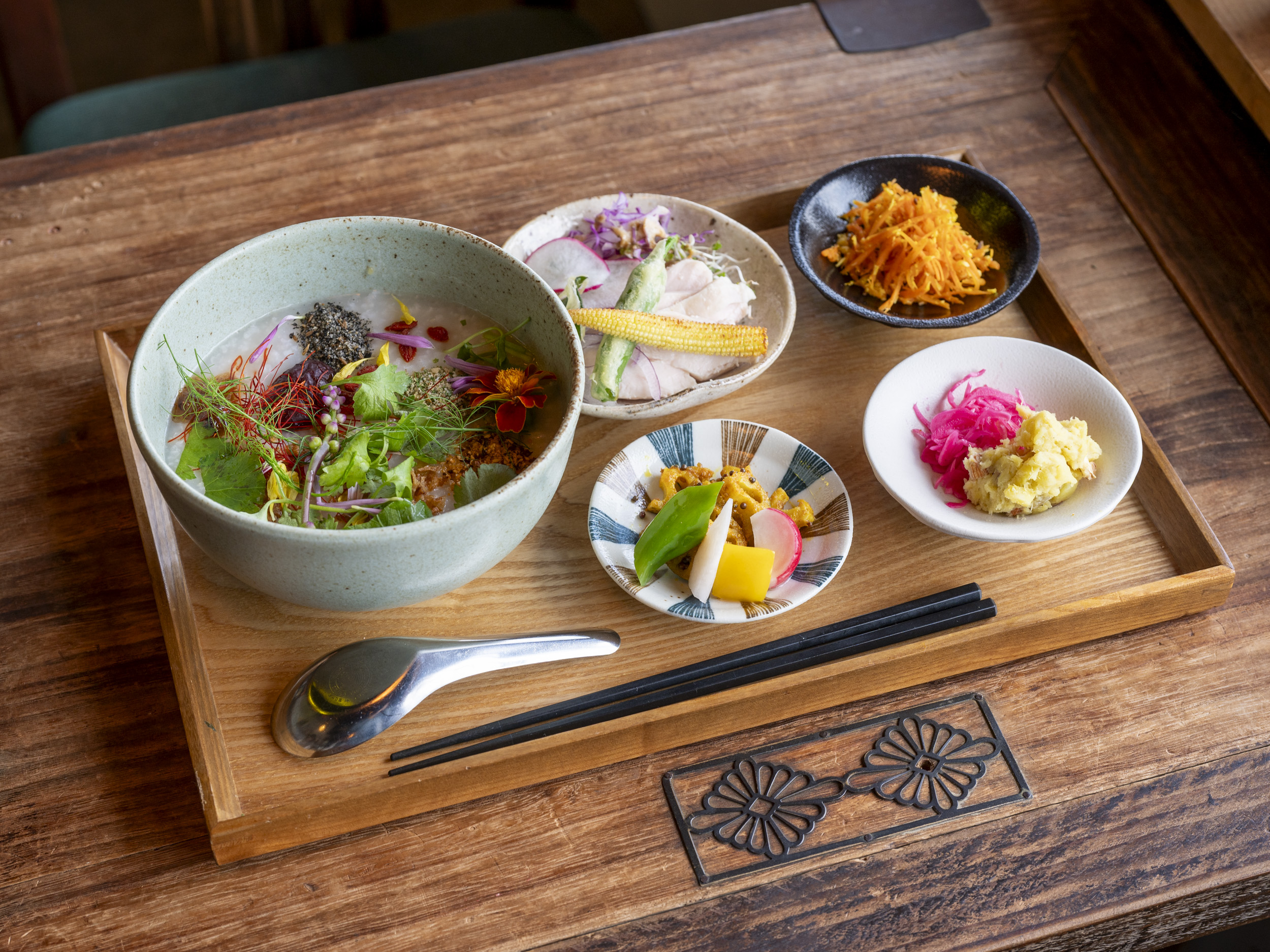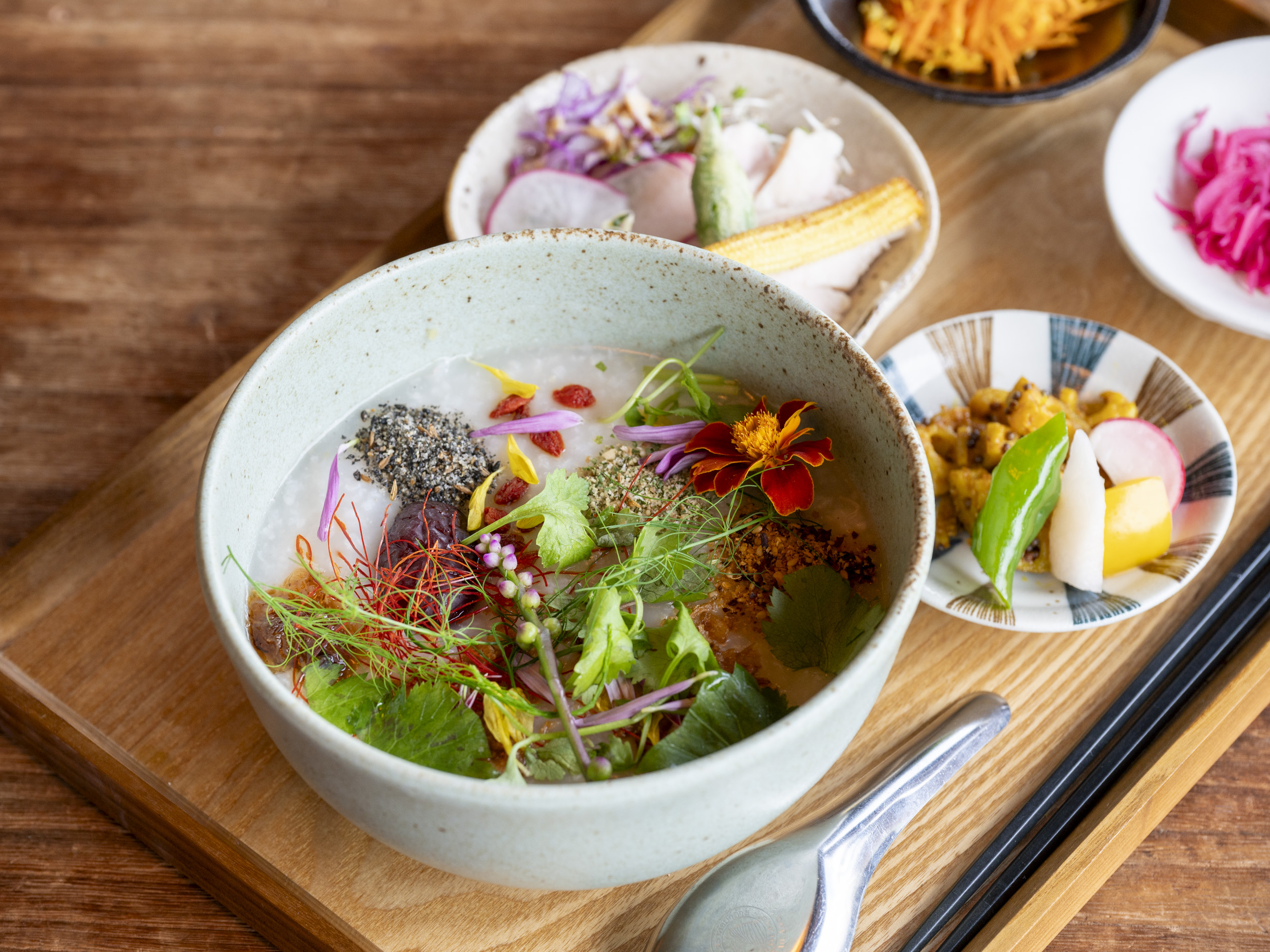 多くの鎌倉野菜と三浦野菜の上に3種のスパイスが盛られ、鶏ベースのお粥を彩っています。お粥にのっている粉は、ナッツやゴマ、塩などを混ぜ合わせたデュカという中東の複合スパイス。複雑な塩味と中華粥の相性が抜群でした。