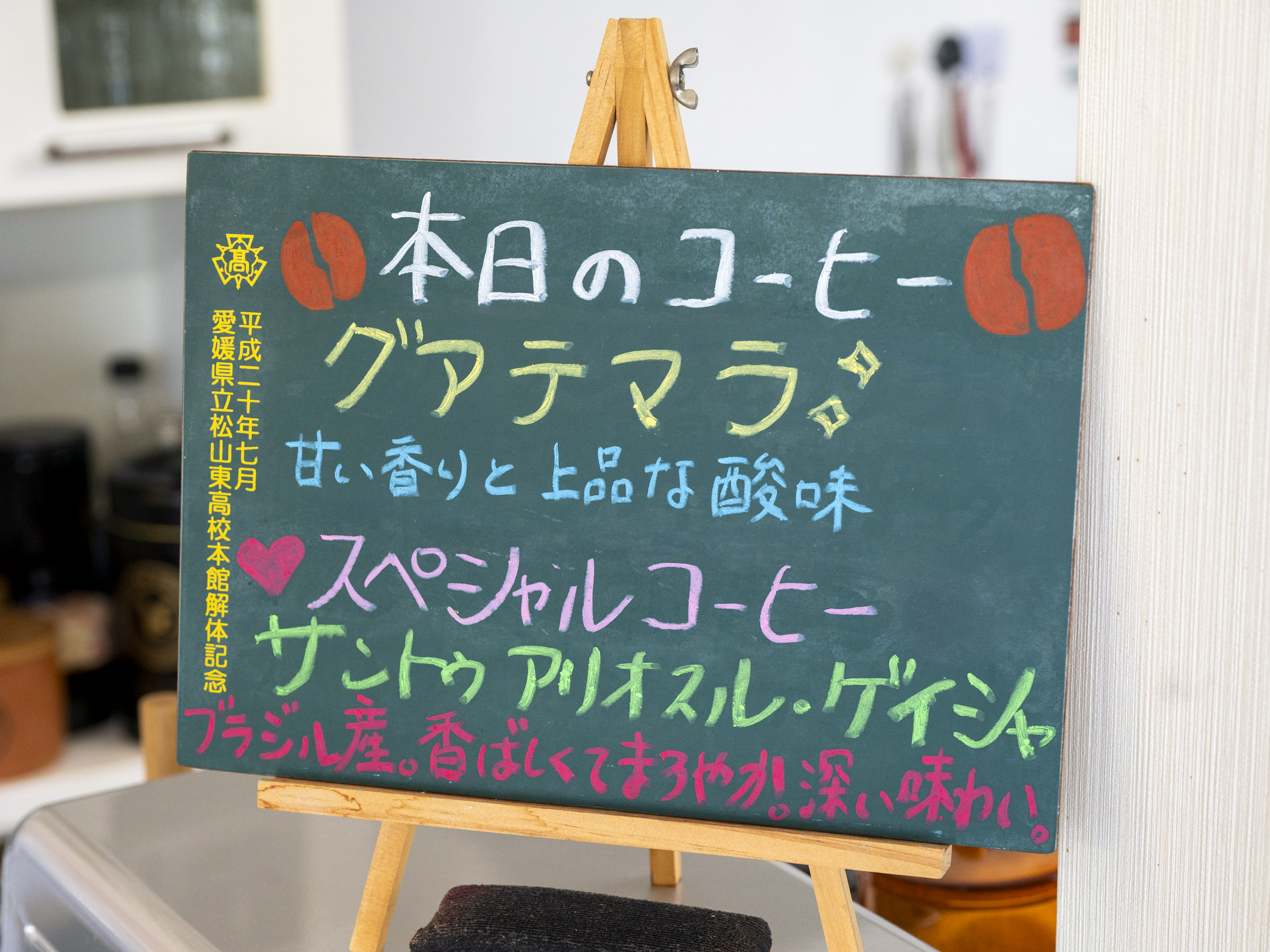 「うちはコーヒーが自慢なんです」と、ダンディな笑顔の名本さん。この日のコーヒーは「グアテマラ」でした。「ちょっと深めに焙煎して酸味はそんなに出ないようにしています」とこだわりを教えてくれます。