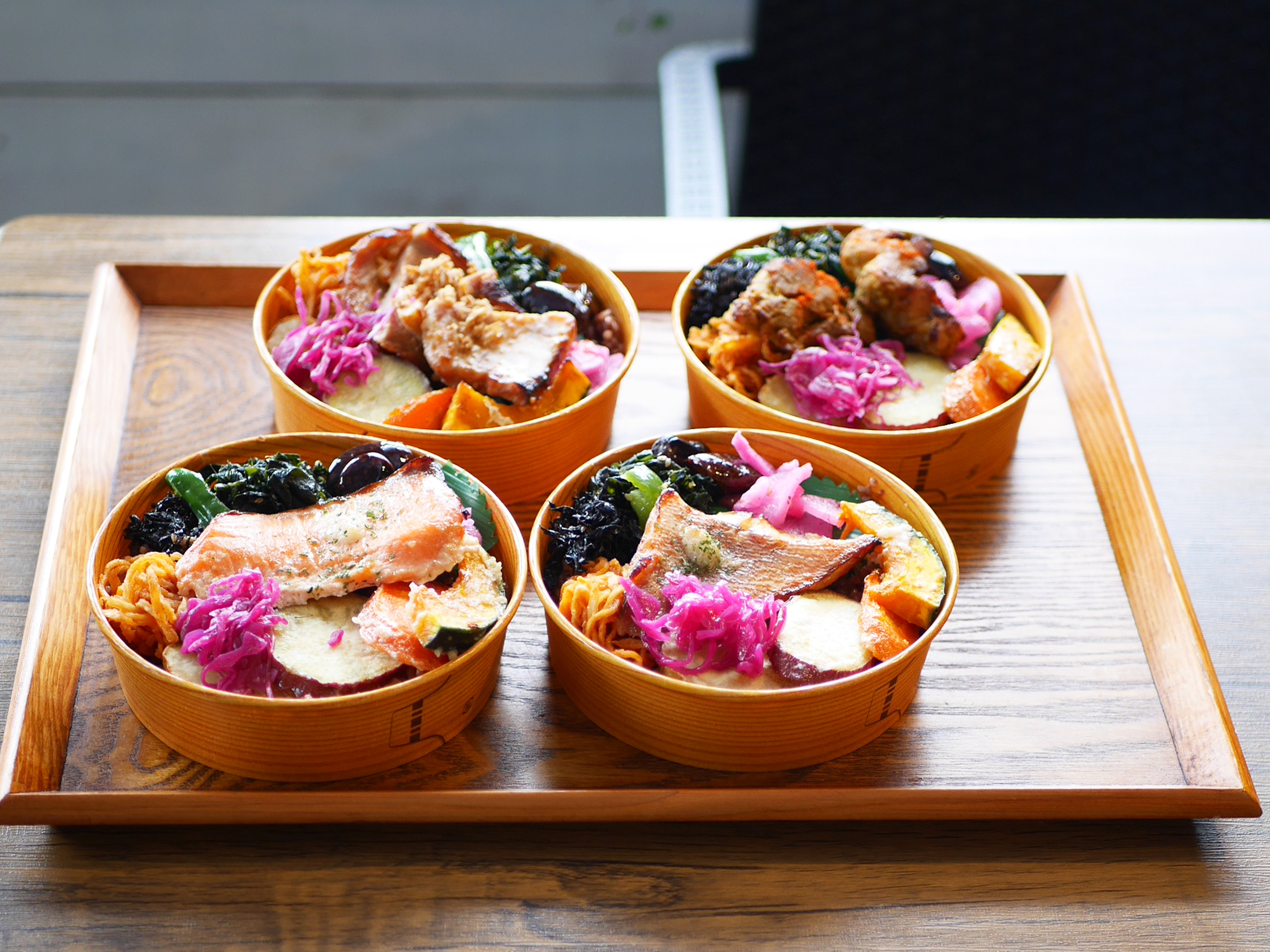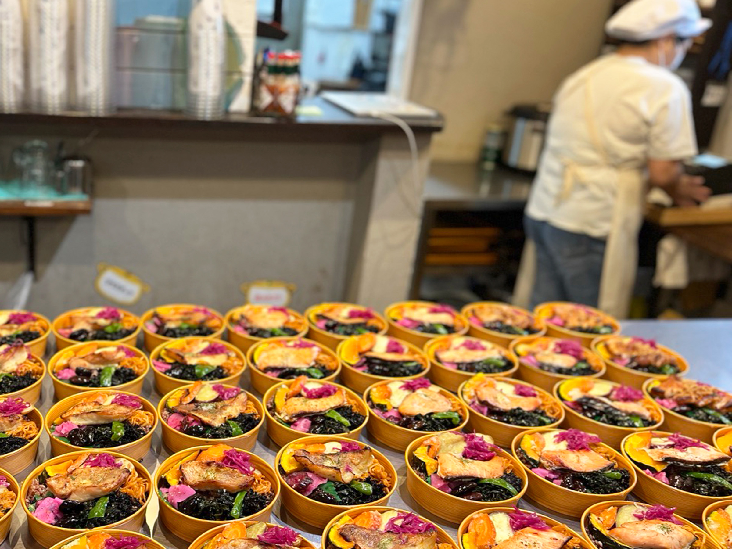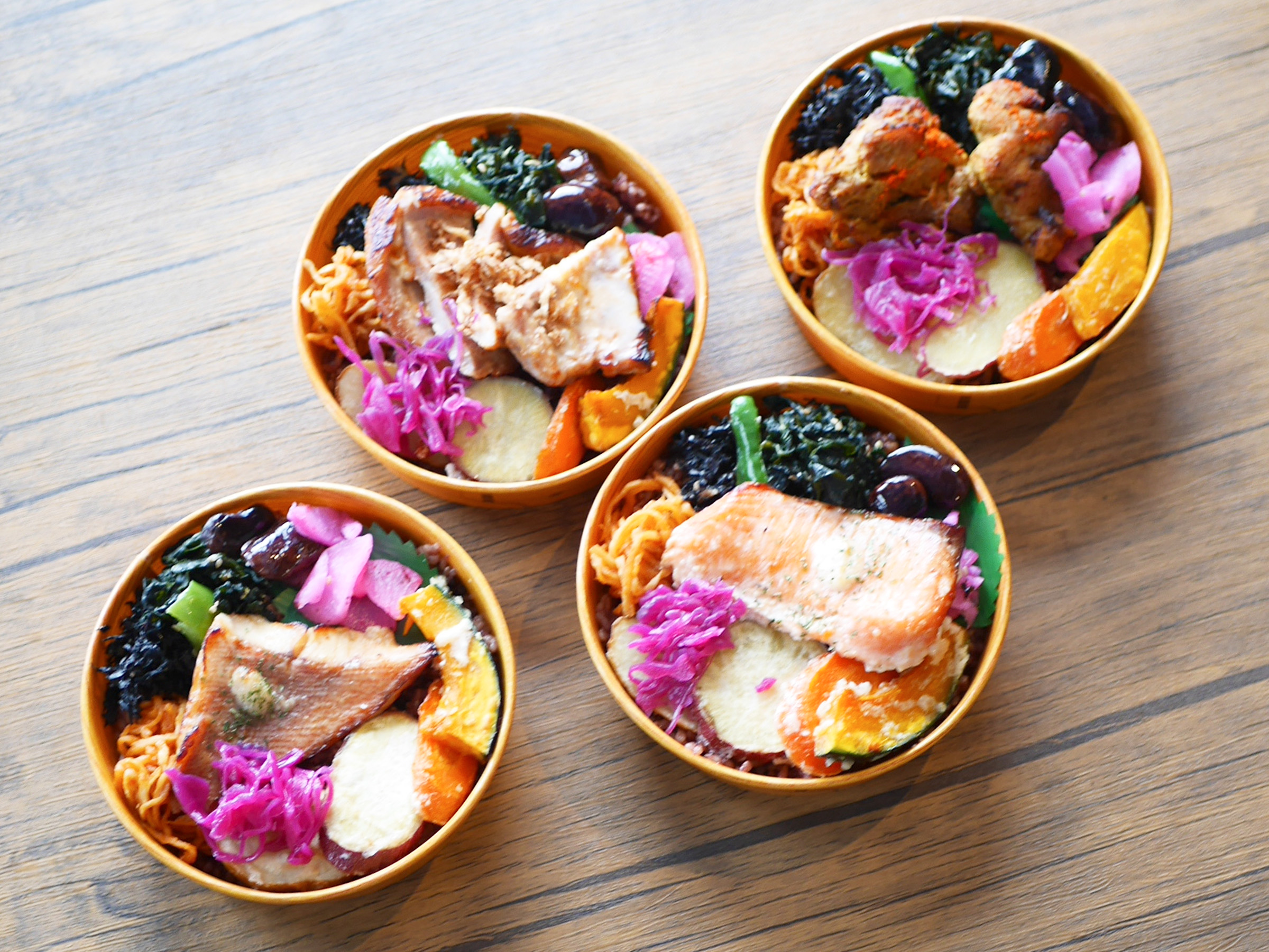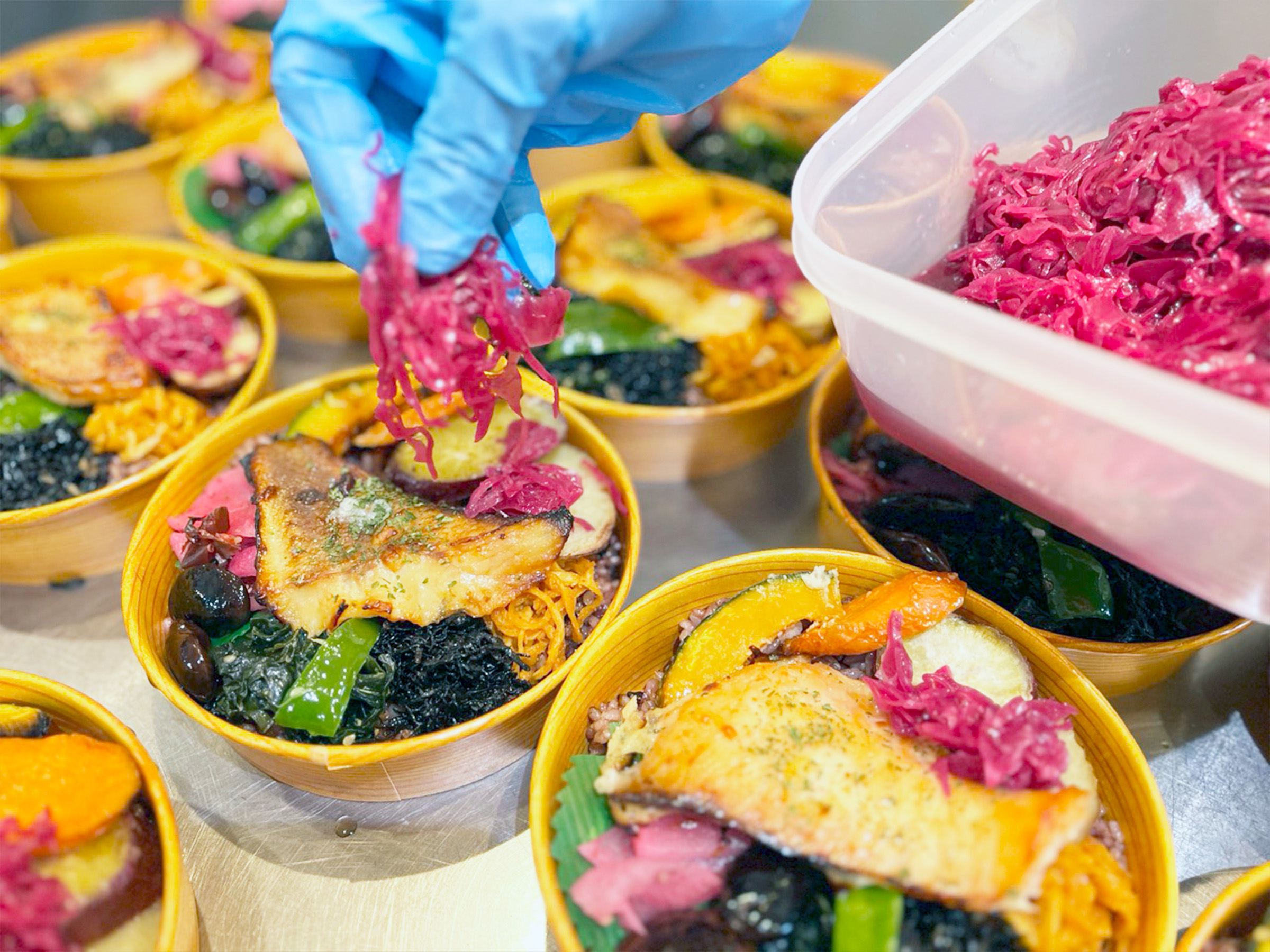 主菜は前日から漬け込むことで、食材が柔らかくなり、旨みが凝縮されます。ご飯は黒米と玄米のブレンド。副菜には、主に三浦半島産の野菜を塩麹で和えたものが使用されています。にんじんやカボチャ、紫キャベツの酢漬けに、ひじきやわかめ。和の味に偏らないよう、アラビアータの切干大根が添えられるなど、彩り豊かでバランスの良い内容がこだわりだといいます。