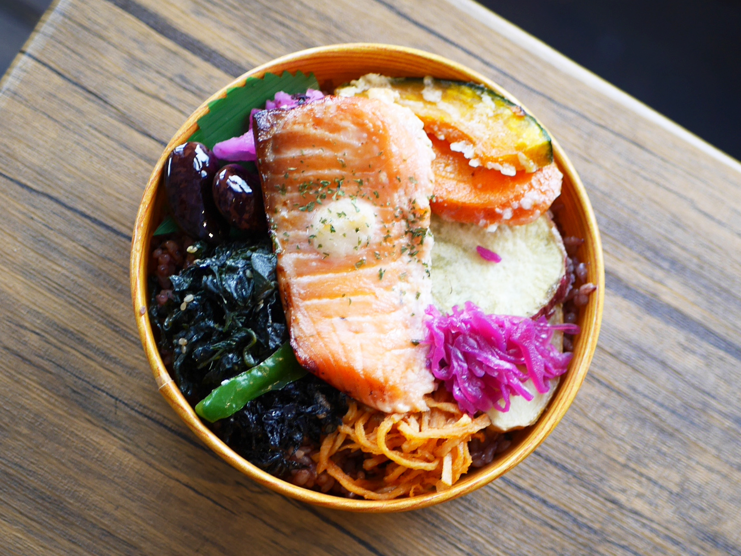 人気の「塩麹漬け鮭わっぱ弁当」は、塩麹の優しい塩味と、麹の甘み、さらに発酵の深い香りが鮭の旨味を高め、風味豊かな美味しさ。黒米入り玄米ご飯との相性も抜群で、噛むほど素材本来の味わいが広がり箸が進みます。